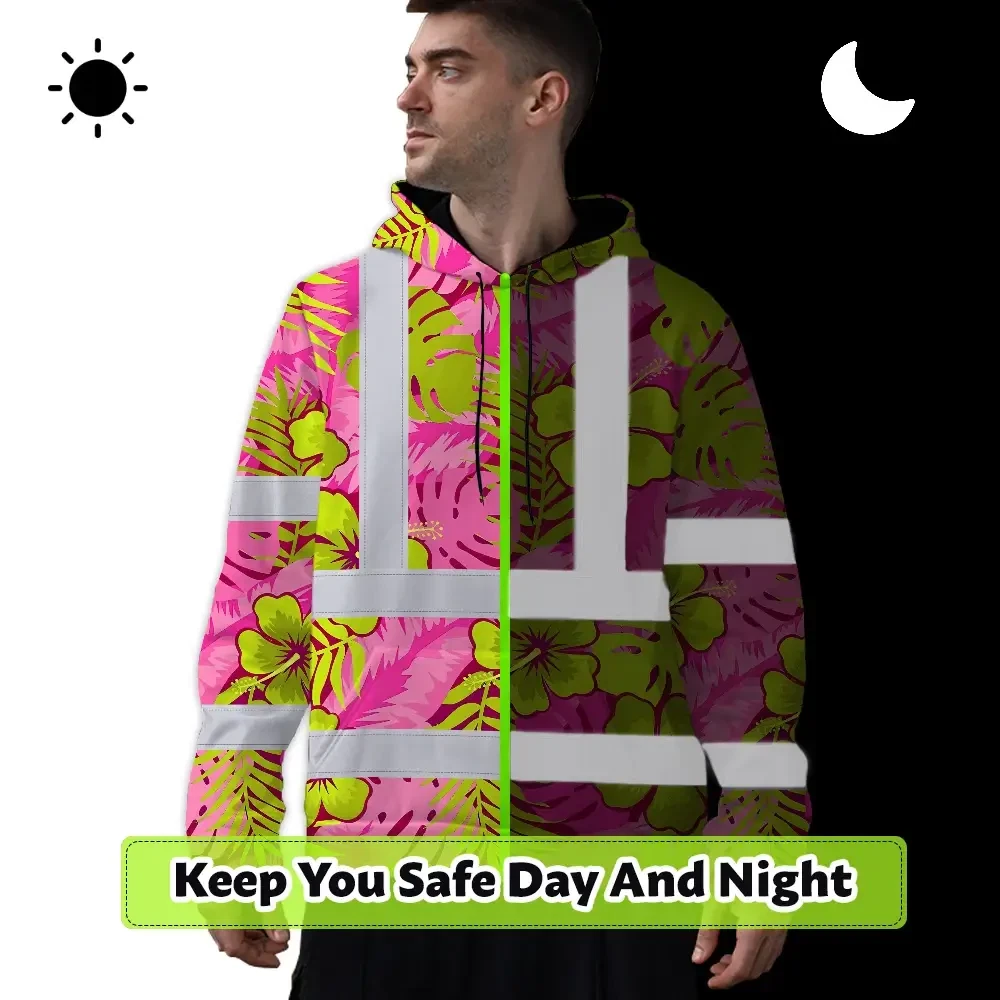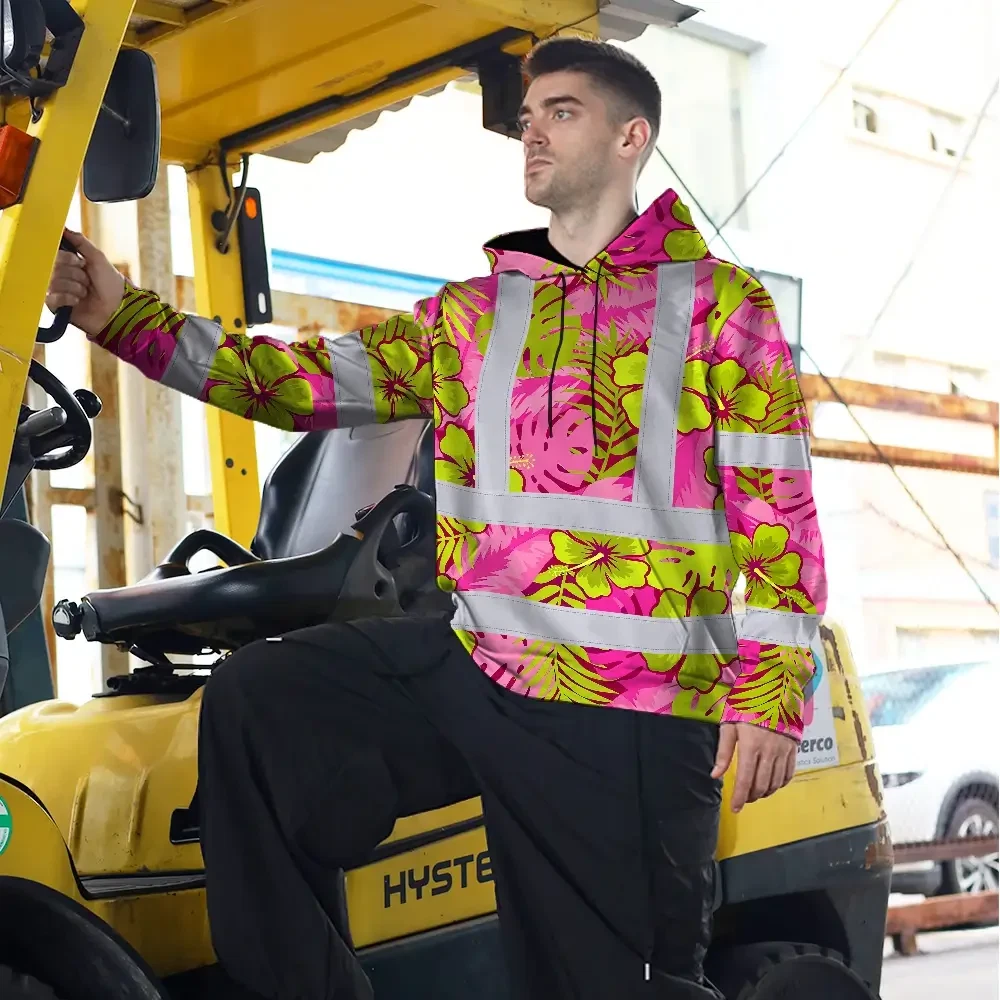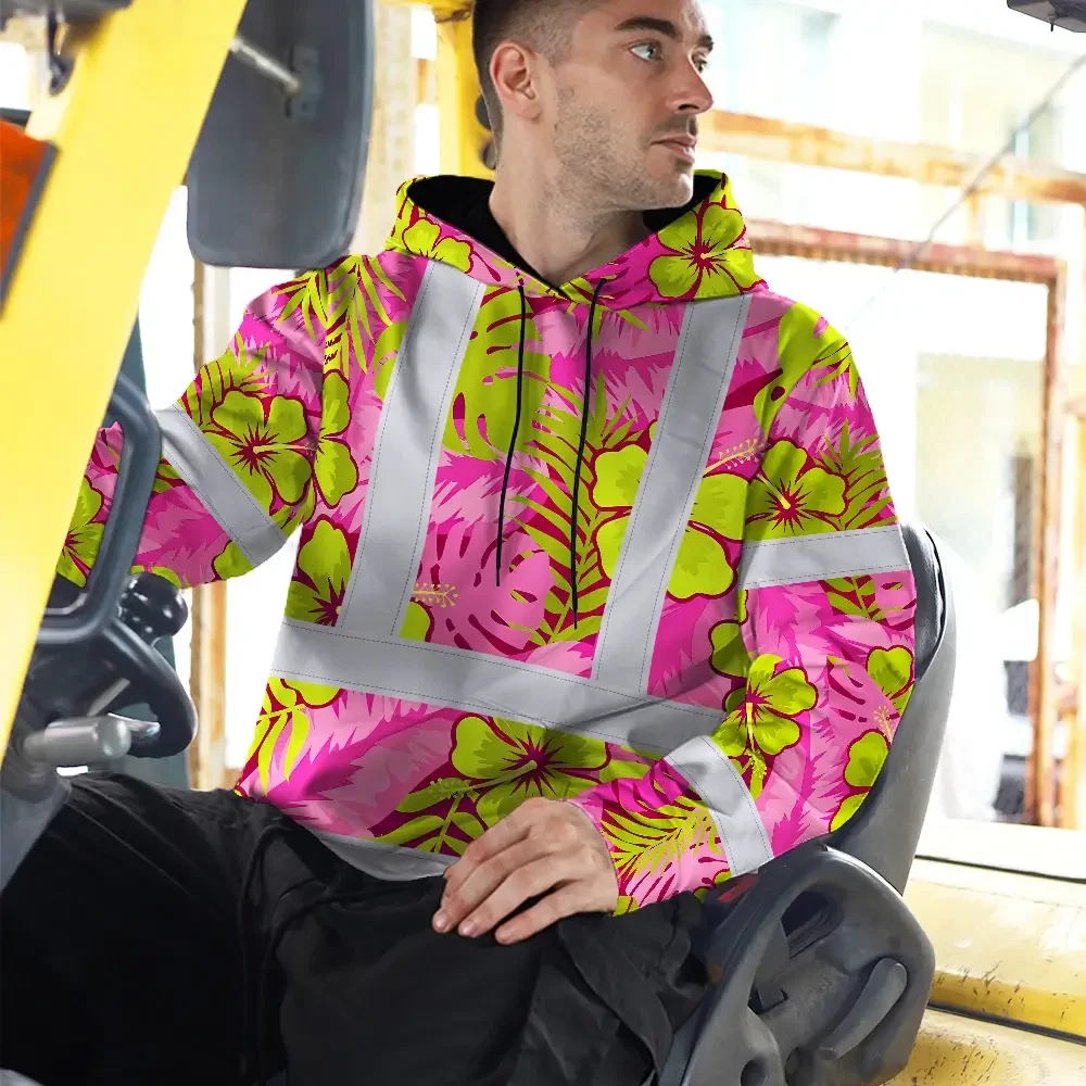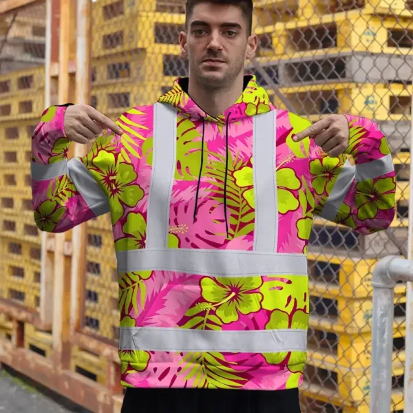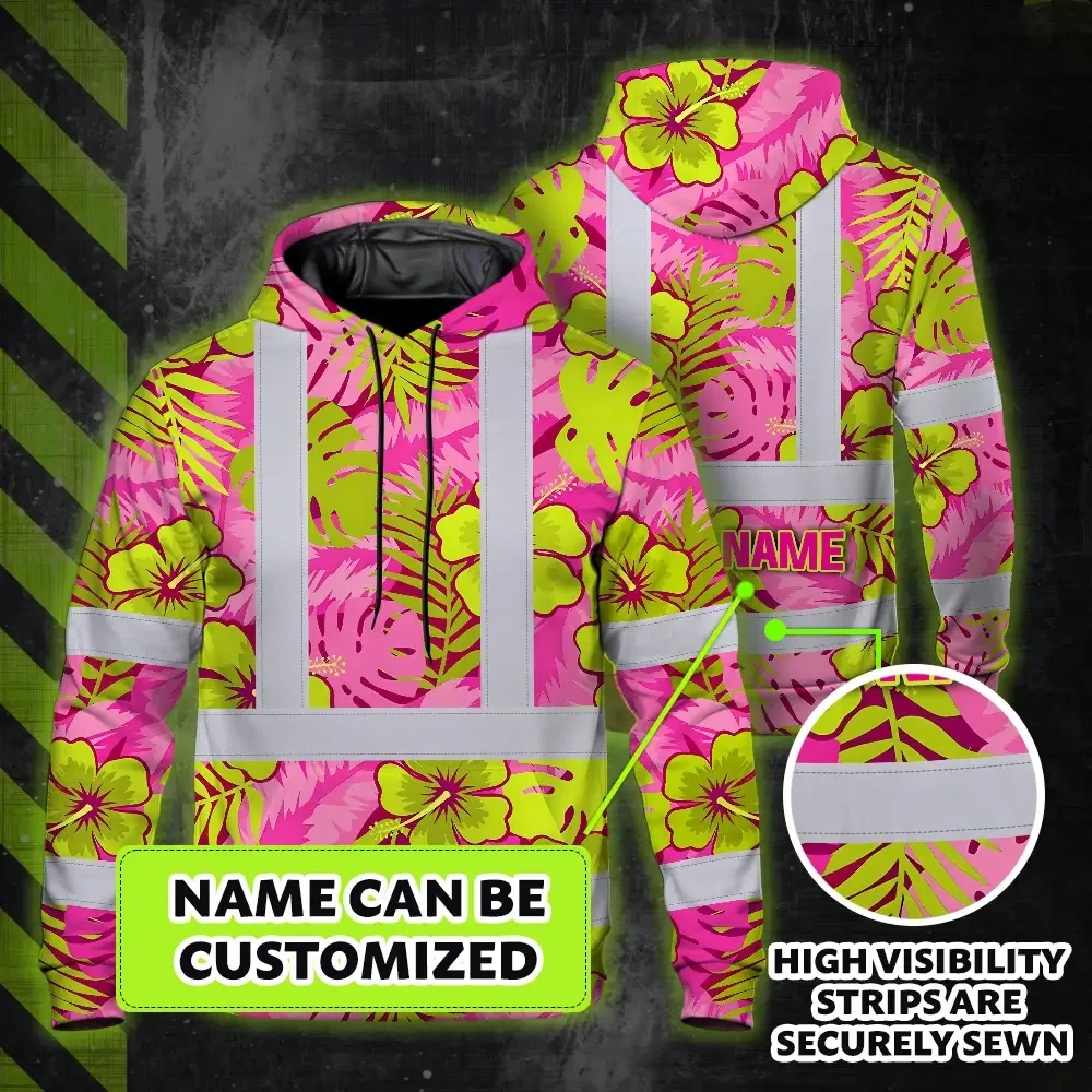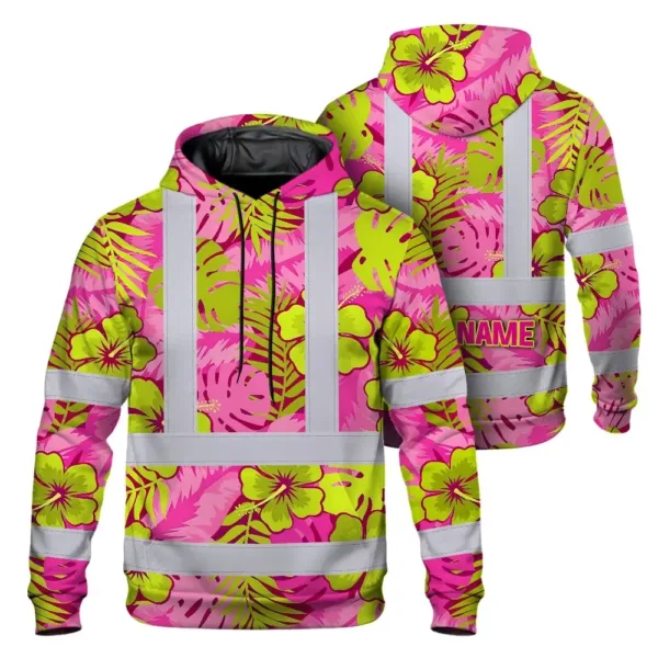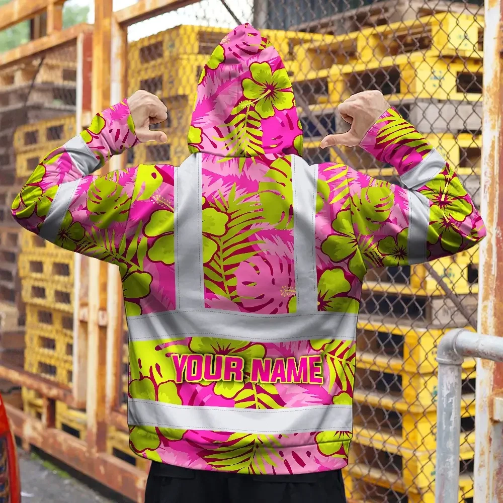 Hi Vis Hoodie Reflective Tapes Pink Neon And Lime Flowers Custom Name Safety Workwear For Workers, Truckers, Operators