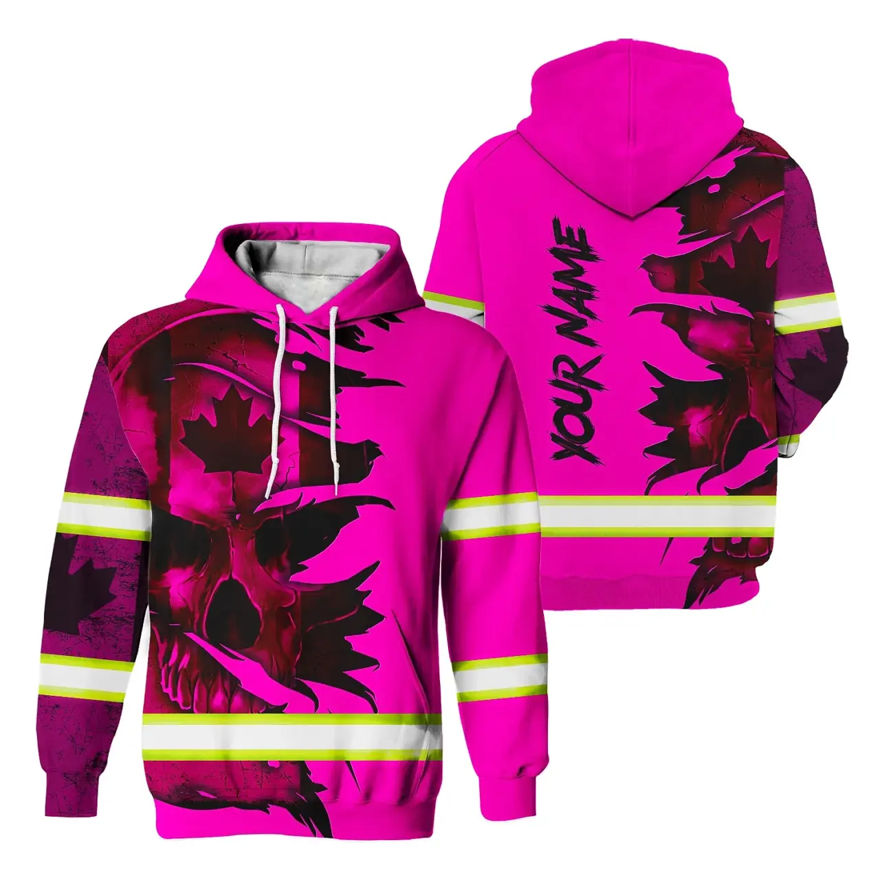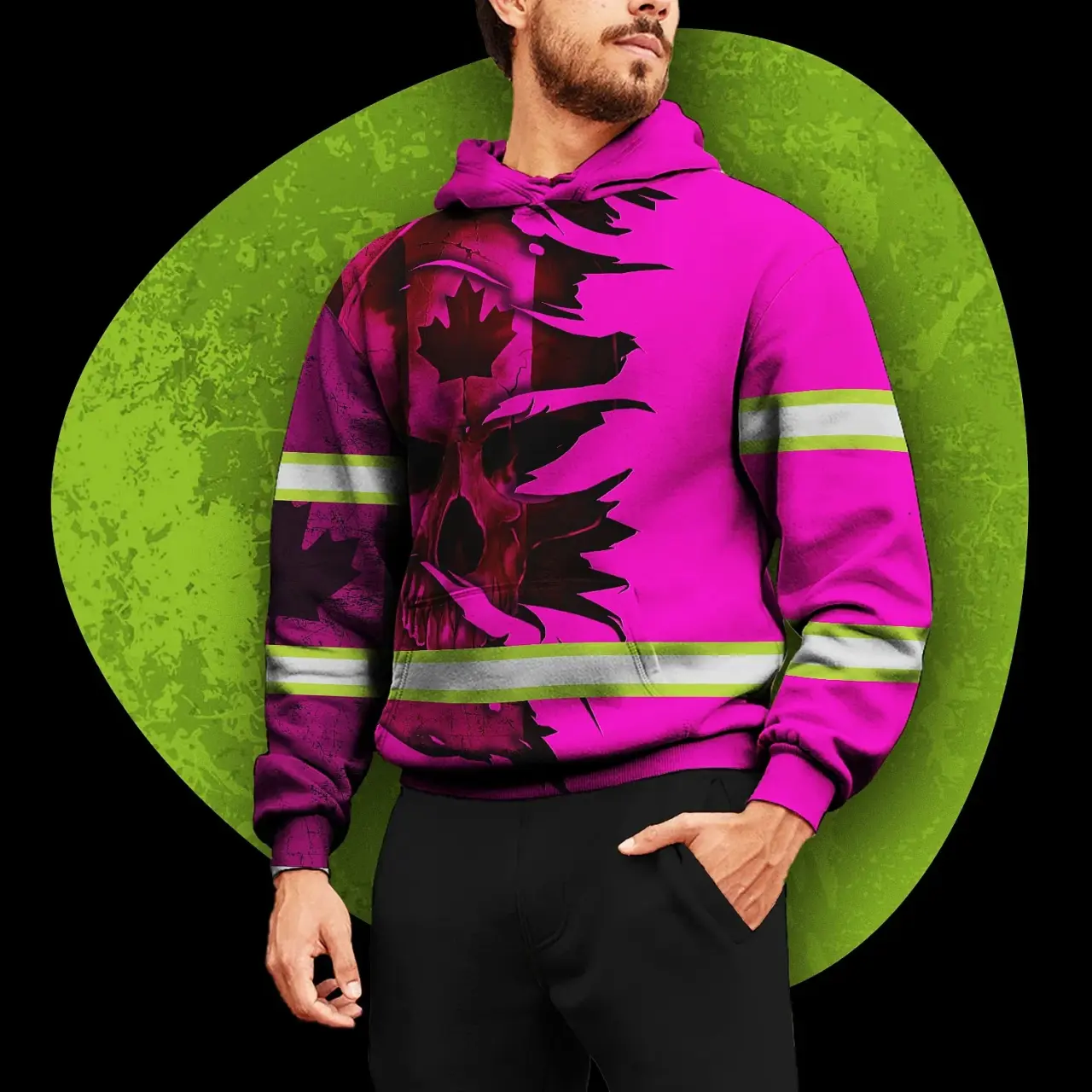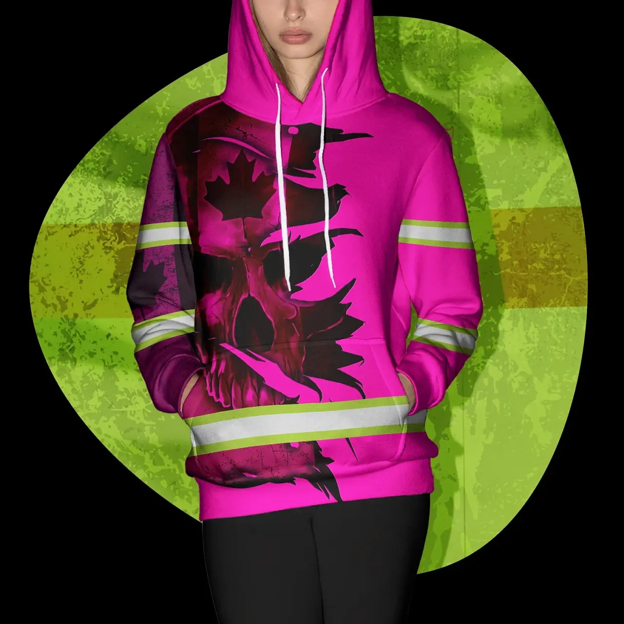 Hi Vis Hoodie Reflective Tapes Pink Neon Skull Canada Custom Name Safety Workwear For Worker, Operator, Patriotic