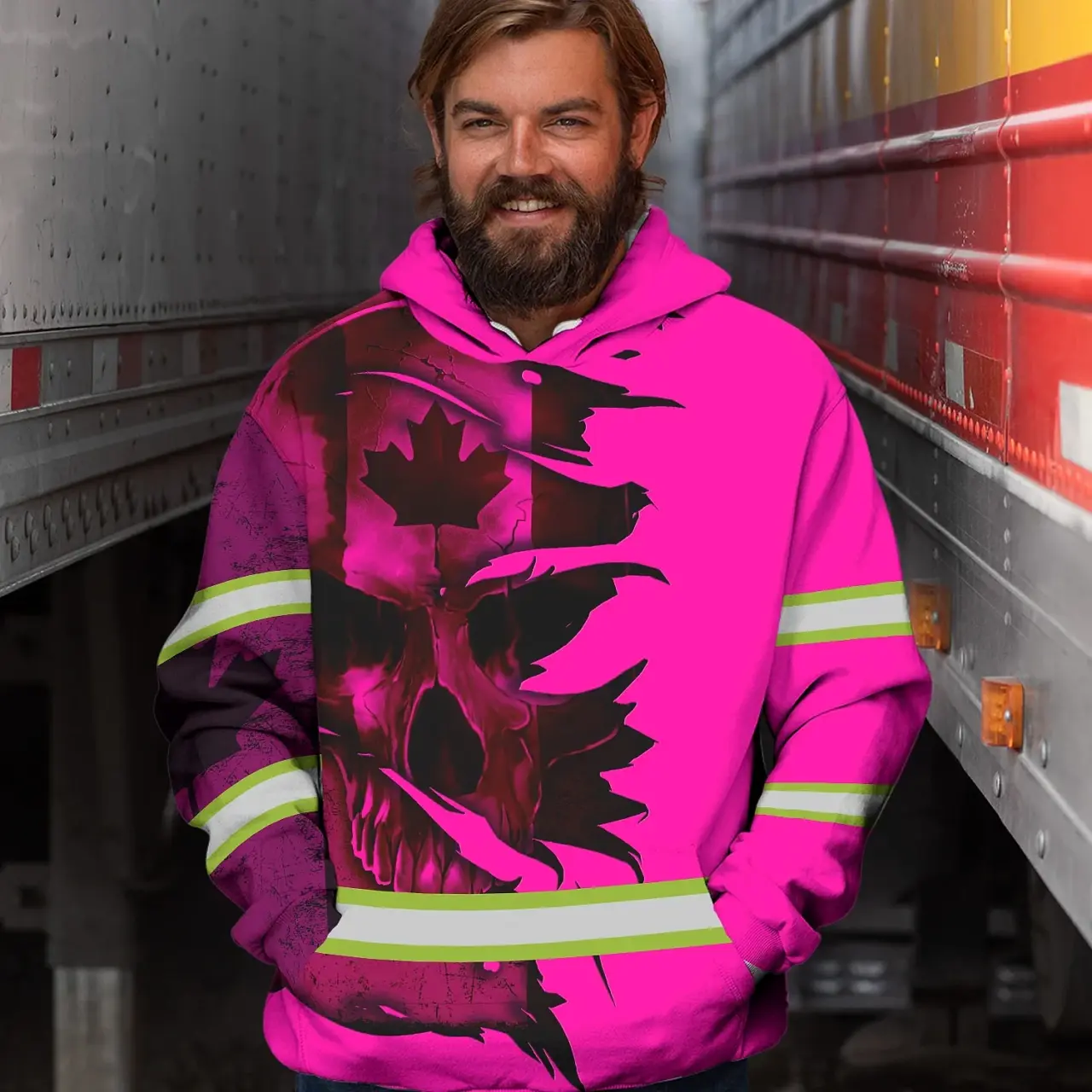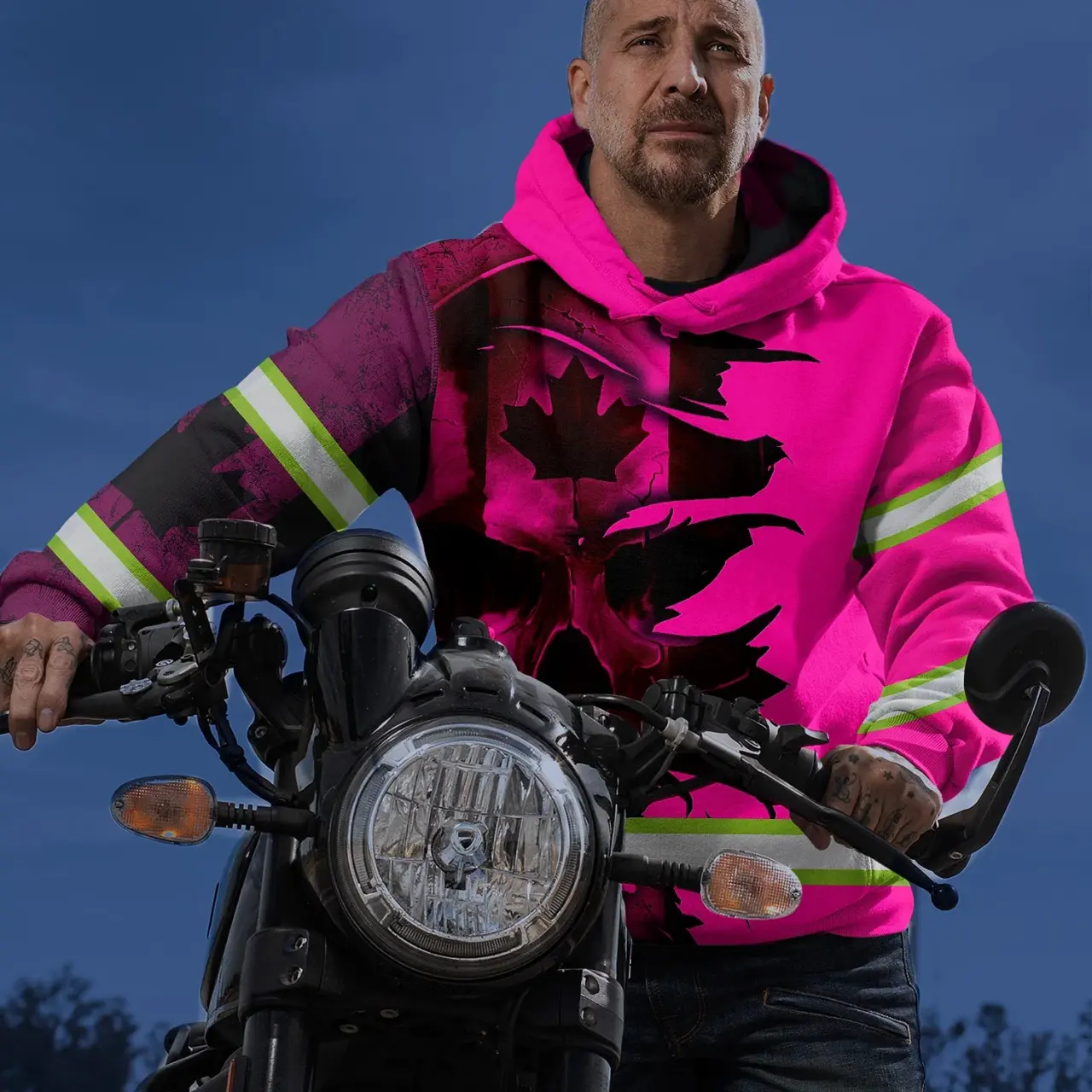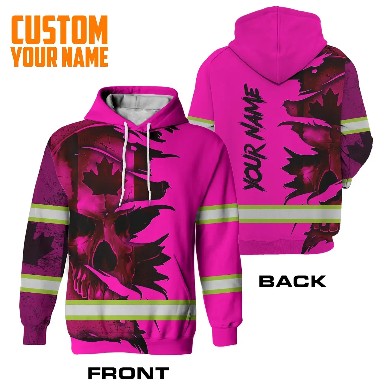 Hi Vis Hoodie Reflective Tapes Pink Neon Skull Canada Custom Name Safety Workwear For Worker, Operator, Patriotic