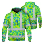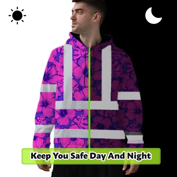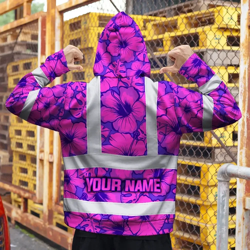Hi Vis Hoodie Reflective Tapes Violet Neon And Pink Flowers Custom Name Safety Workwear For Workers, Truckers, Operators