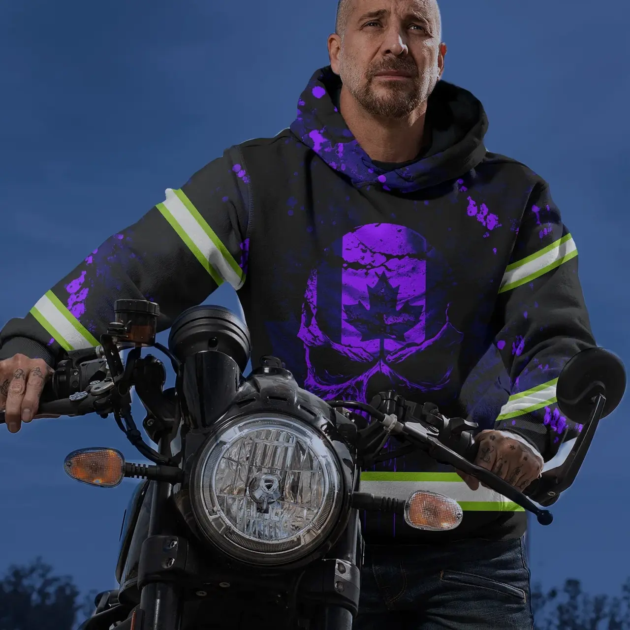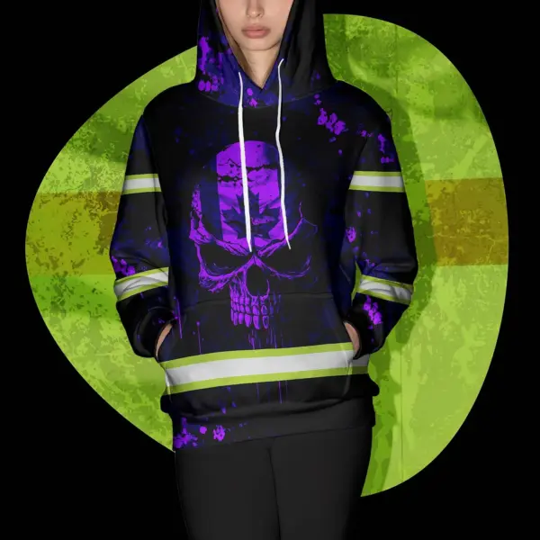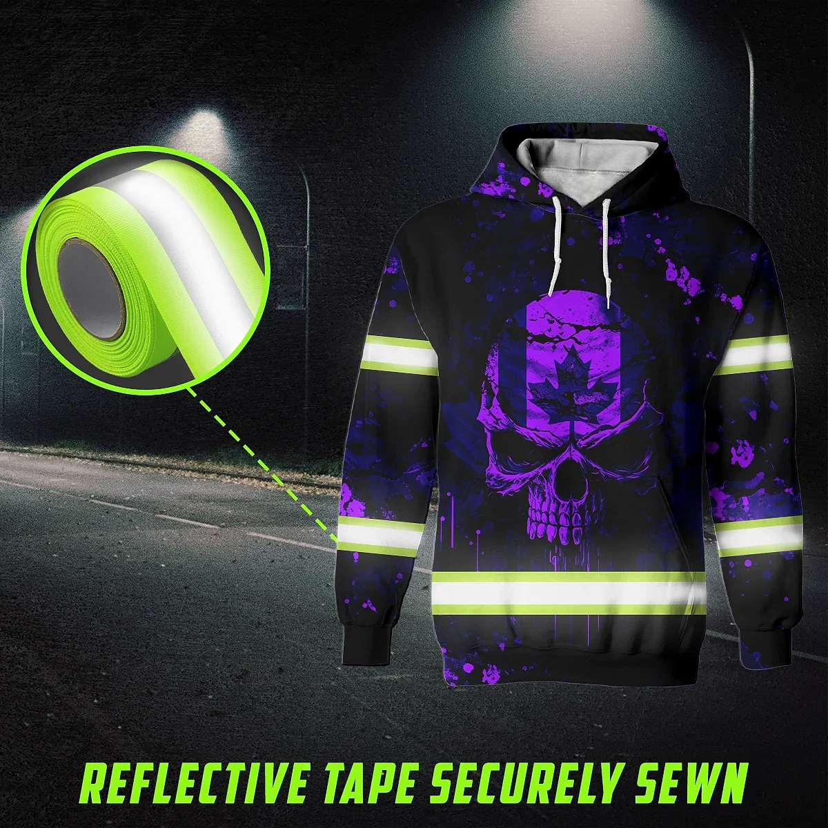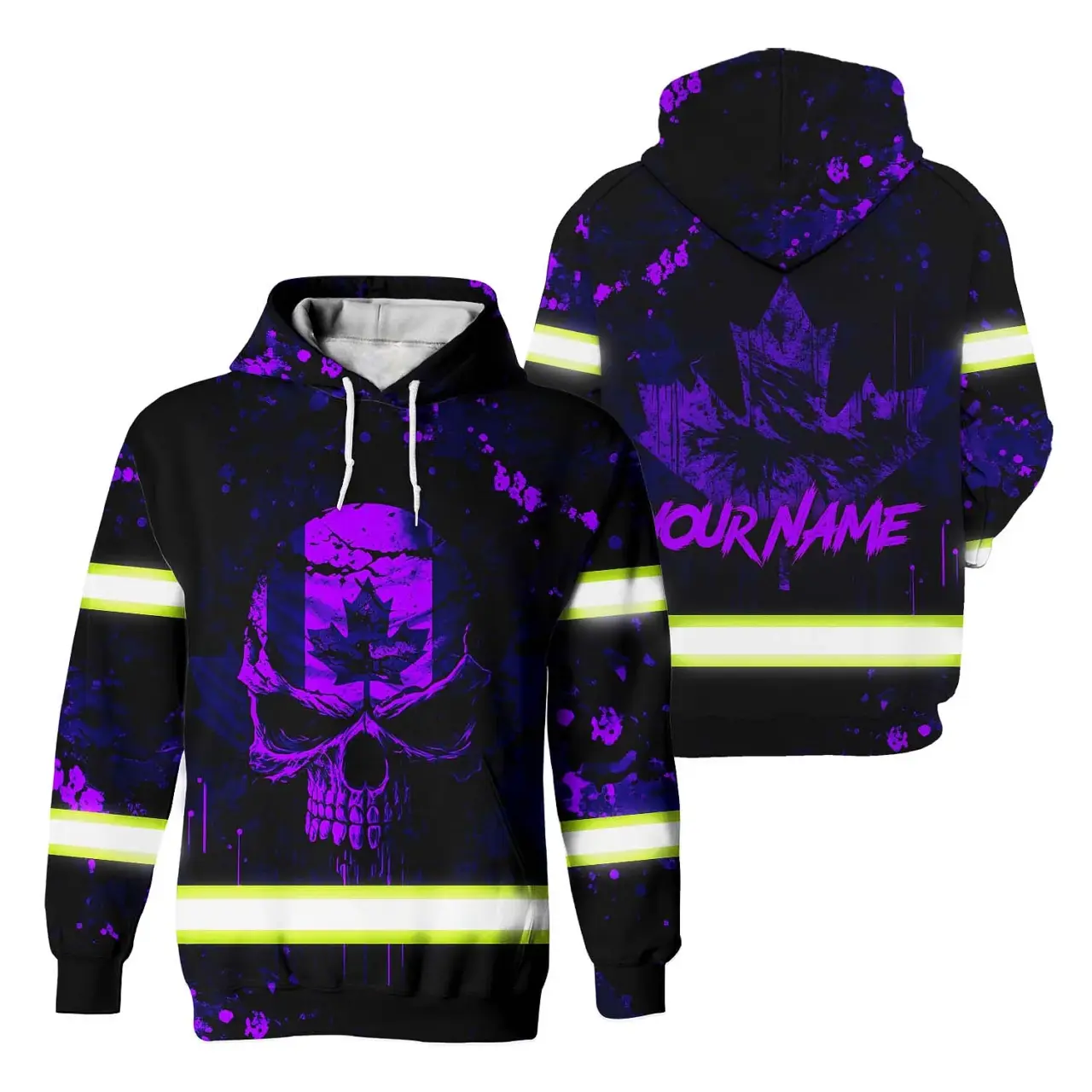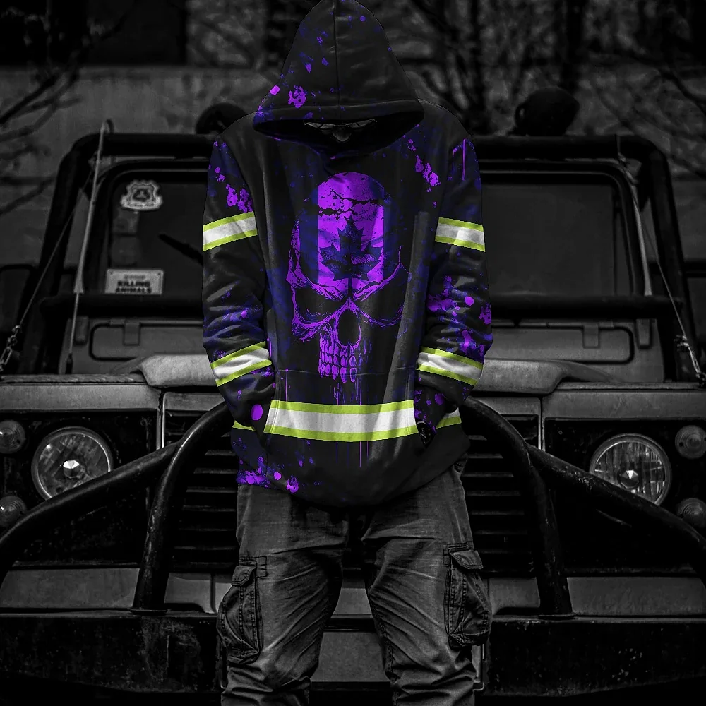 Hi Vis Hoodie Reflective Tapes Violet Neon Skull Paint Flakes Canada Flag Custom Name Safety Workwear For Worker, Operator, Patriotic