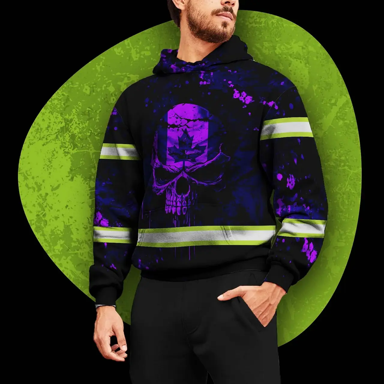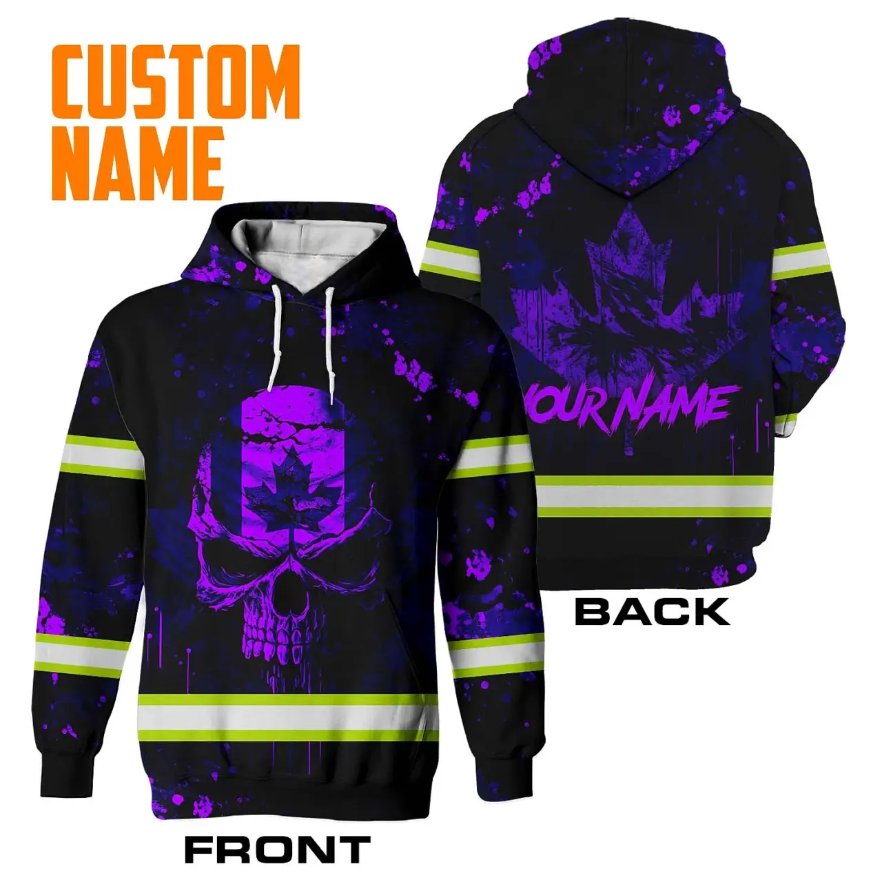 Be the first to review “Hi Vis Hoodie Reflective Tapes Violet Neon Skull Paint Flakes Canada Flag Custom Name Safety Workwear For Worker, Operator, Patriotic”