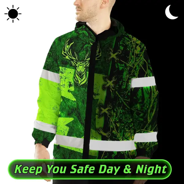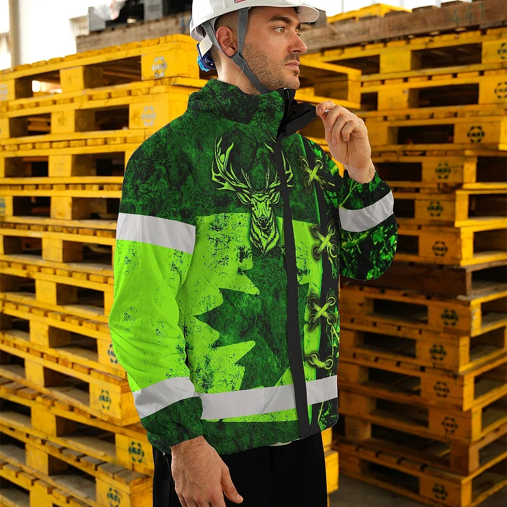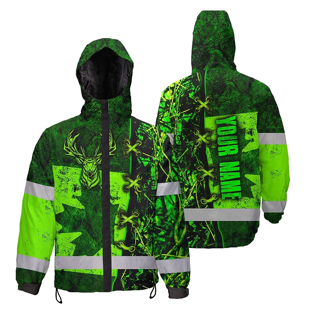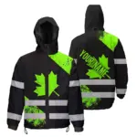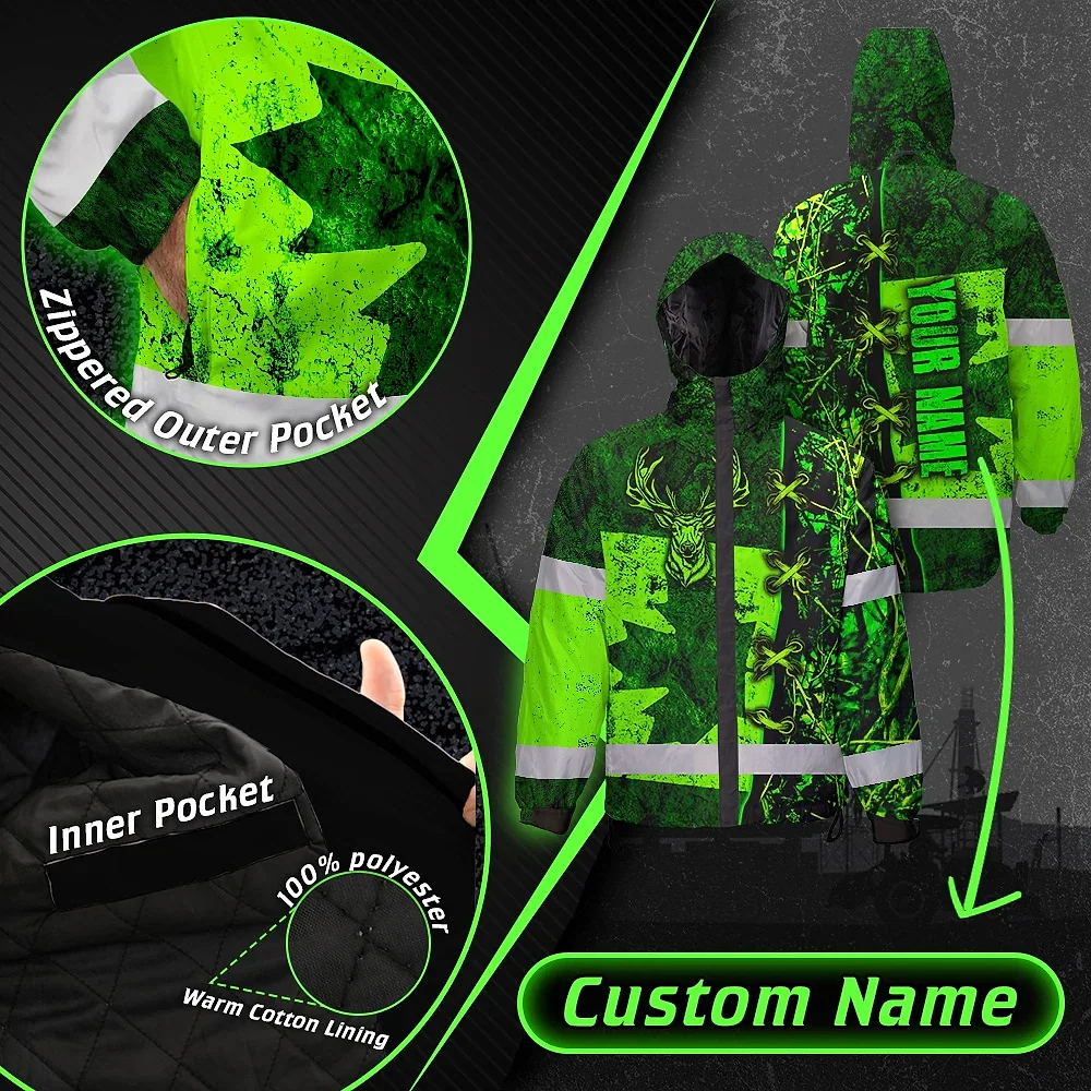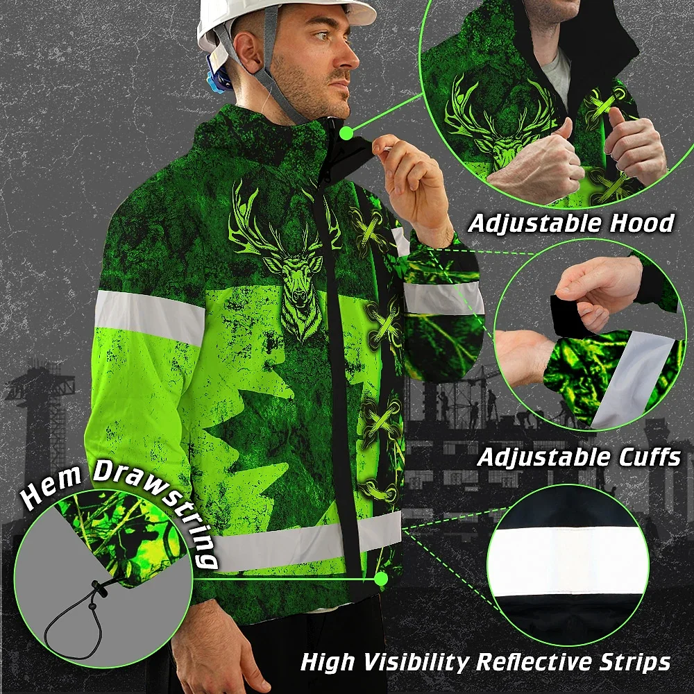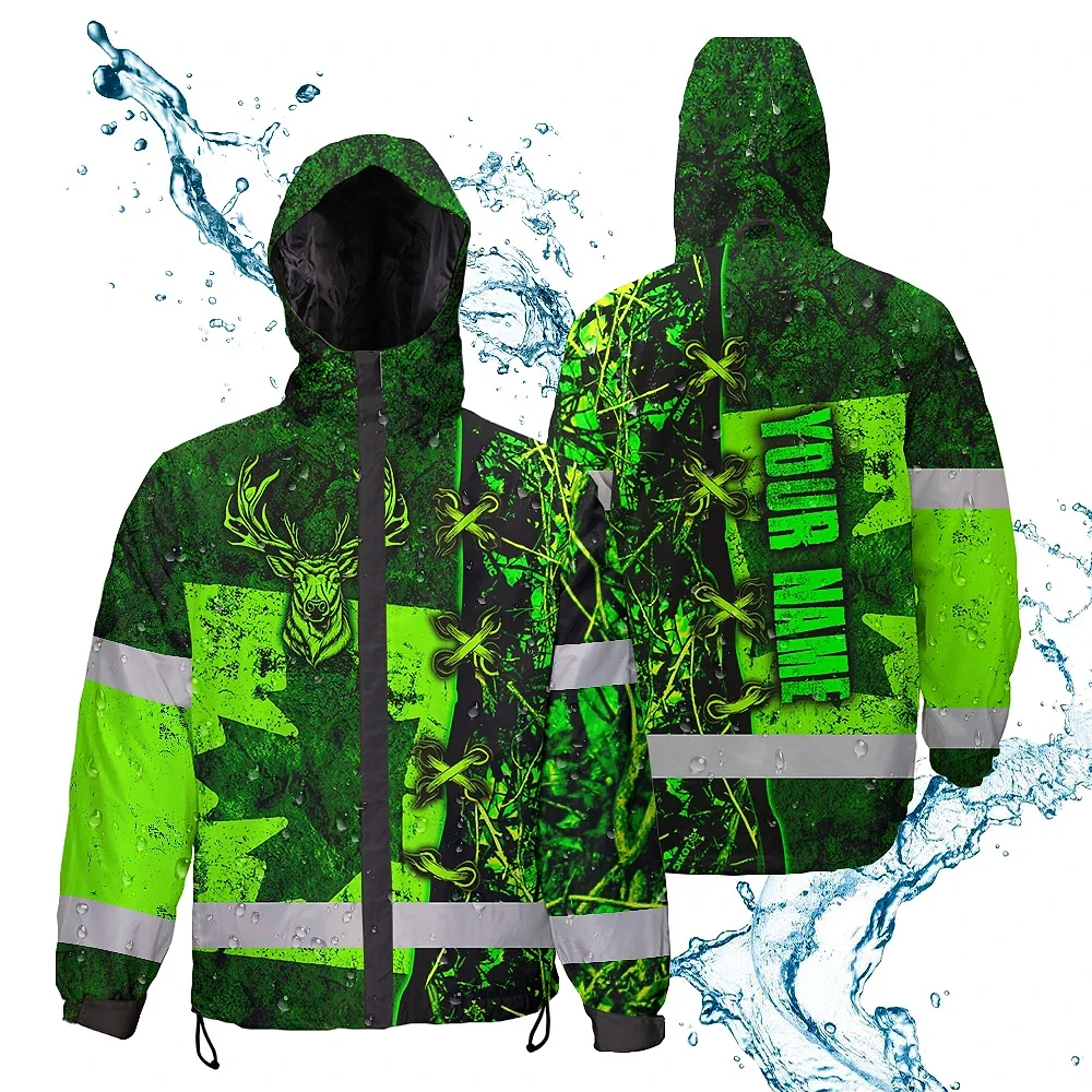 Hi Vis Jacket Waterproof Deer Hunting Canada Flag Custom Name Safety Workwear For Worker, Operator, Patriotic
