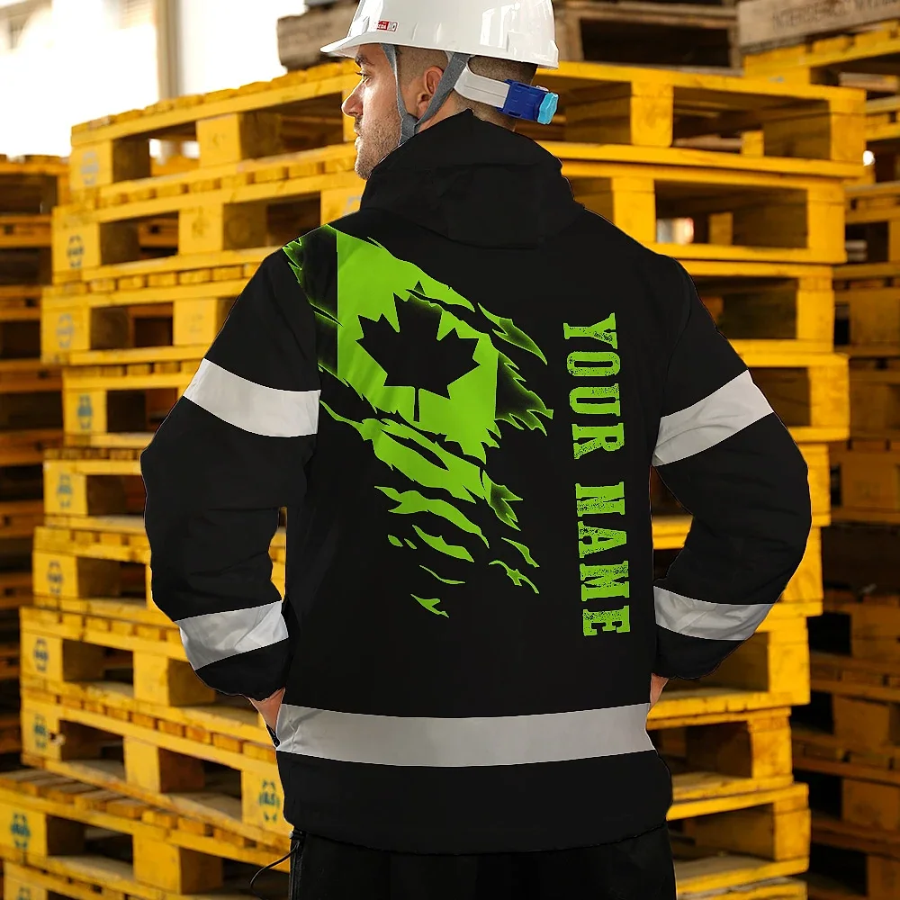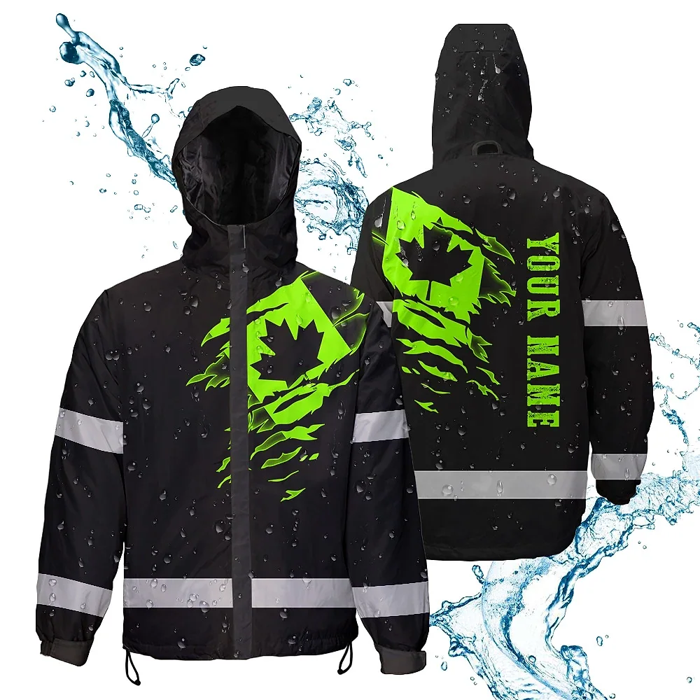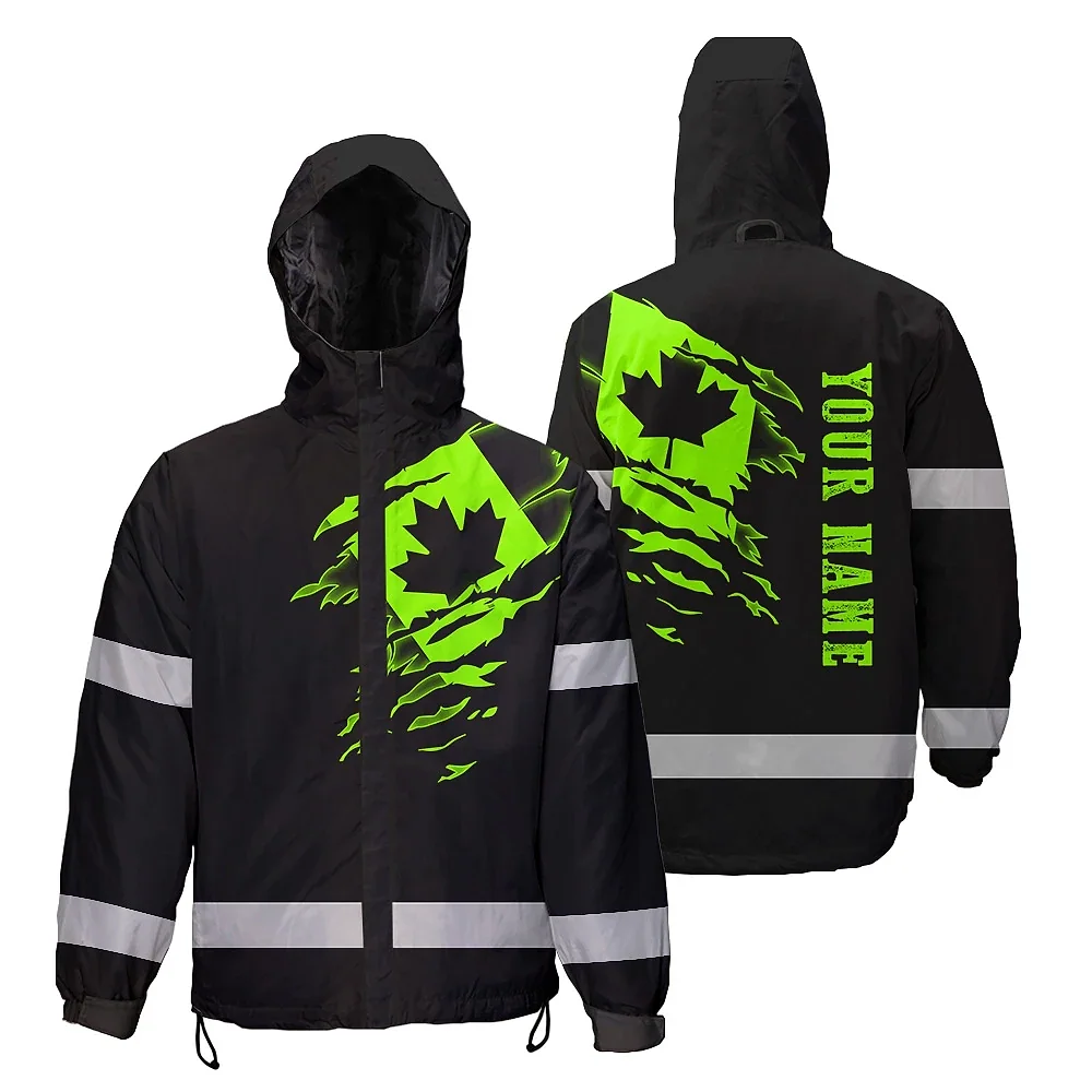 Hi Vis Jacket Waterproof Green And Black Color Canada Flag Custom Name Safety Workwear For Worker, Operator, Patriotic