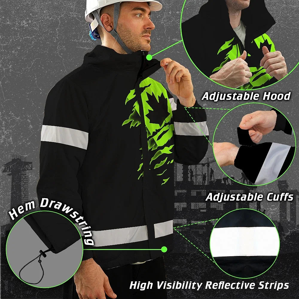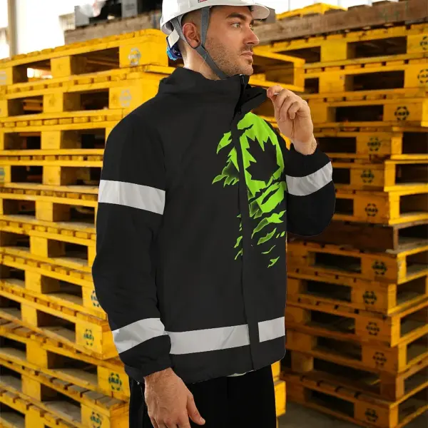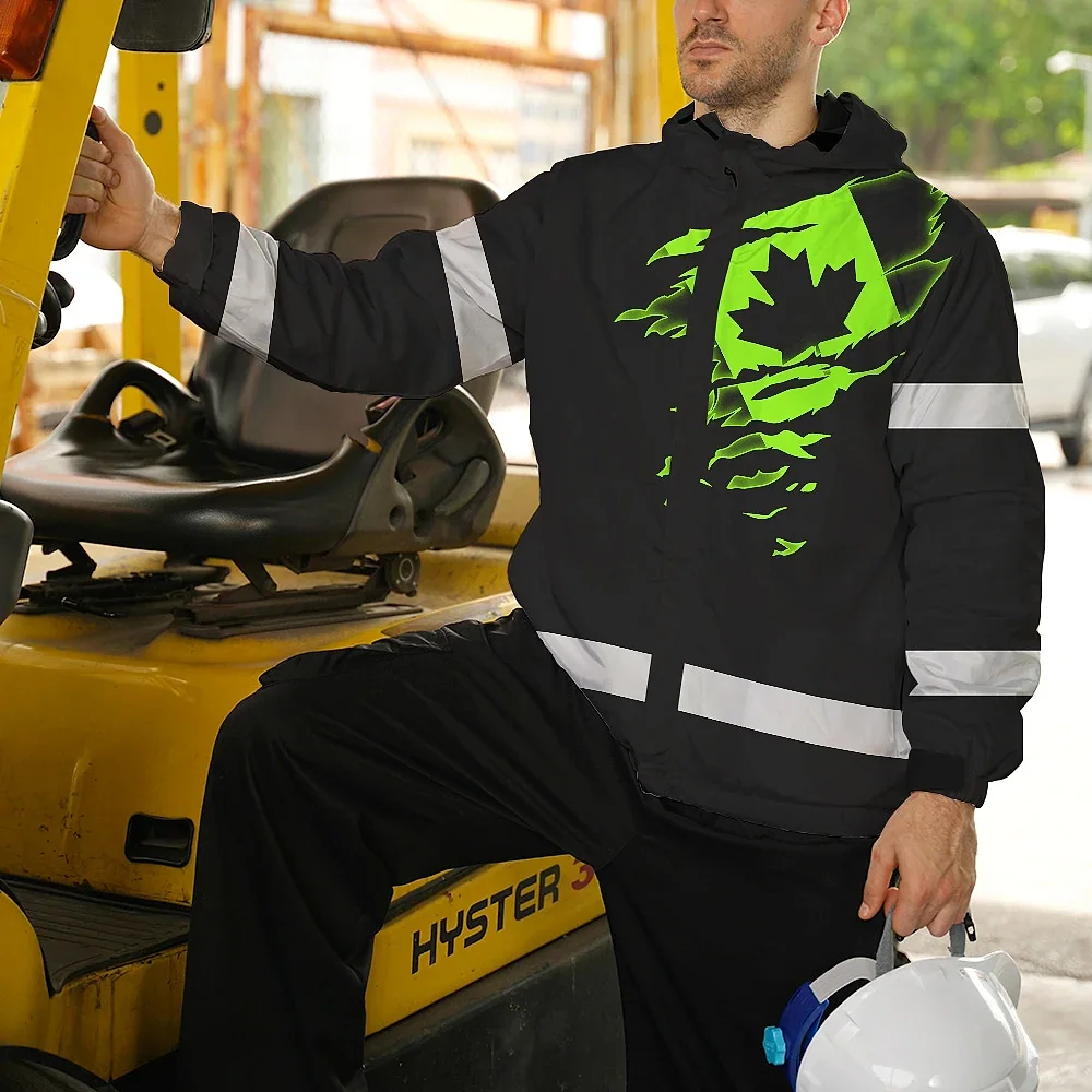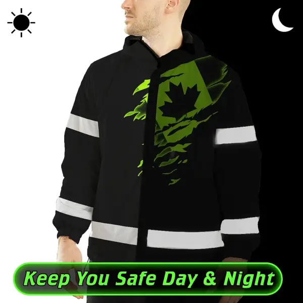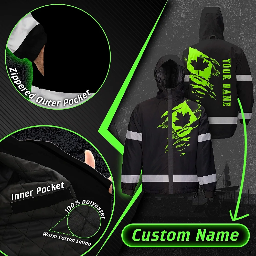 Hi Vis Jacket Waterproof Green And Black Color Canada Flag Custom Name Safety Workwear For Worker, Operator, Patriotic
