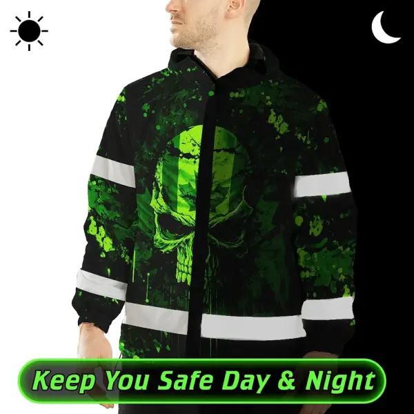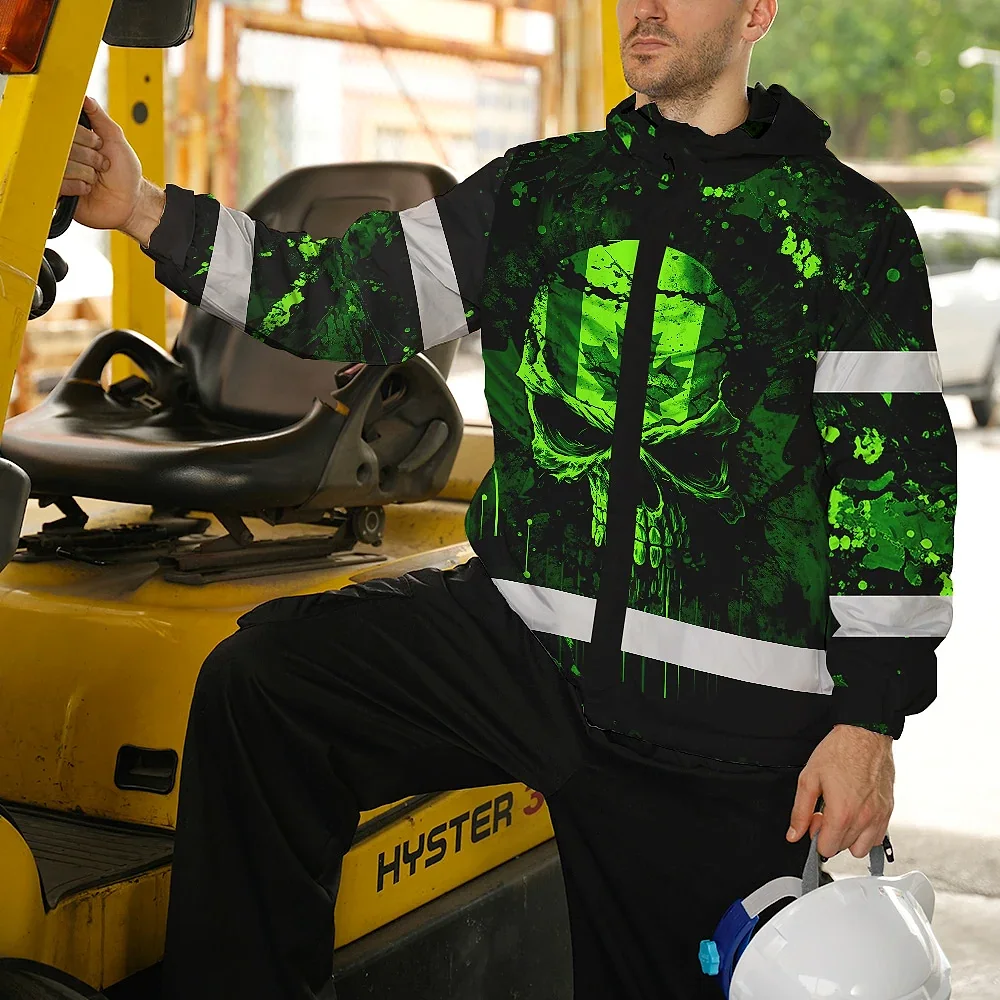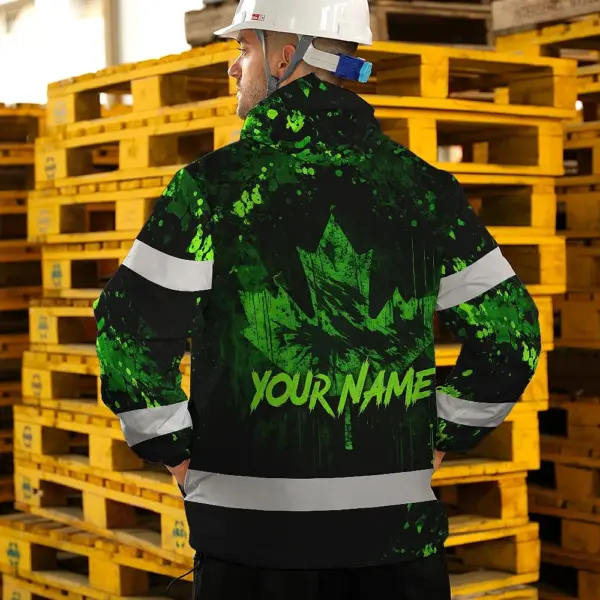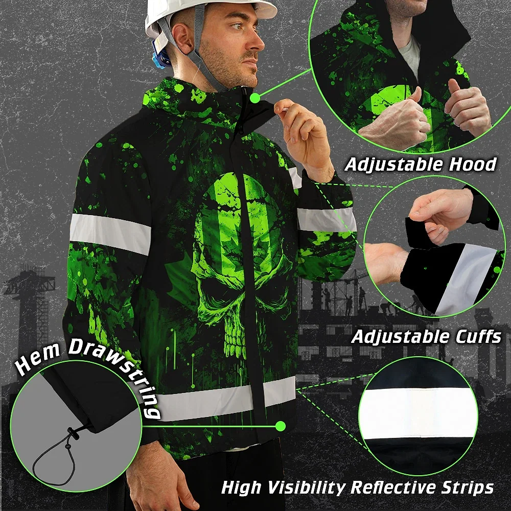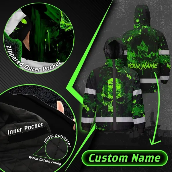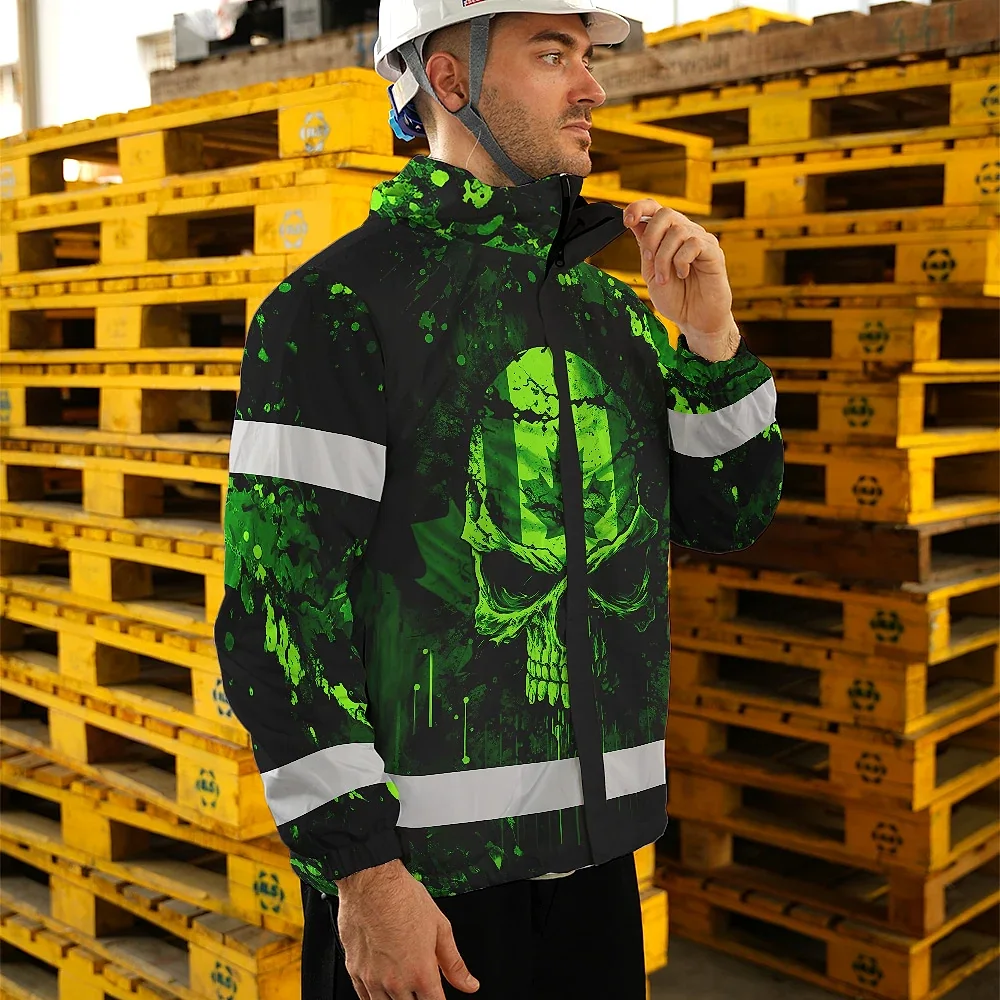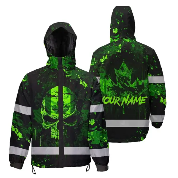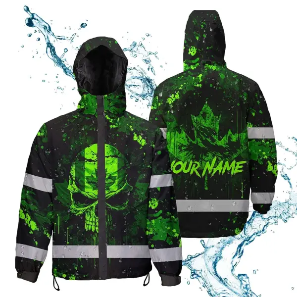 Hi Vis Jacket Waterproof Green Neon Skull Paint Flakes Canada Flag Custom Name Safety Workwear For Worker, Operator, Patriotic