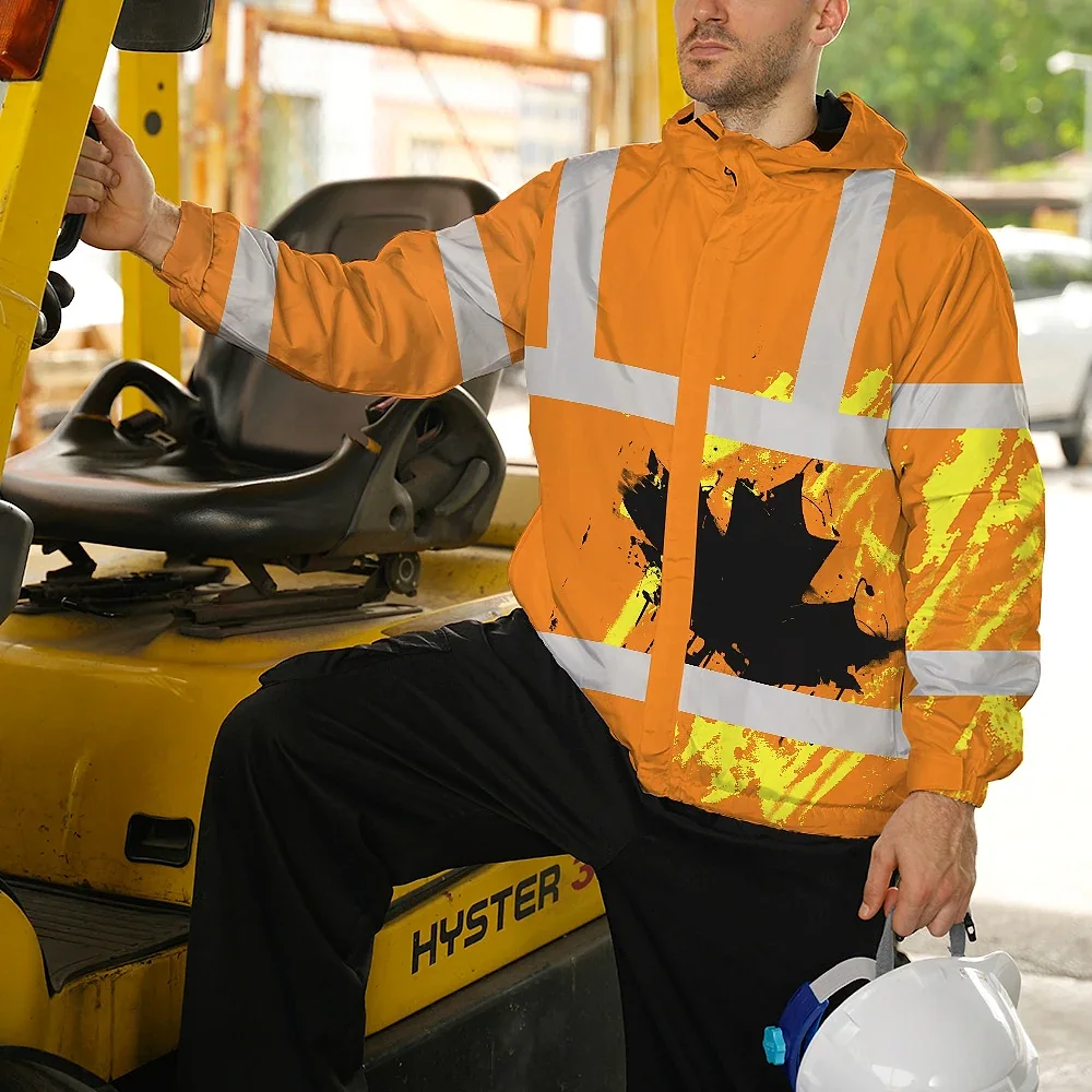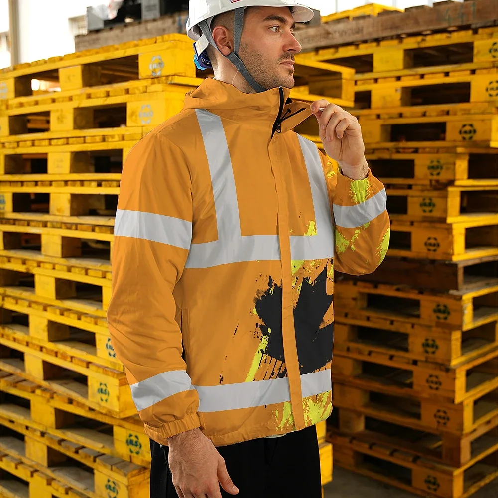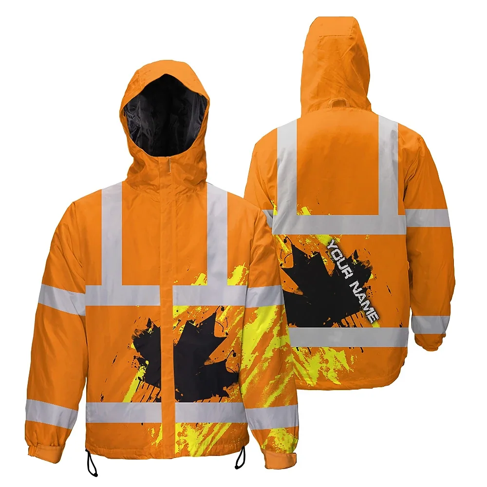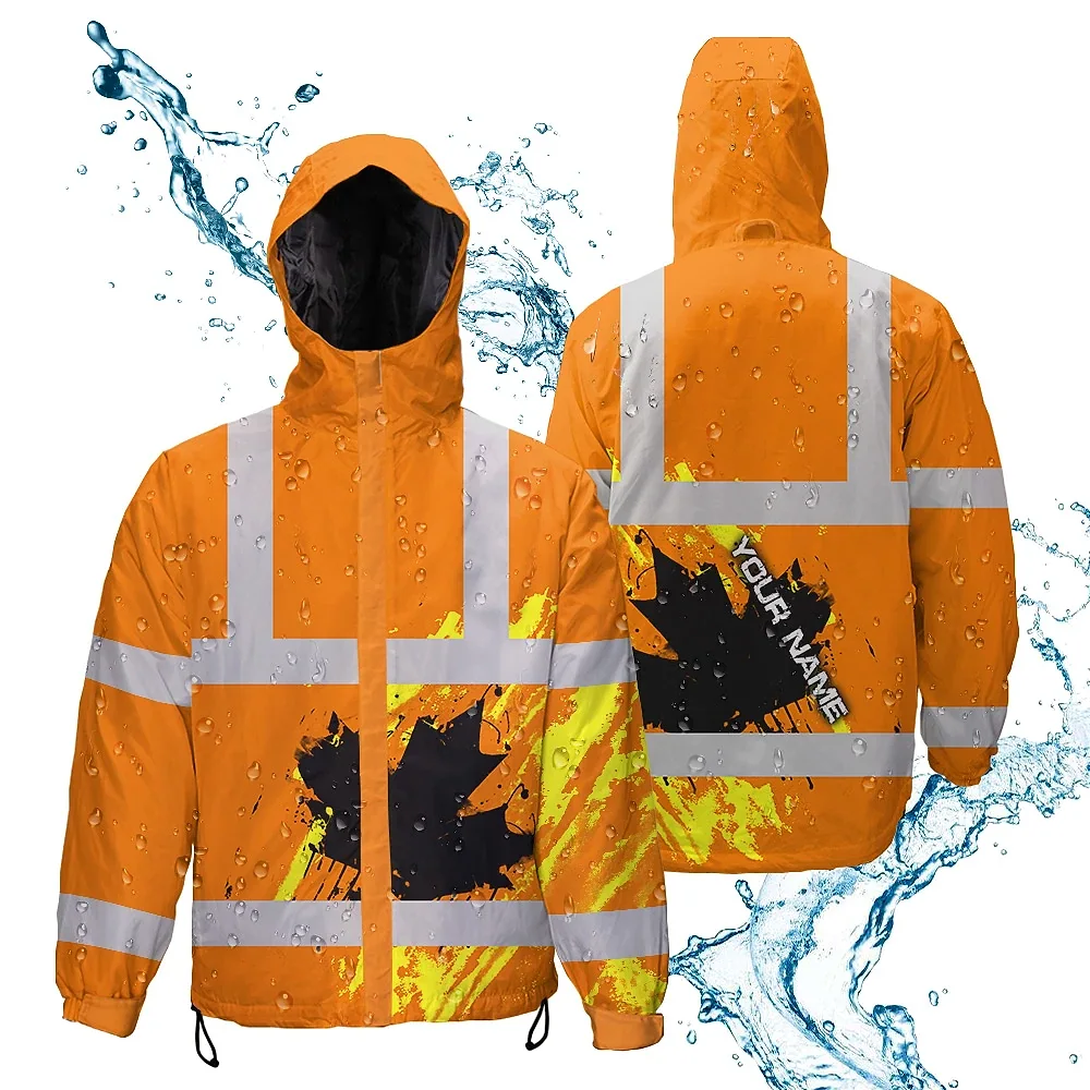 Hi Vis Jacket Waterproof Orange Neon Canada Flag Custom Name Safety Workwear For Worker, Operator, Patriotic