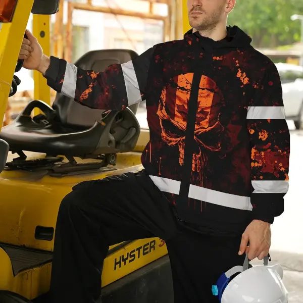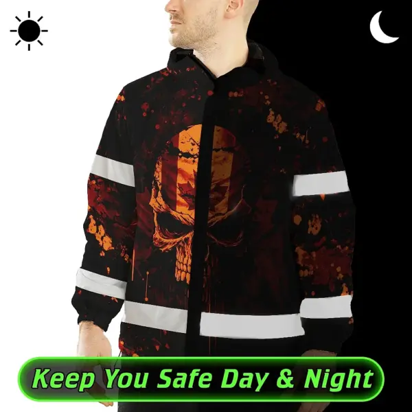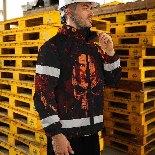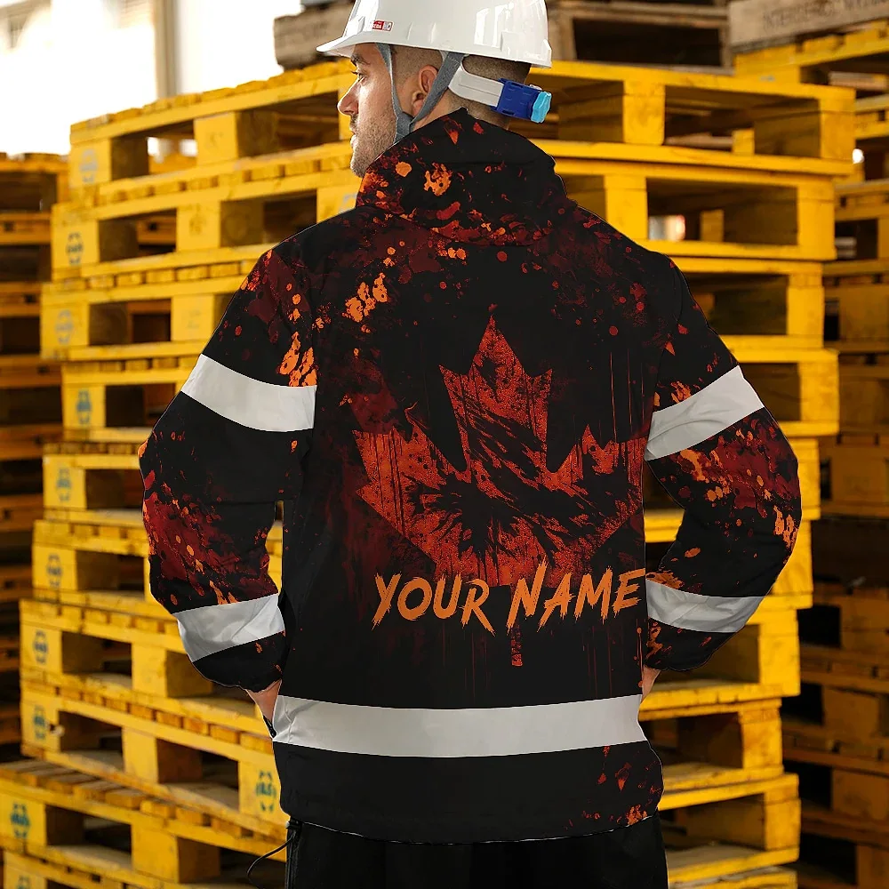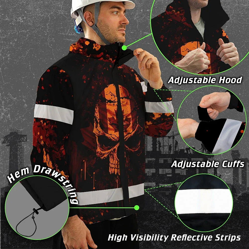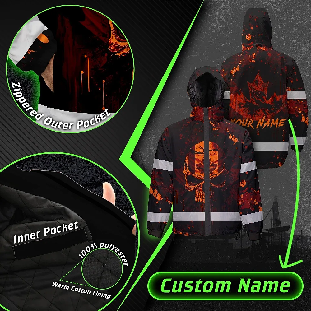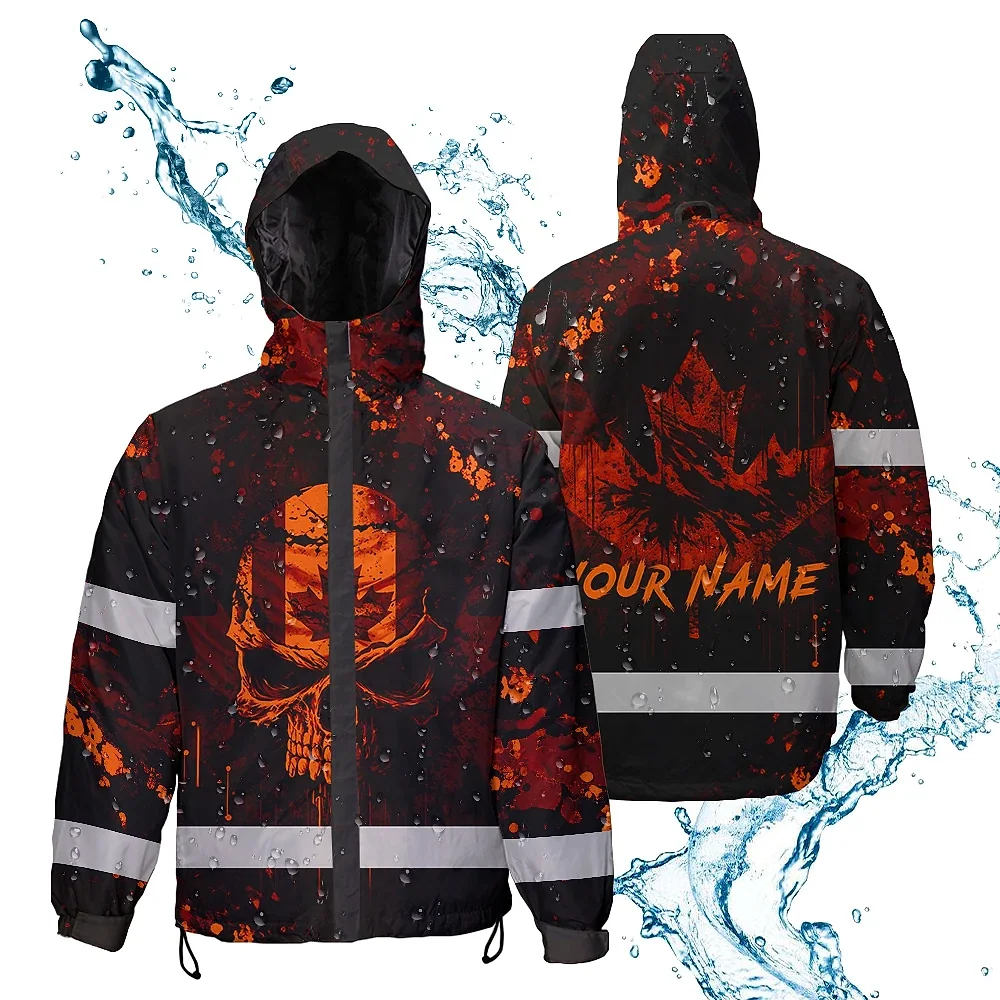 Hi Vis Jacket Waterproof Orange Neon Skull Paint Flakes Canada Flag Custom Name Safety Workwear For Worker, Operator, Patriotic