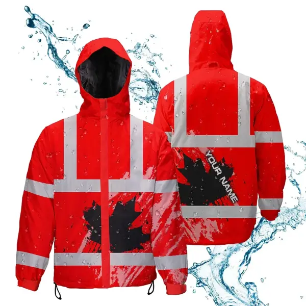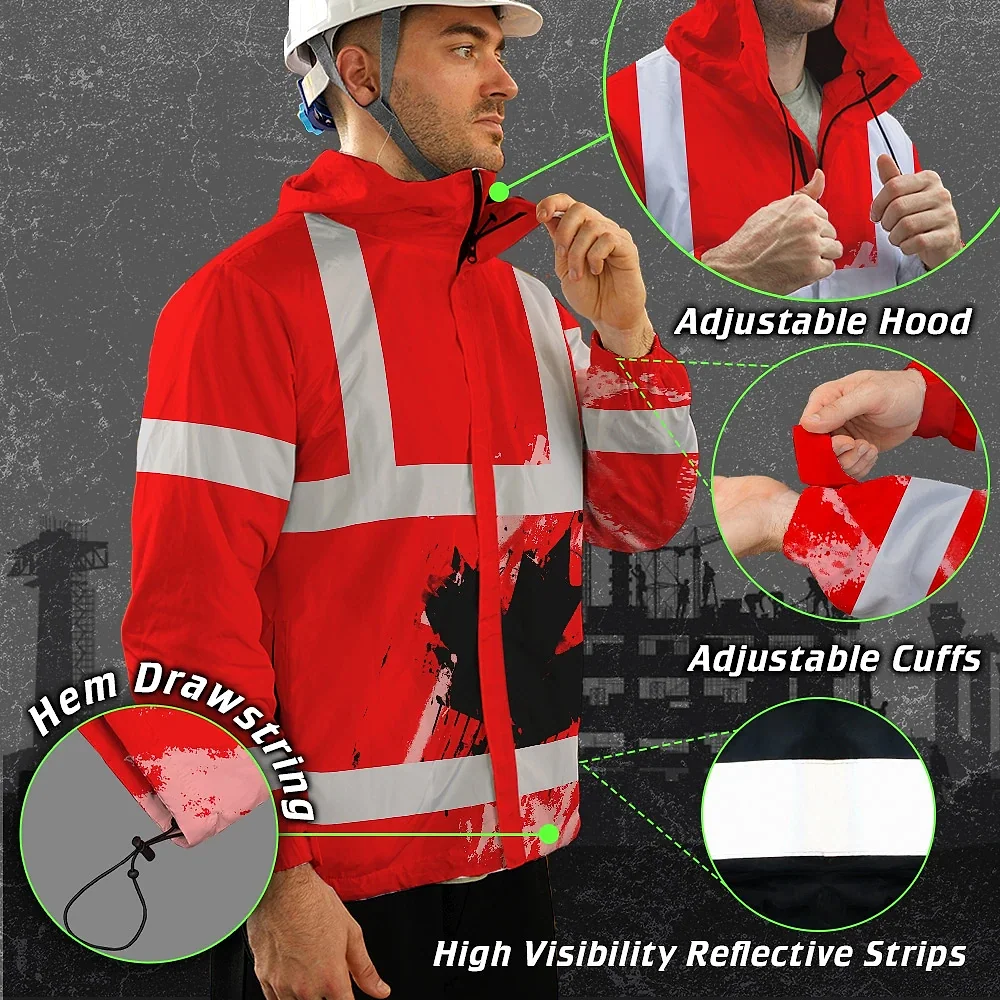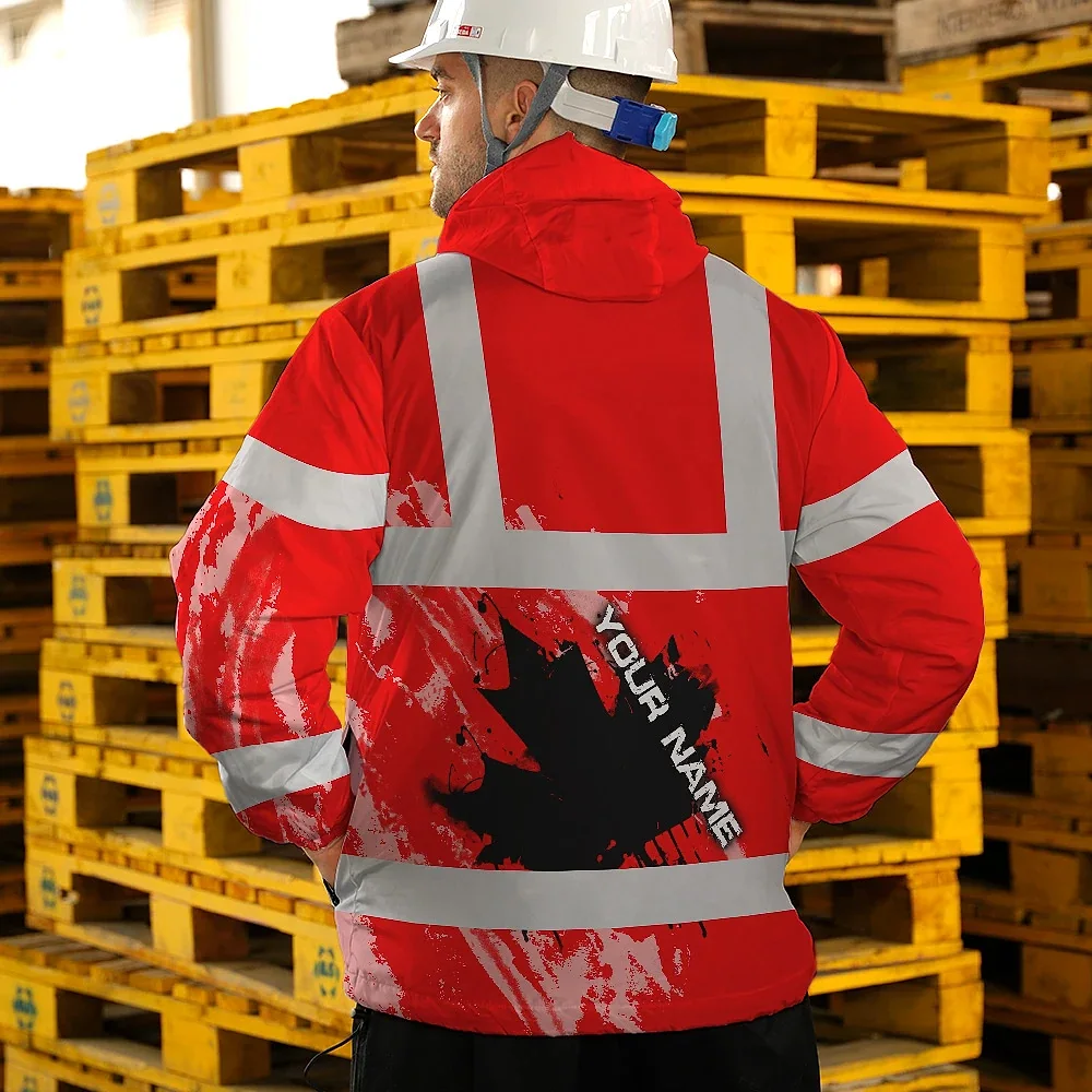 Hi Vis Jacket Waterproof Red Neon Canada Flag Custom Name Safety Workwear For Worker, Operator, Patriotic