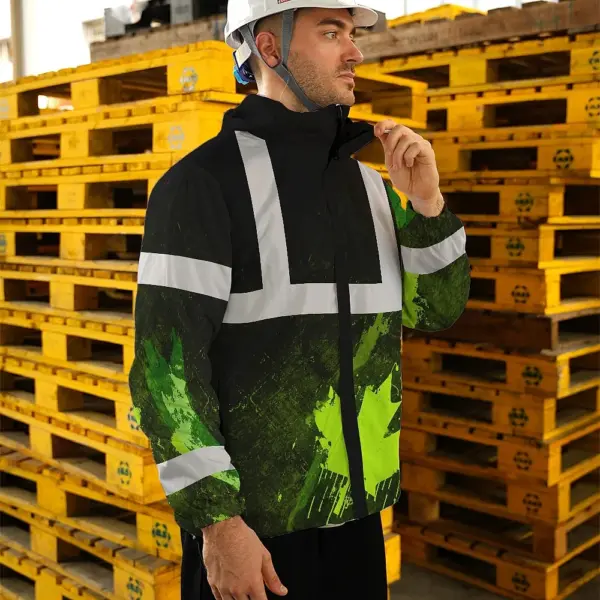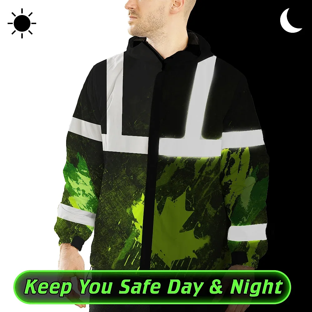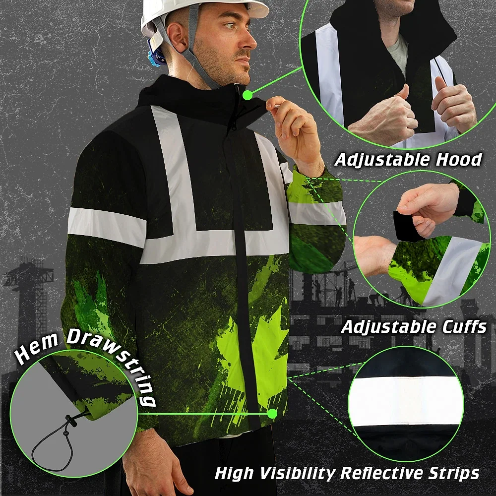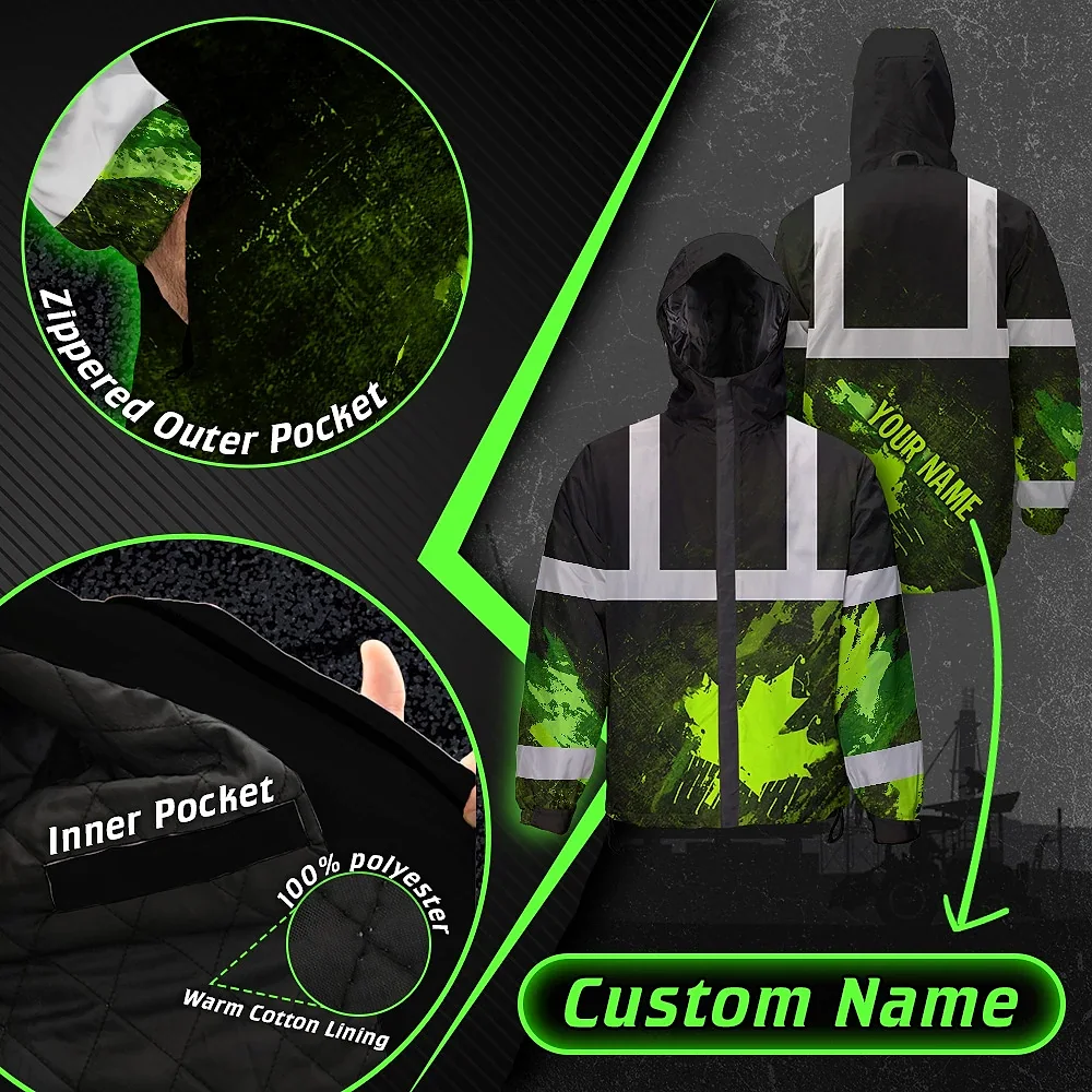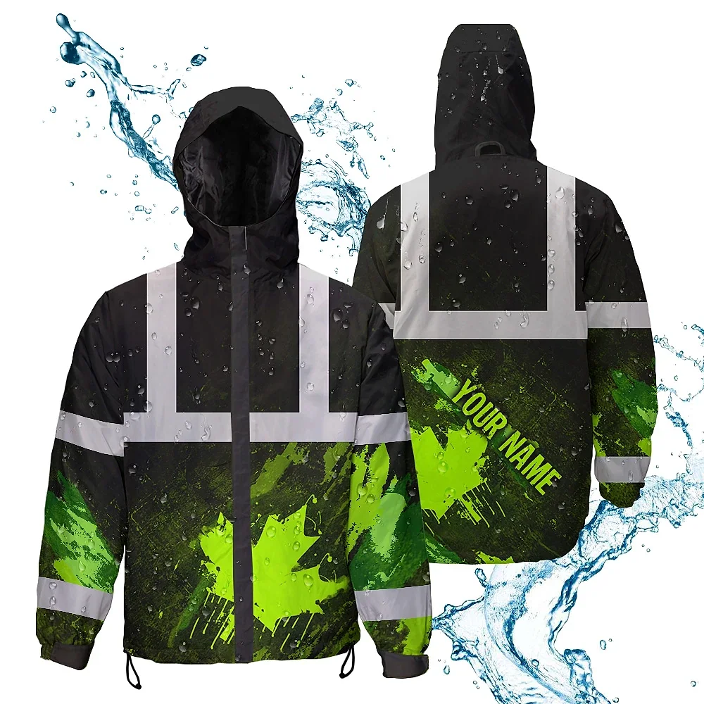 Hi Vis Jacket Waterproof Reflective Green Neon Canada Flag Custom Name Safety Workwear For Worker, Operator, Patriotic