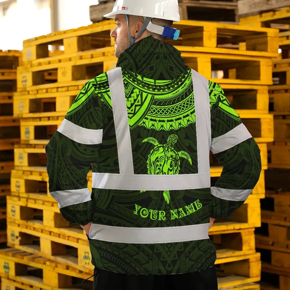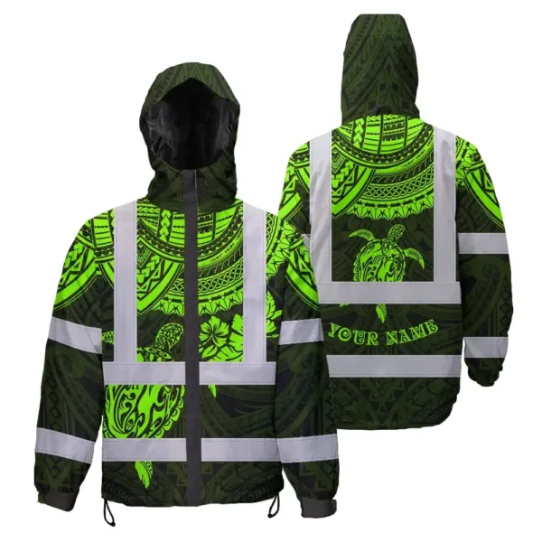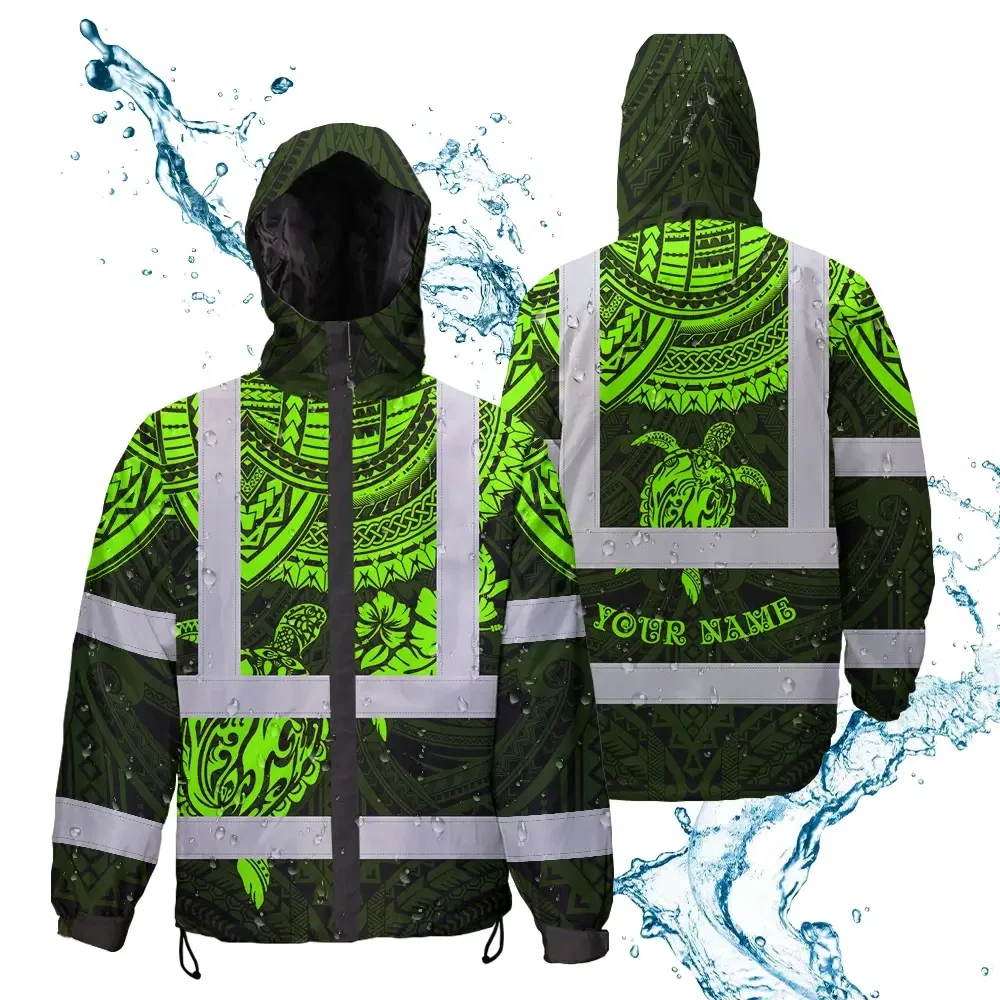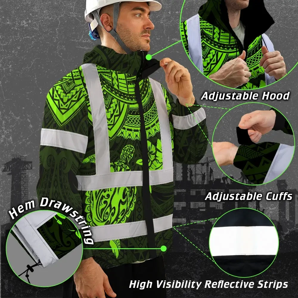 Hi Vis Jacket Waterproof Reflective Tapes Green Turtle Flower Hawaiian Polynesian Tribal Custom Name Safety Workwear For Workers, Truckers, Operators