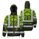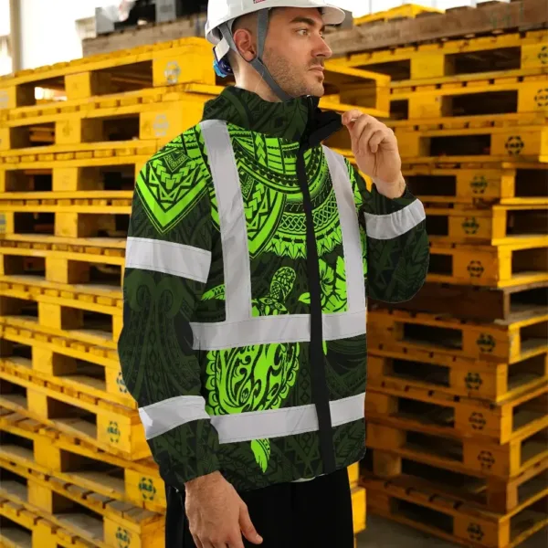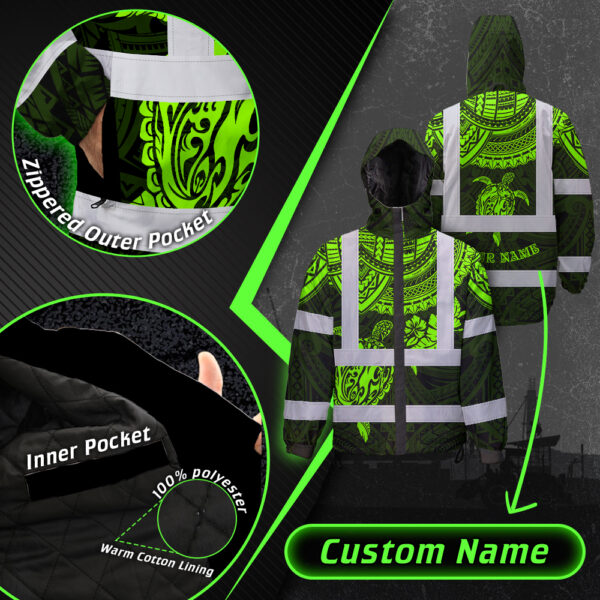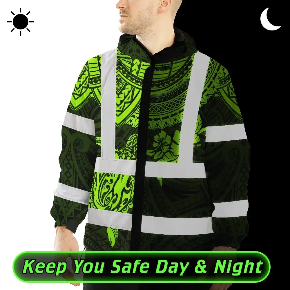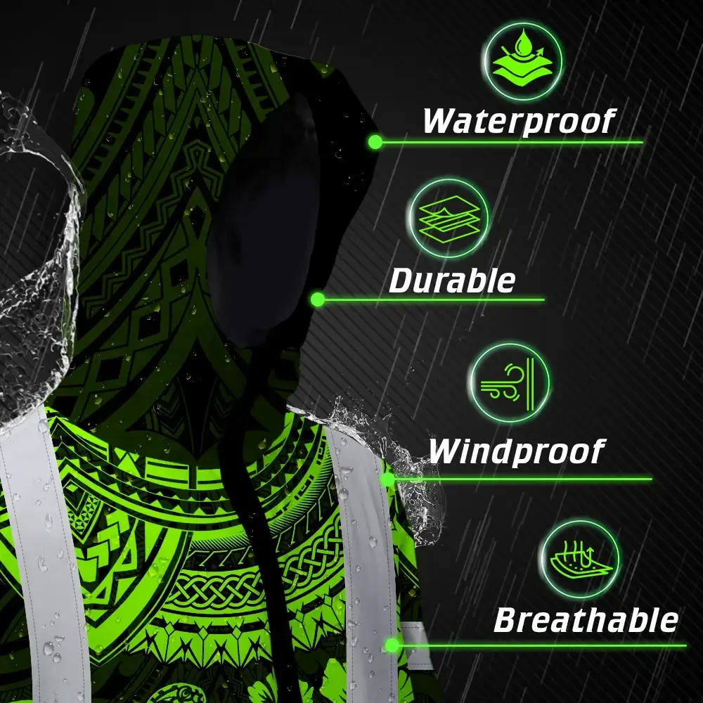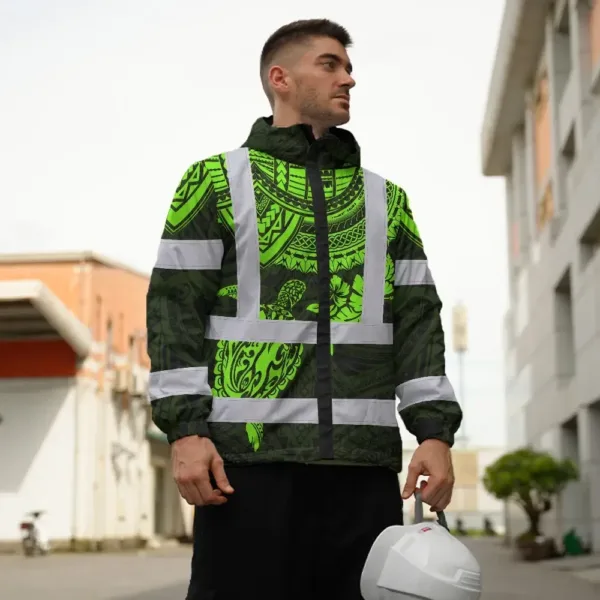 Hi Vis Jacket Waterproof Reflective Tapes Green Turtle Flower Hawaiian Polynesian Tribal Custom Name Safety Workwear For Workers, Truckers, Operators