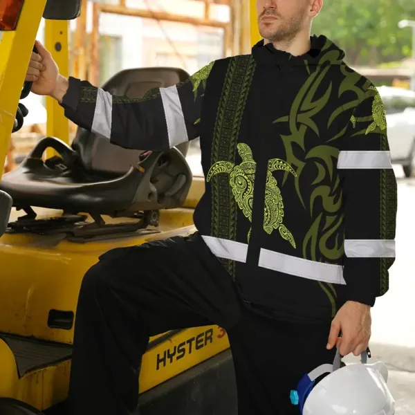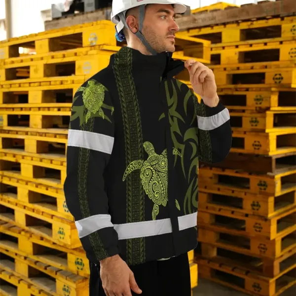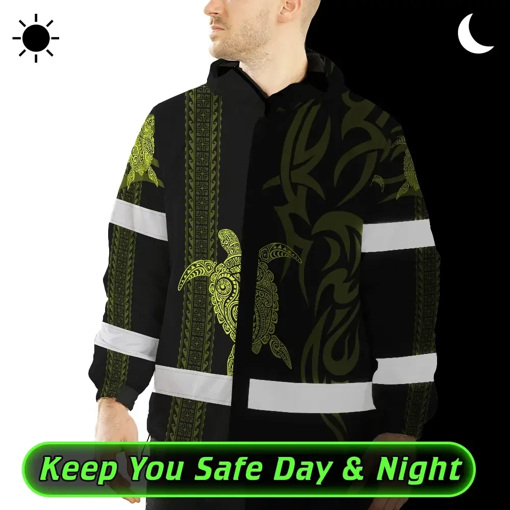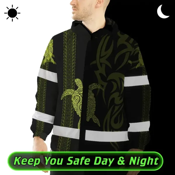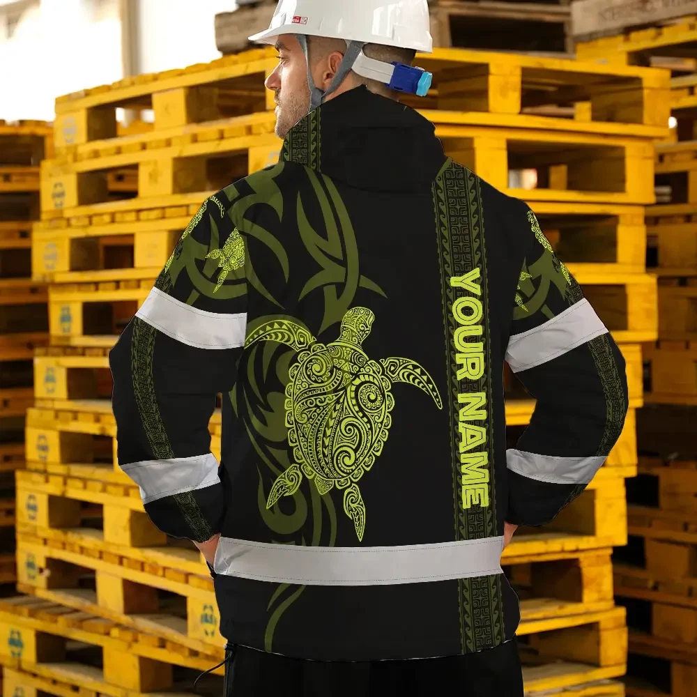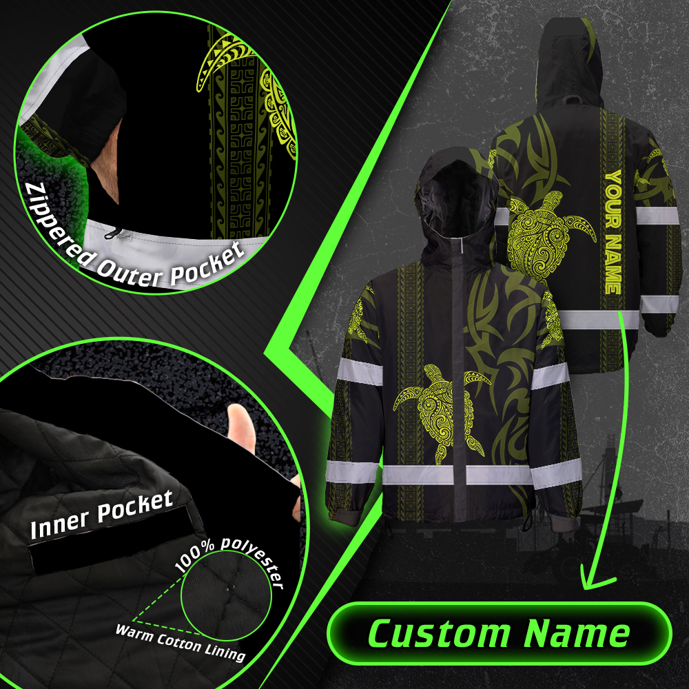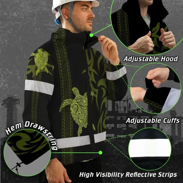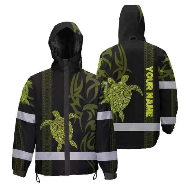 Hi Vis Jacket Waterproof Reflective Tapes Lime Neon Hawaiian Polynesian Tribal Custom Name Safety Workwear For Workers, Truckers, Operators