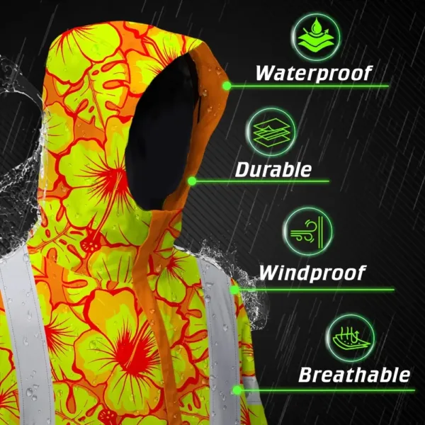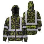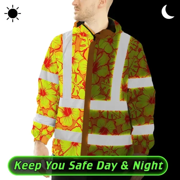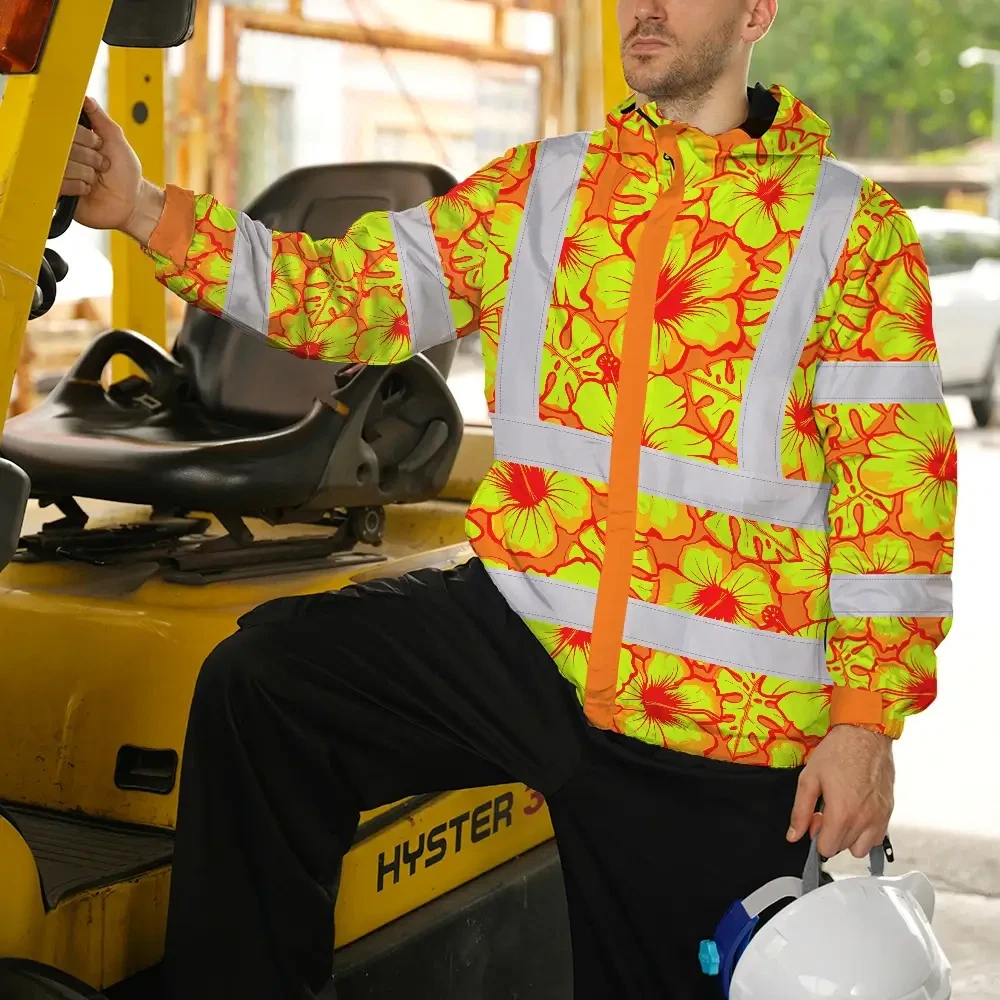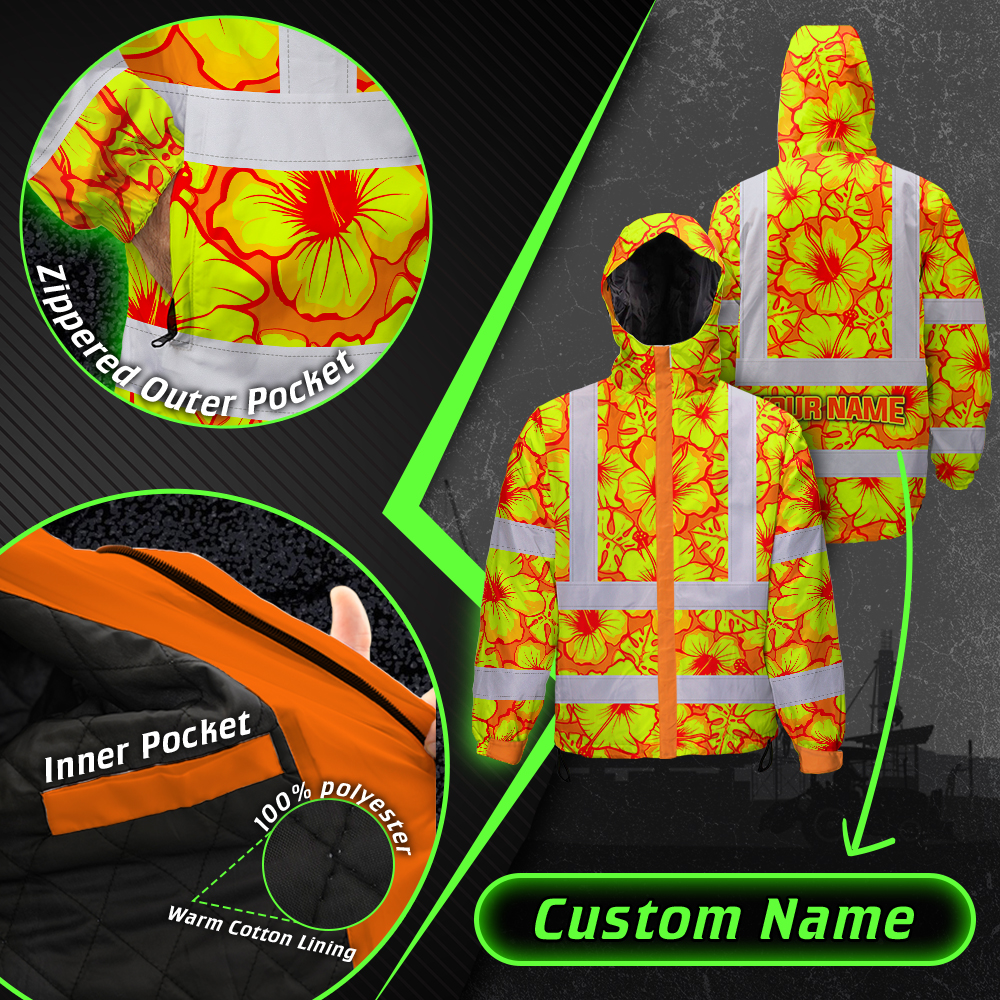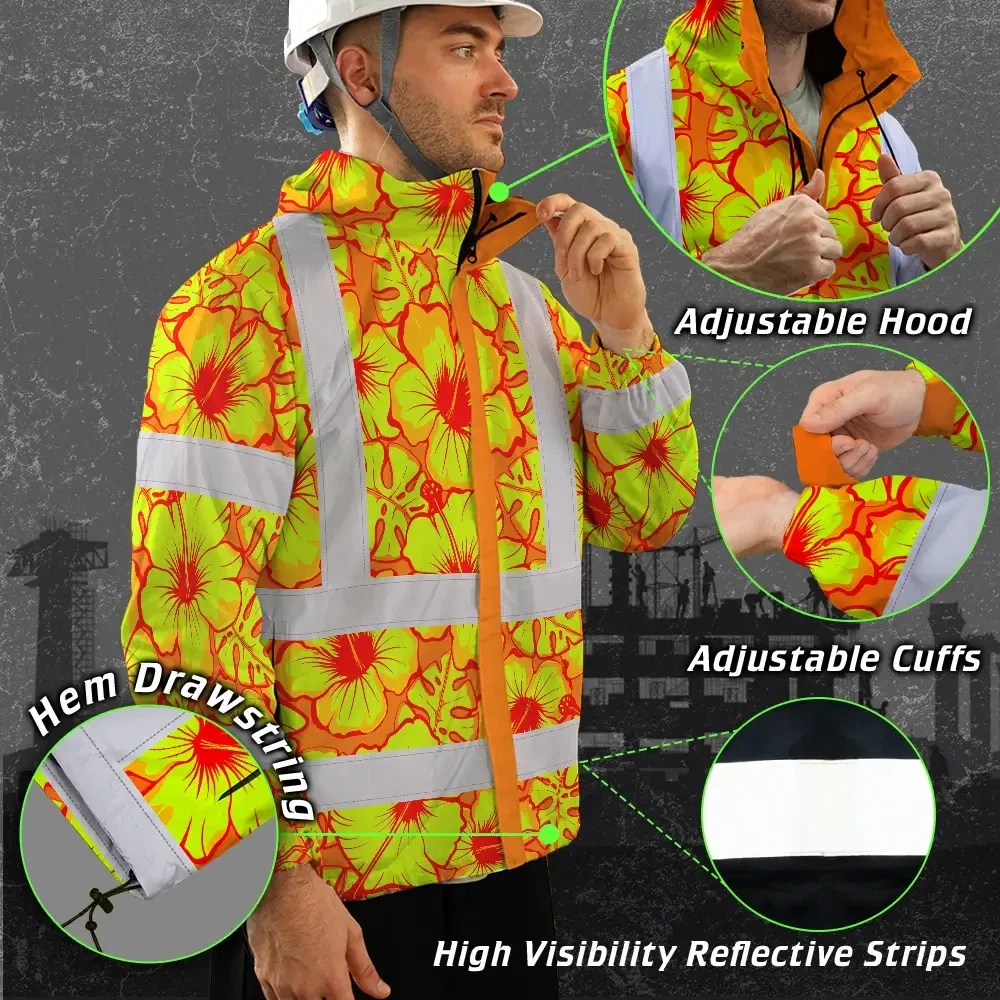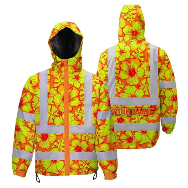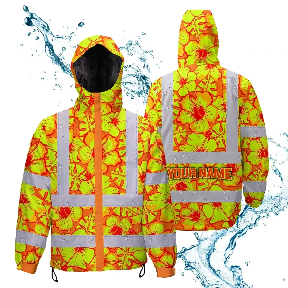 Hi Vis Jacket Waterproof Reflective Tapes Orange Neon And Yellow Flowers Custom Name Safety Workwear For Workers, Truckers, Operators