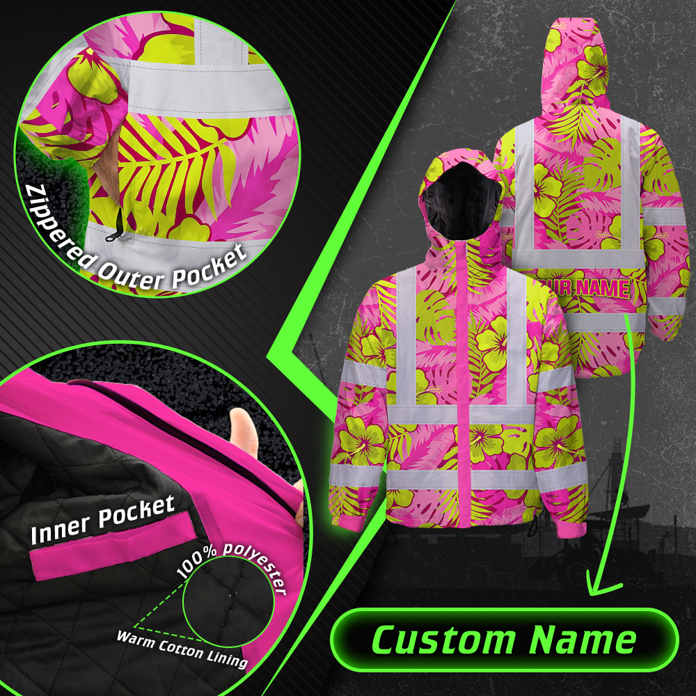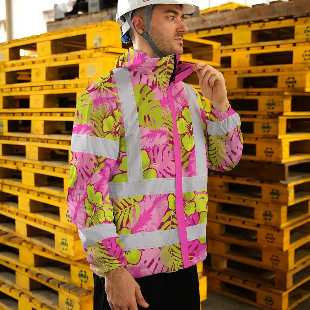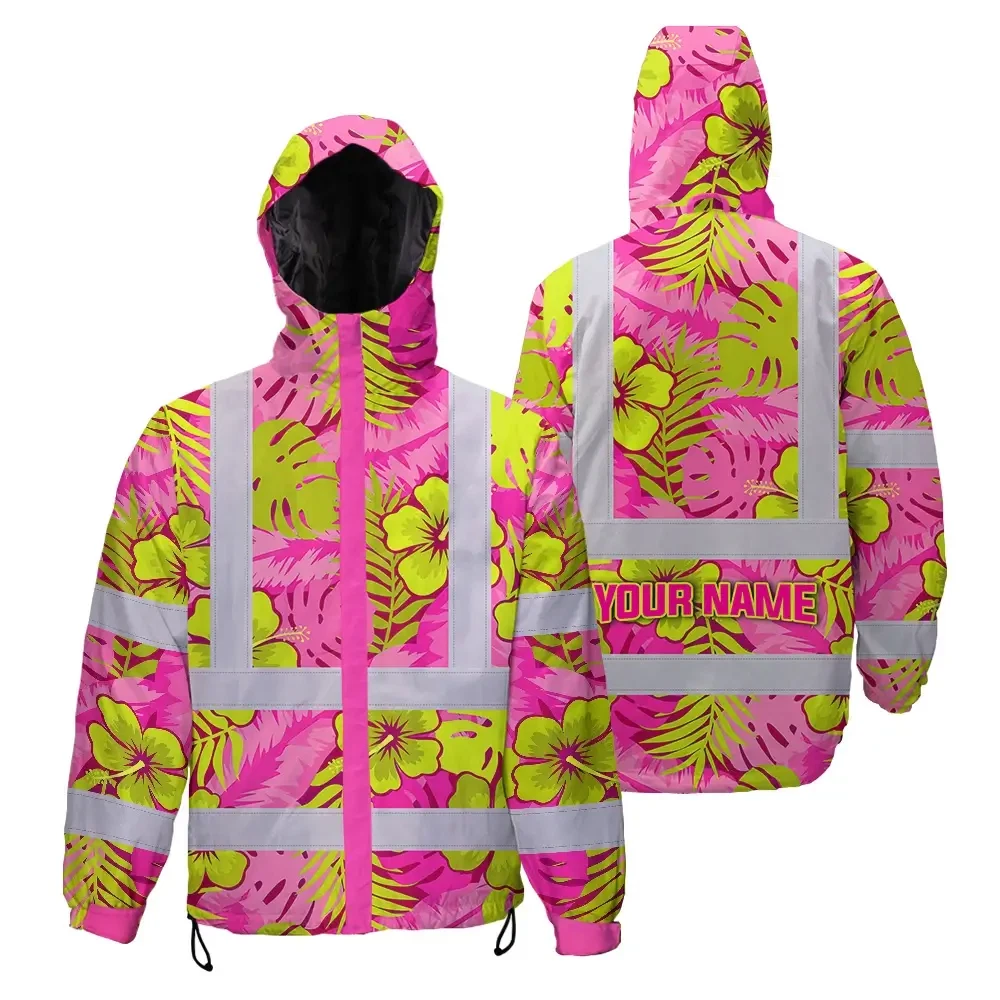 Hi Vis Jacket Waterproof Reflective Tapes Pink Neon And Lime Flowers Custom Name Safety Workwear For Workers, Truckers, Operators