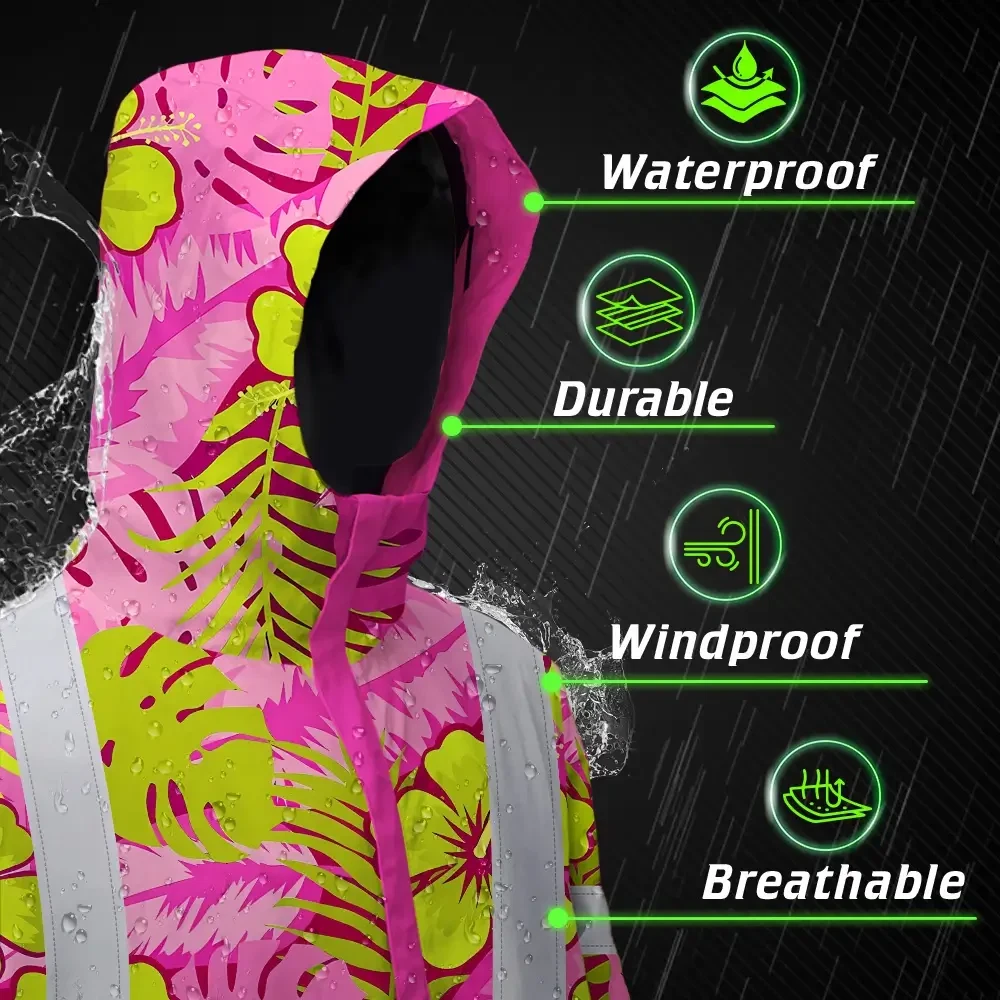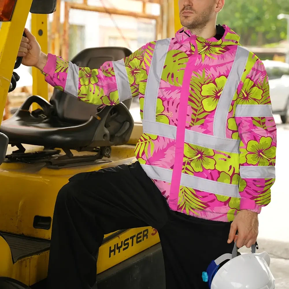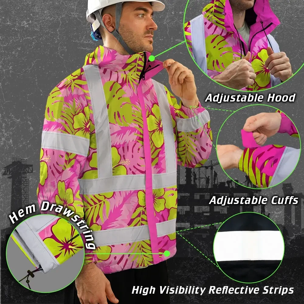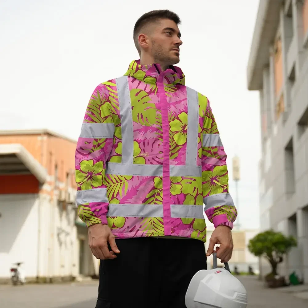Hi Vis Jacket Waterproof Reflective Tapes Pink Neon And Lime Flowers Custom Name Safety Workwear For Workers, Truckers, Operators