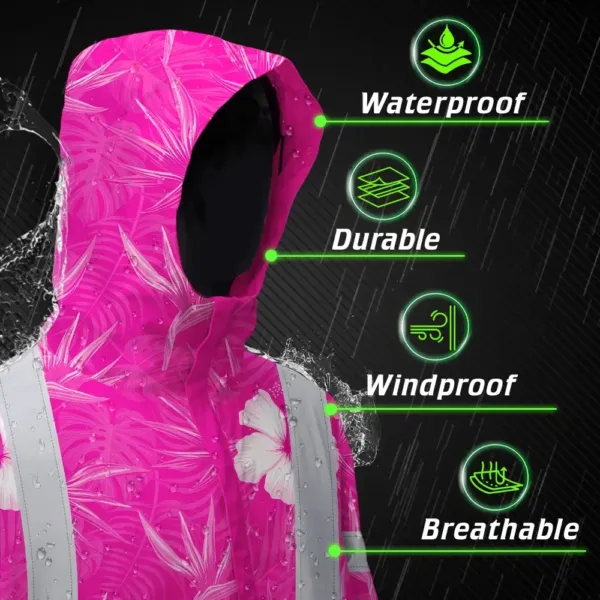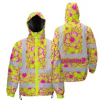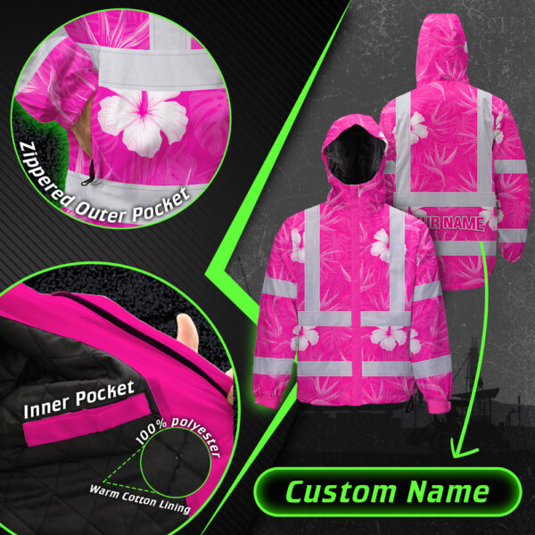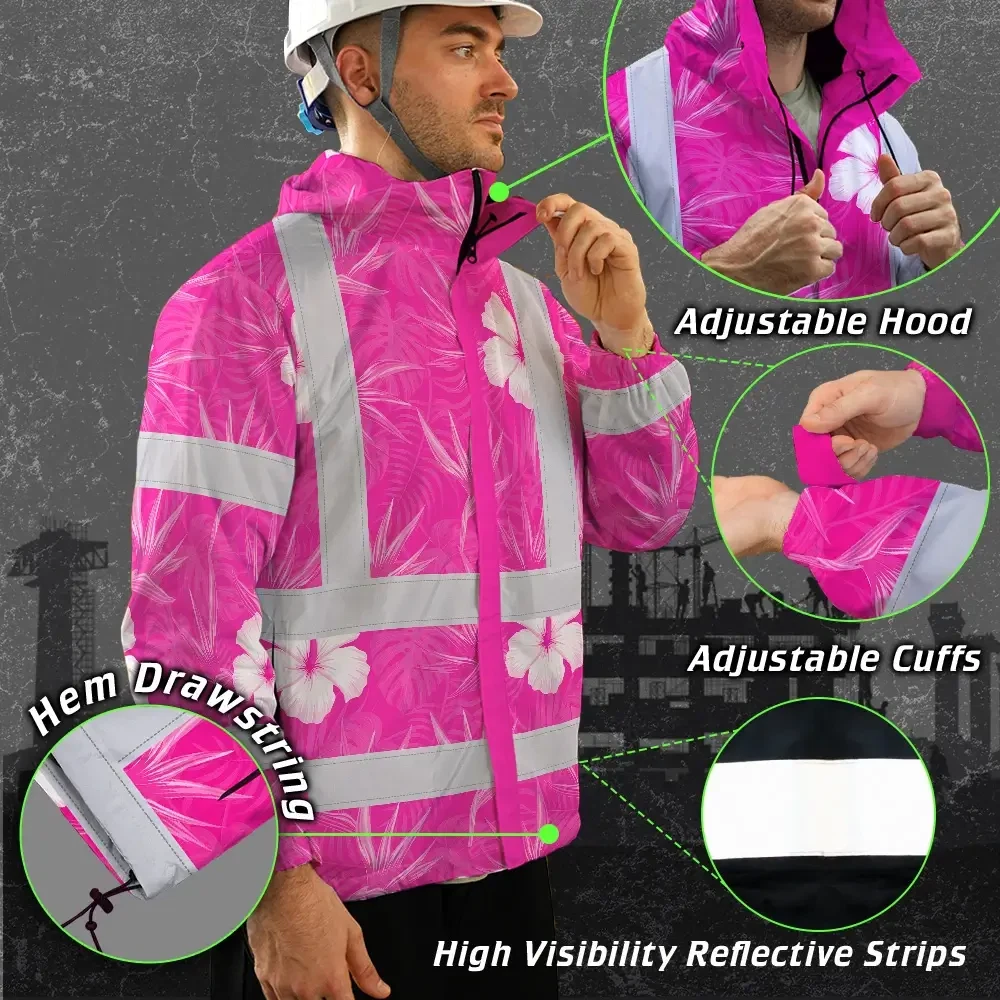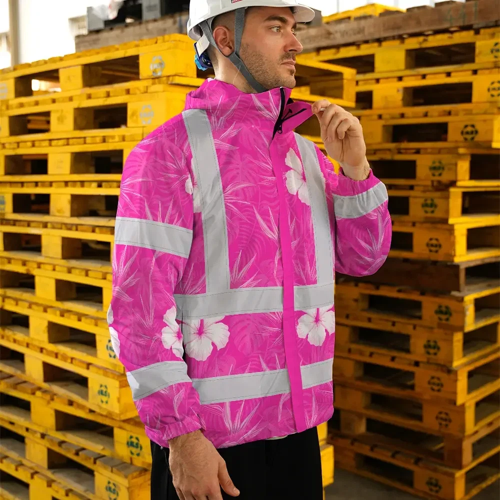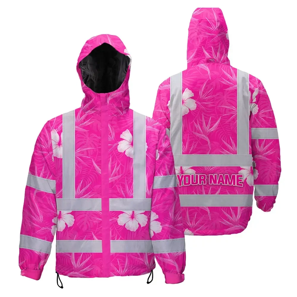 Hi Vis Jacket Waterproof Reflective Tapes Pink Neon Flowers Custom Name Safety Workwear For Workers, Truckers, Operators