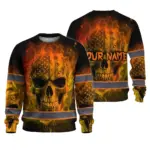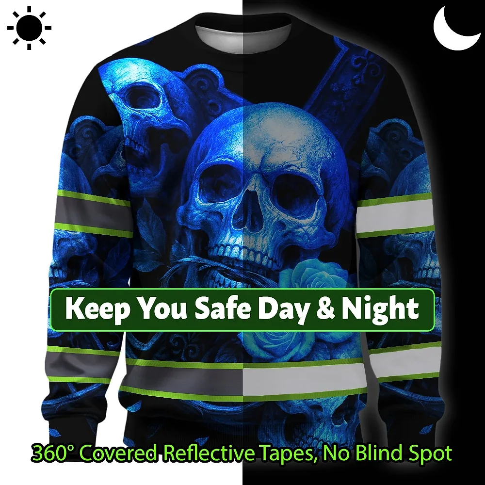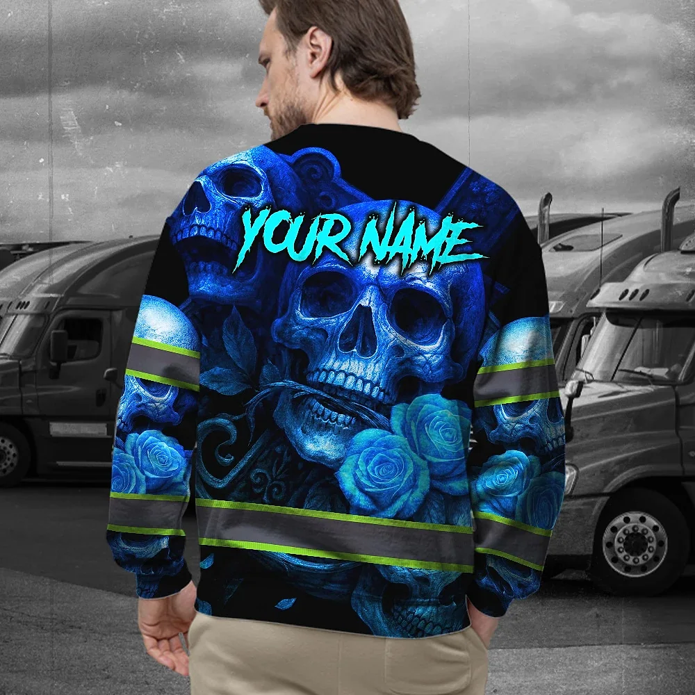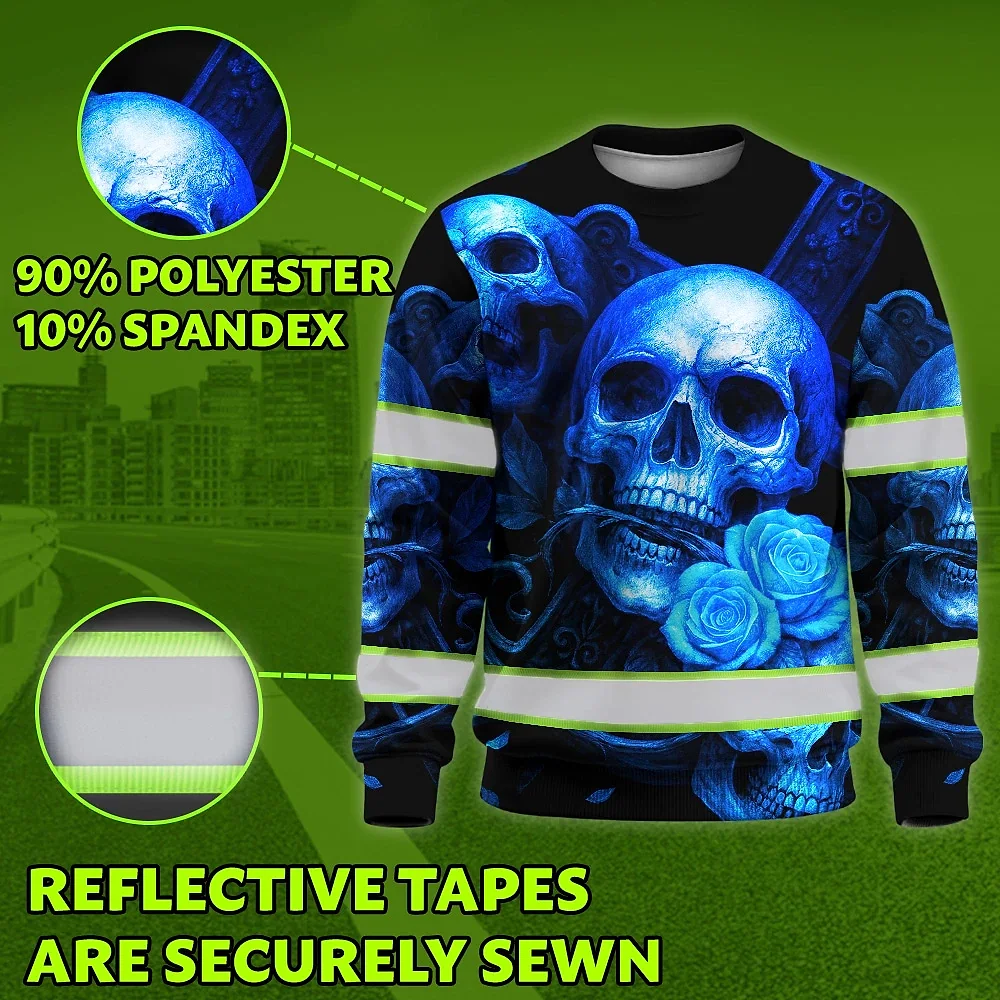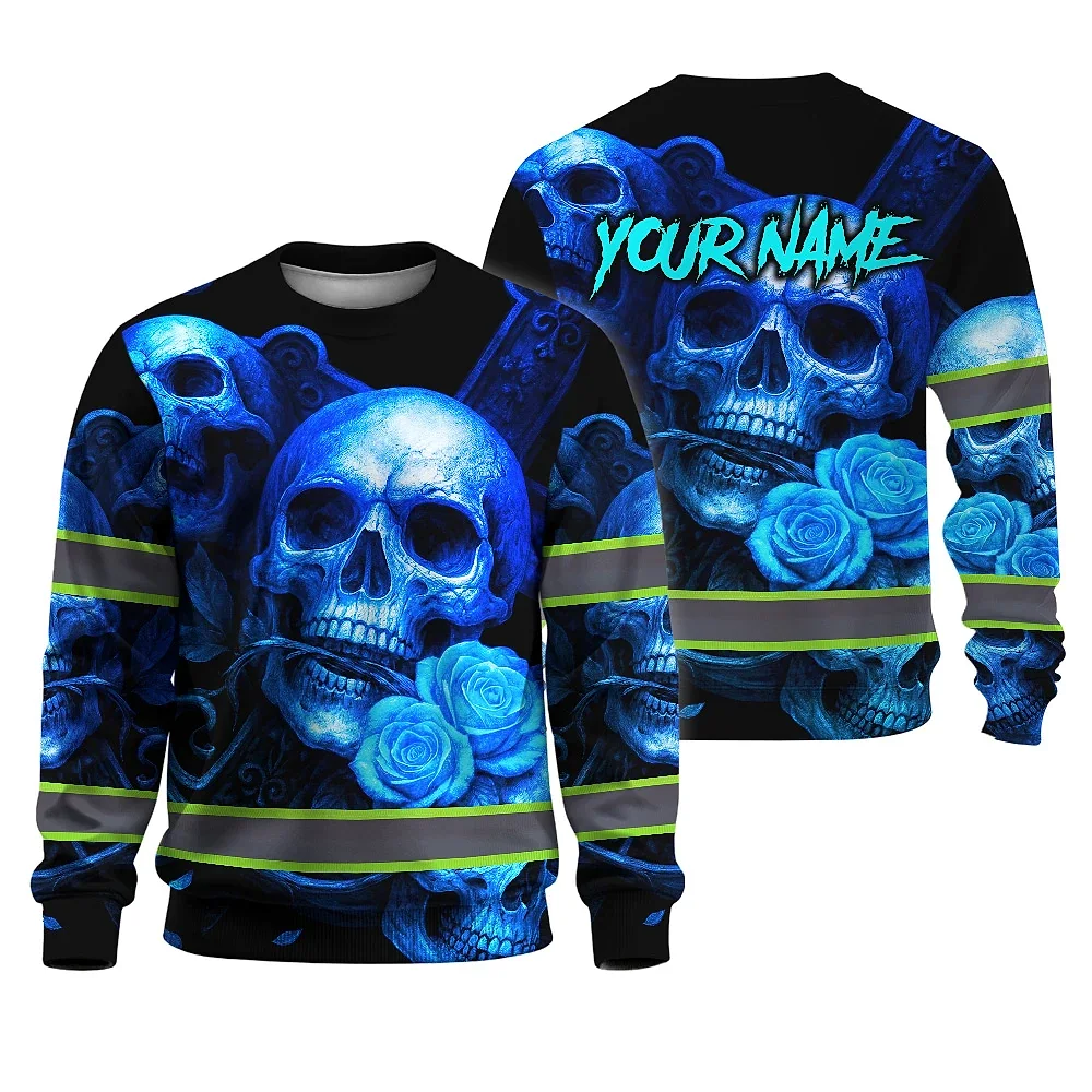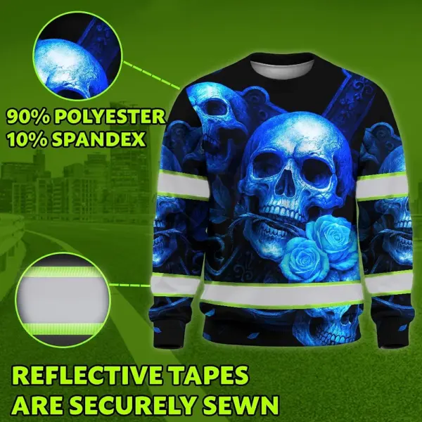 Hi Vis Long Sleeve Reflective Tapes Gradient Blue Neon Skull Custom Name Safety Workwear For Workers, Runners, Cyclists