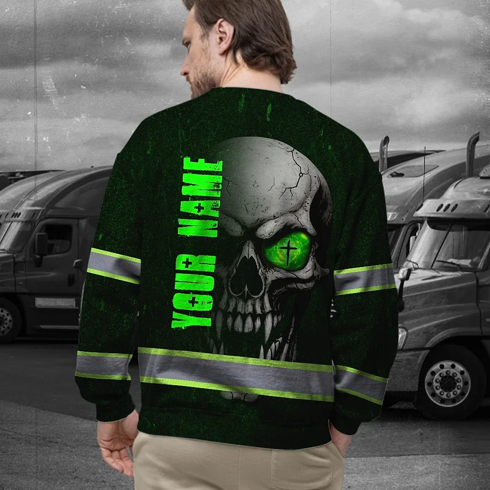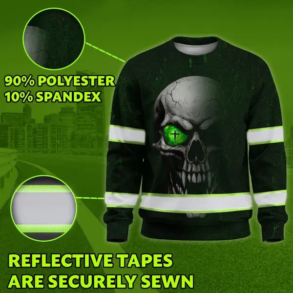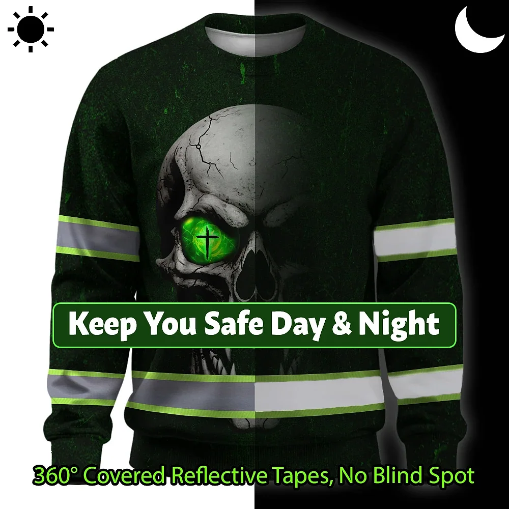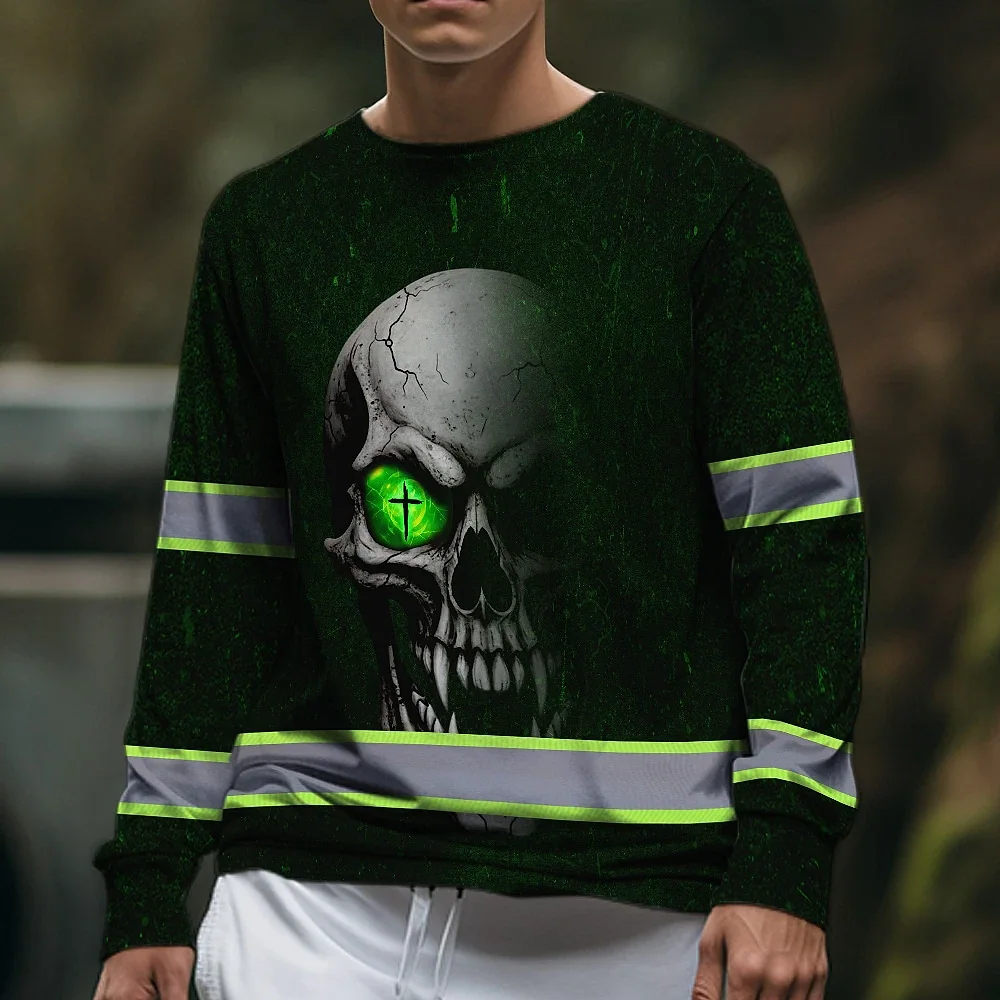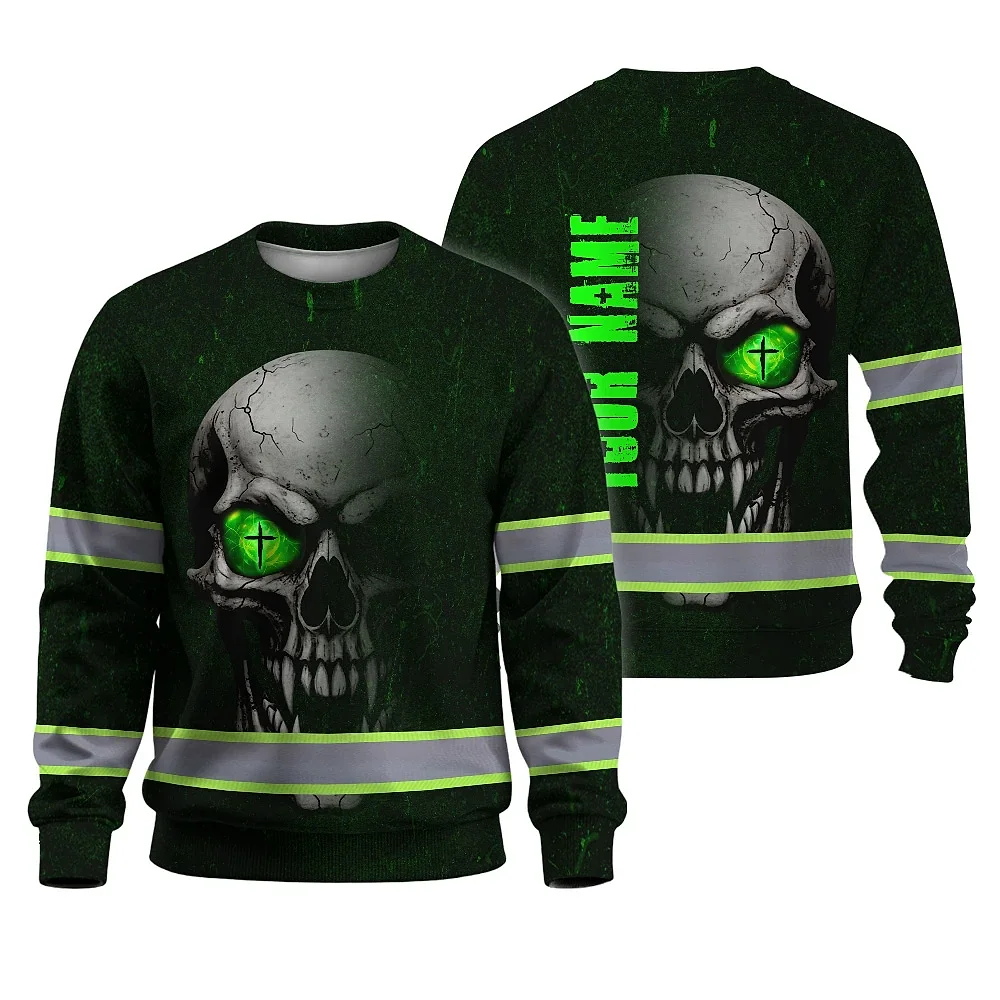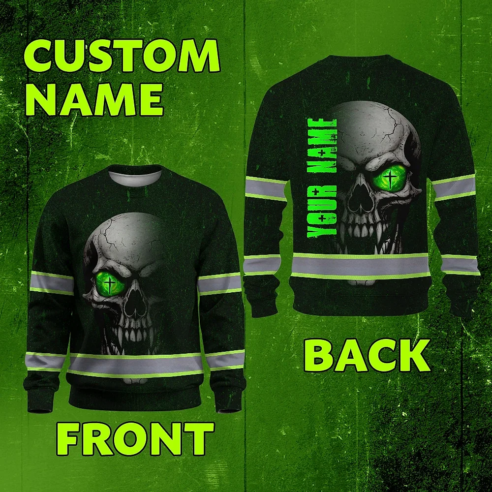 Hi Vis Long Sleeve Reflective Tapes Green Neon Light Skull Custom Name Safety Workwear For Workers, Truckers, Operators