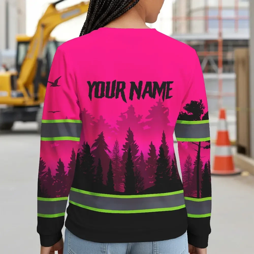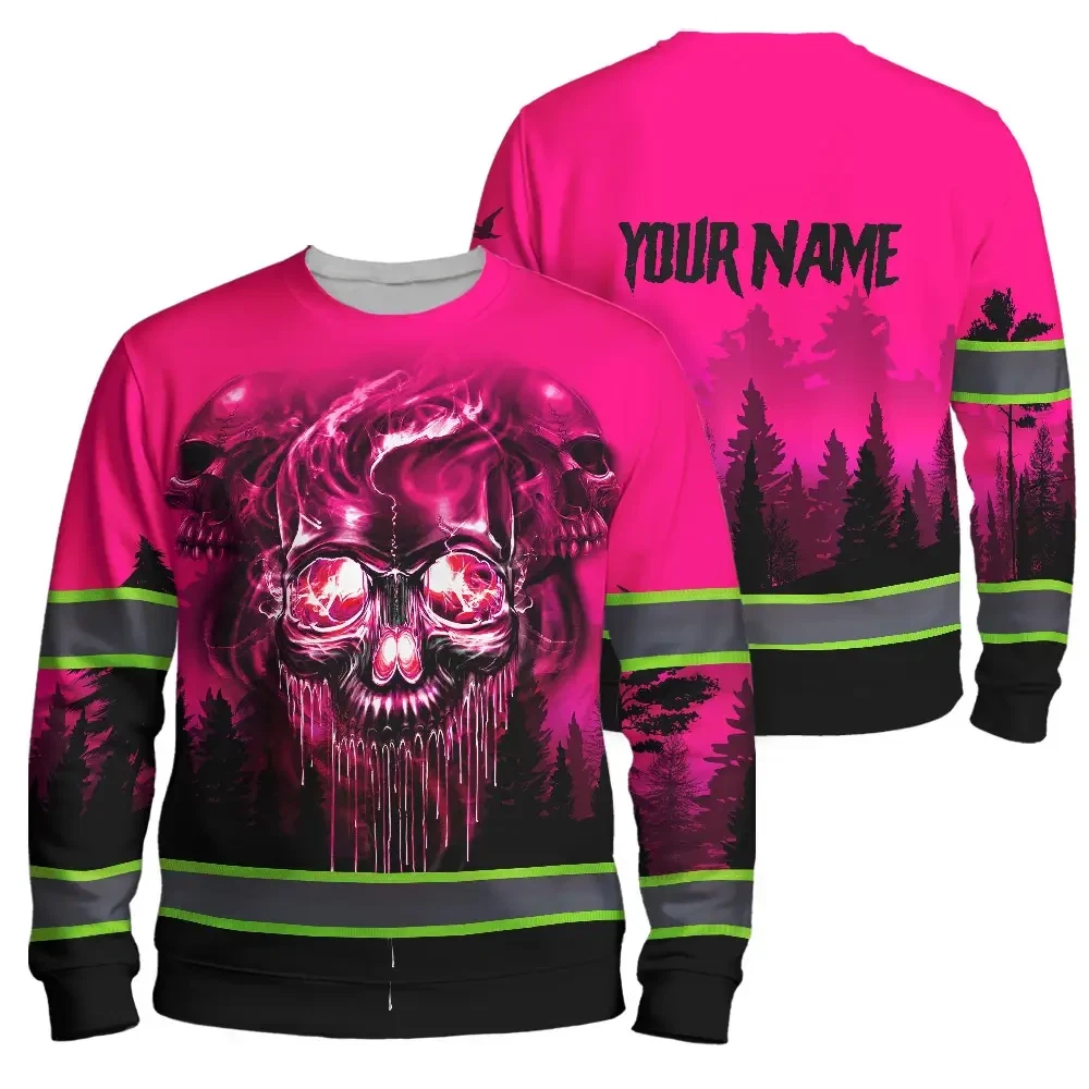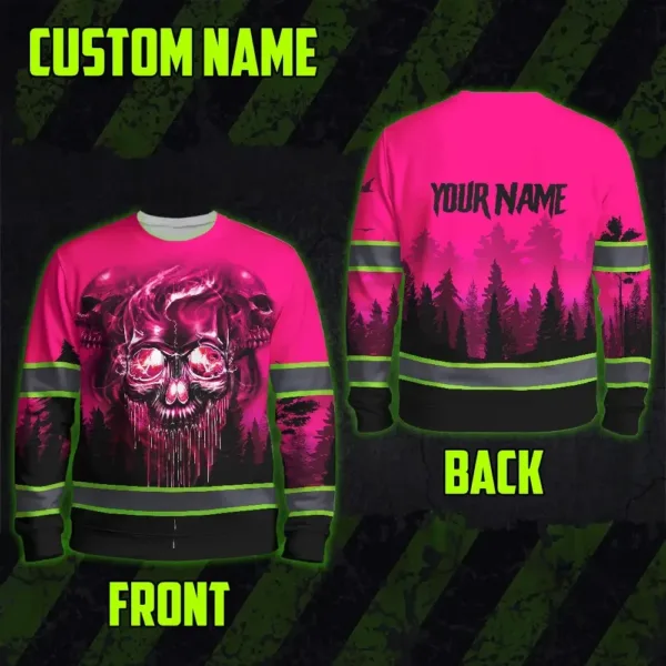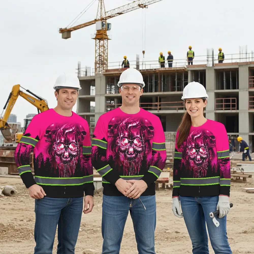 Hi Vis Long Sleeve Reflective Tapes Skull Pink Neon Workwear Safety For Women Men Worker, Trucker, Operator, Skull Lovers, Drivers, Runners