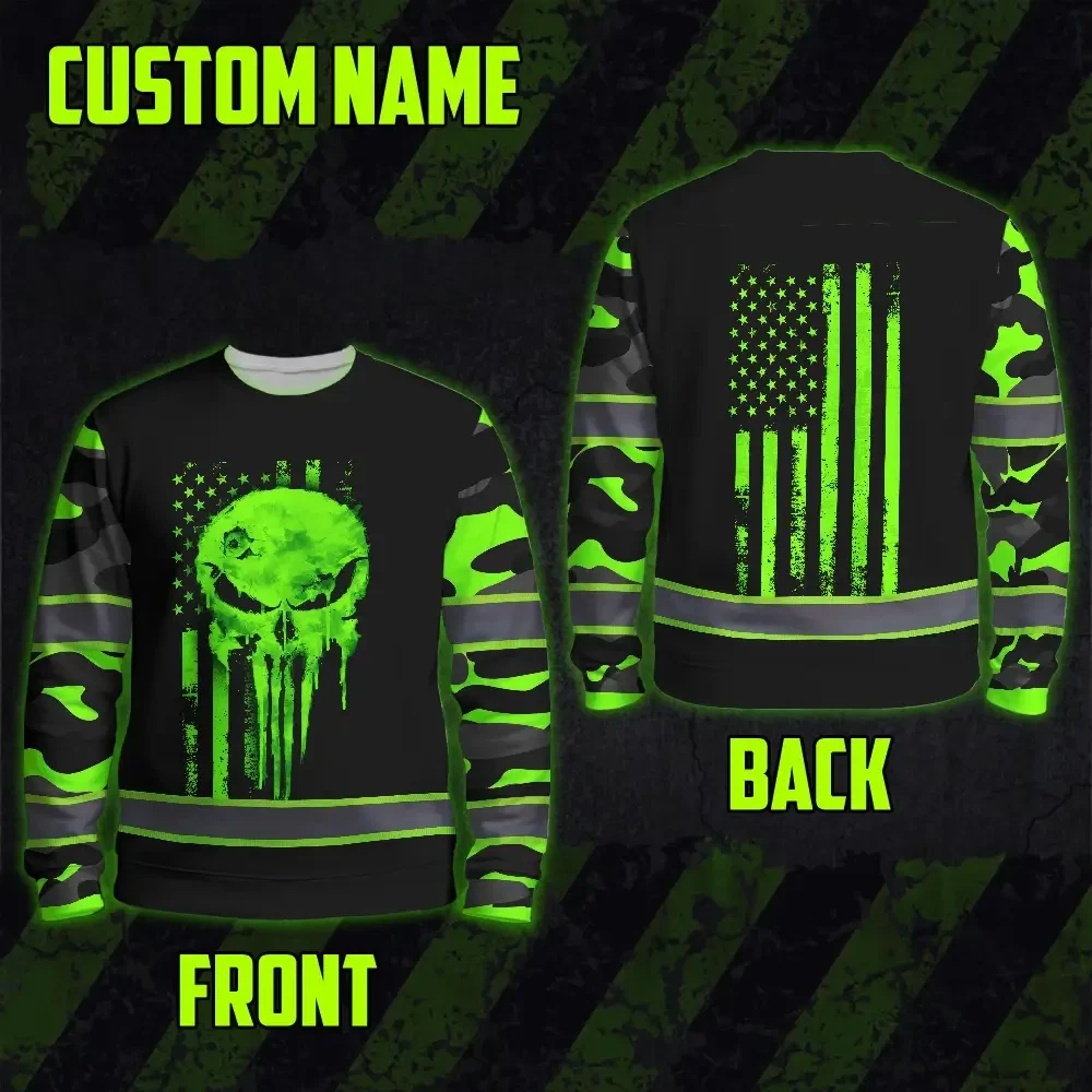 Hi Vis Long Sleeve Reflective US Flag Camo Skull Custom Name Safety Workwear For Runners, Truckers, Skull Lovers