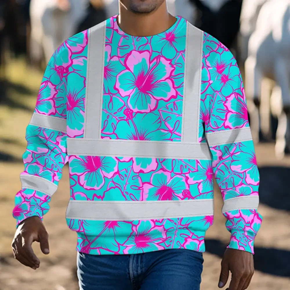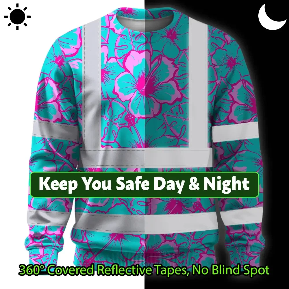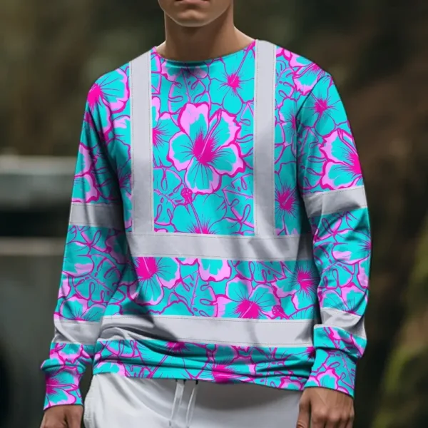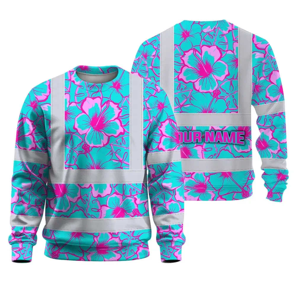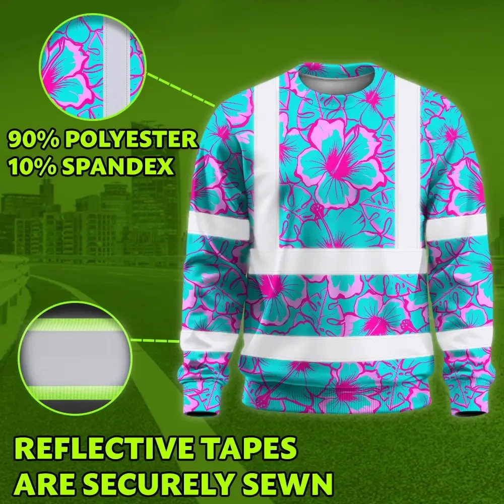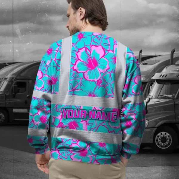 Hi Vis Long Sleeve Shirt Reflective Tapes Blue Neon And Pink Flowers Custom Name Safety Workwear For Workers, Truckers, Operators