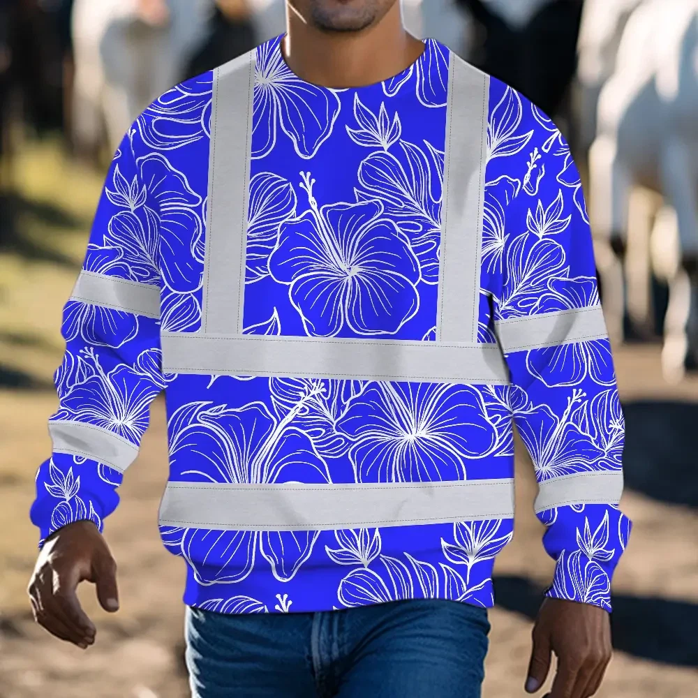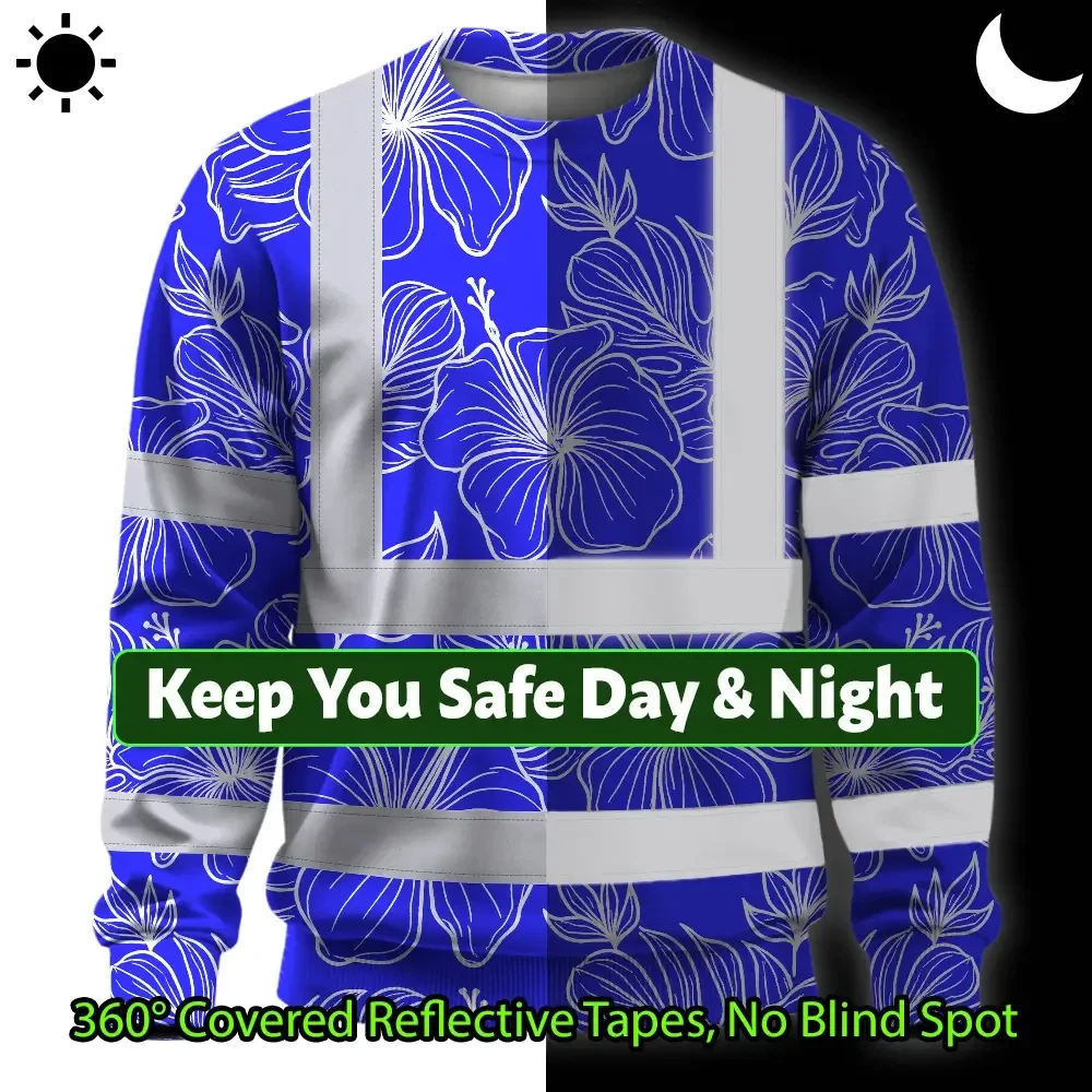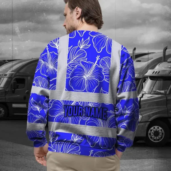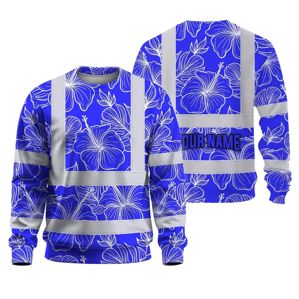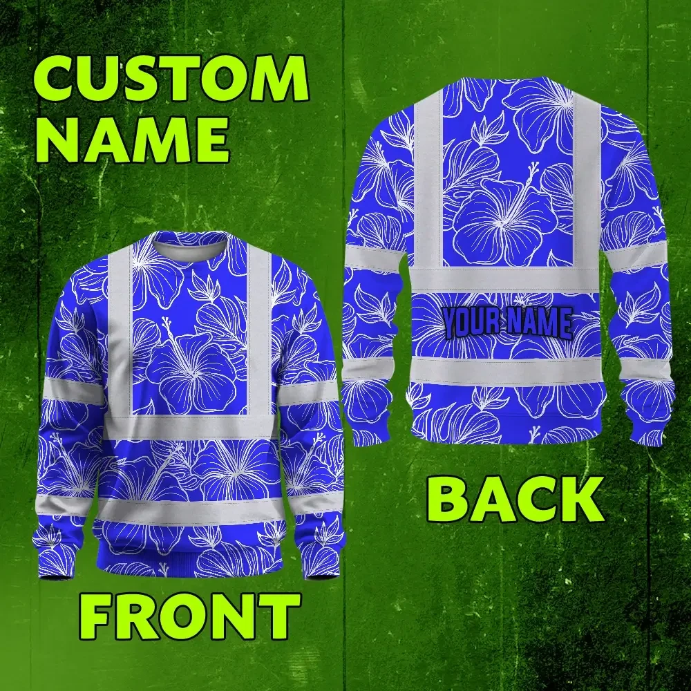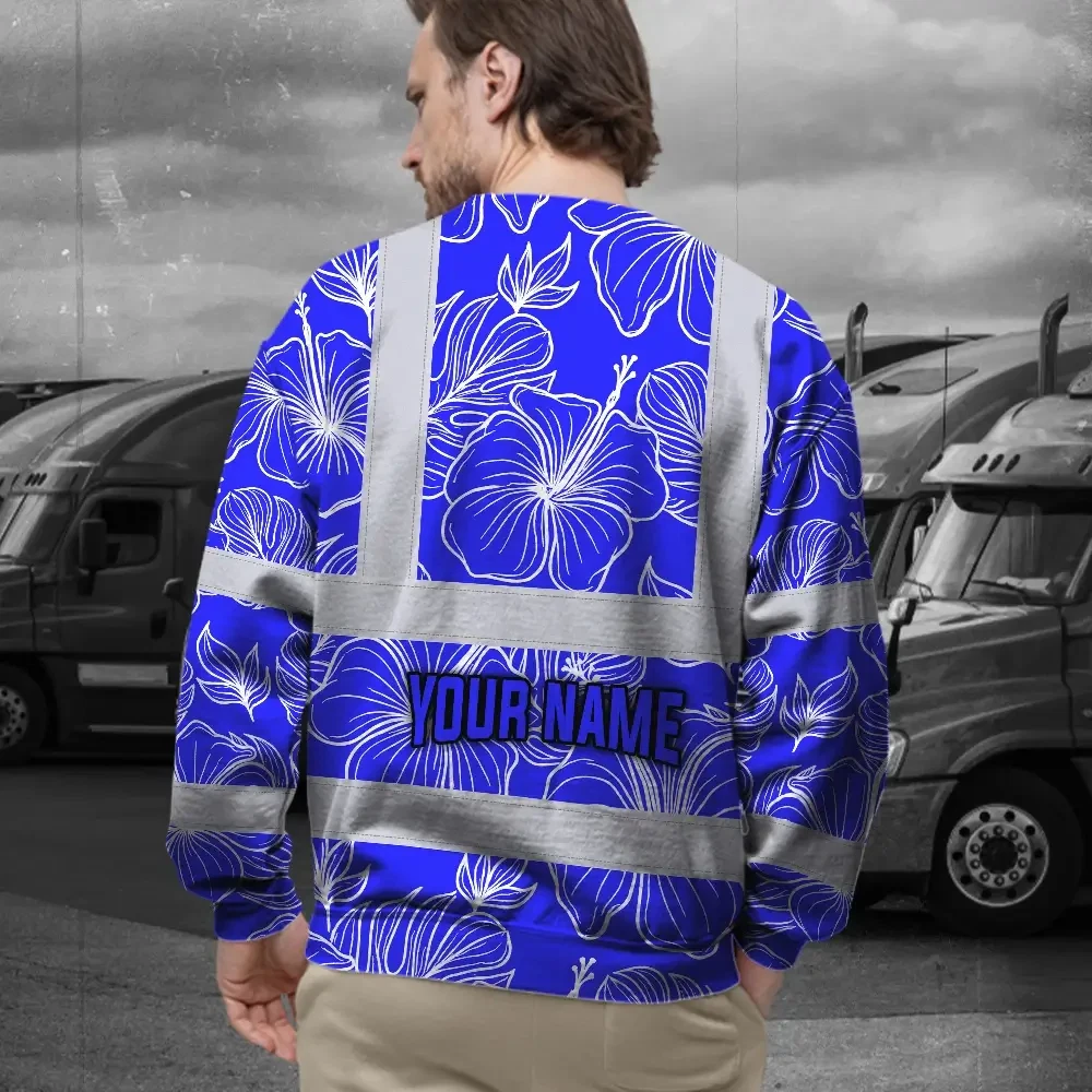 Hi Vis Long Sleeve Shirt Reflective Tapes Blue Neon Flowers Custom Name Safety Workwear For Workers, Truckers, Operators