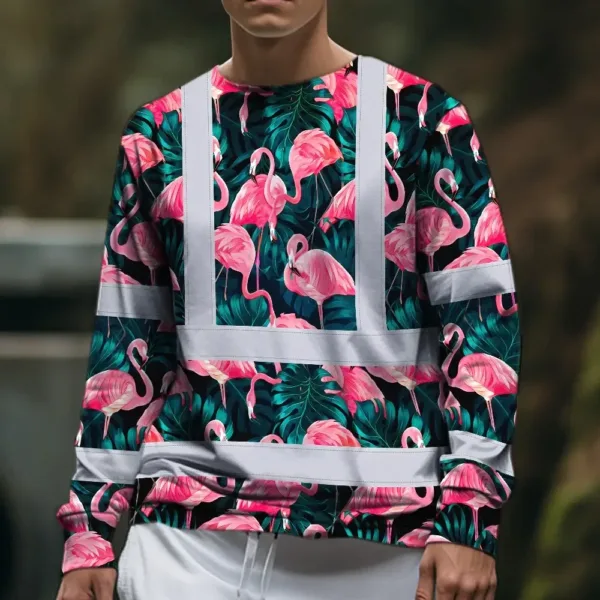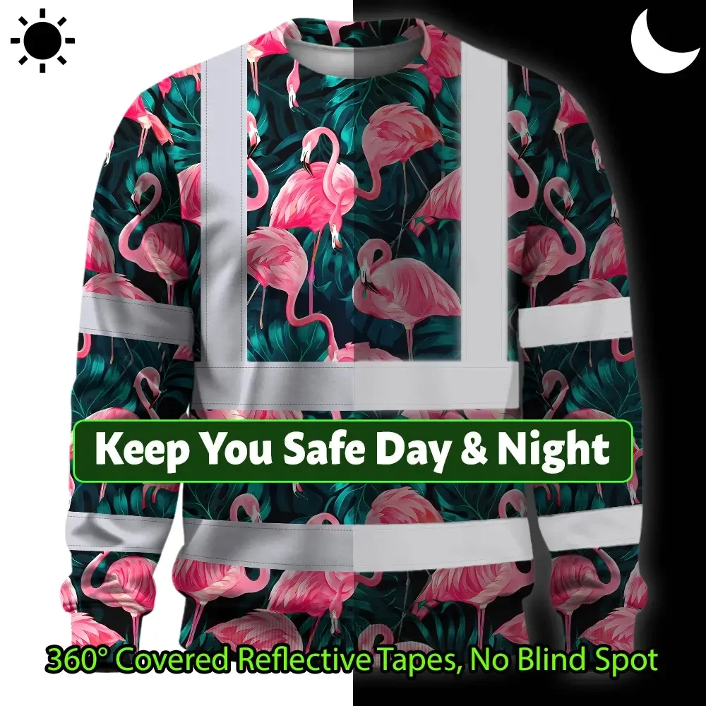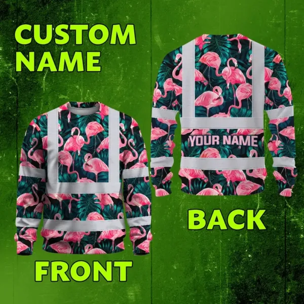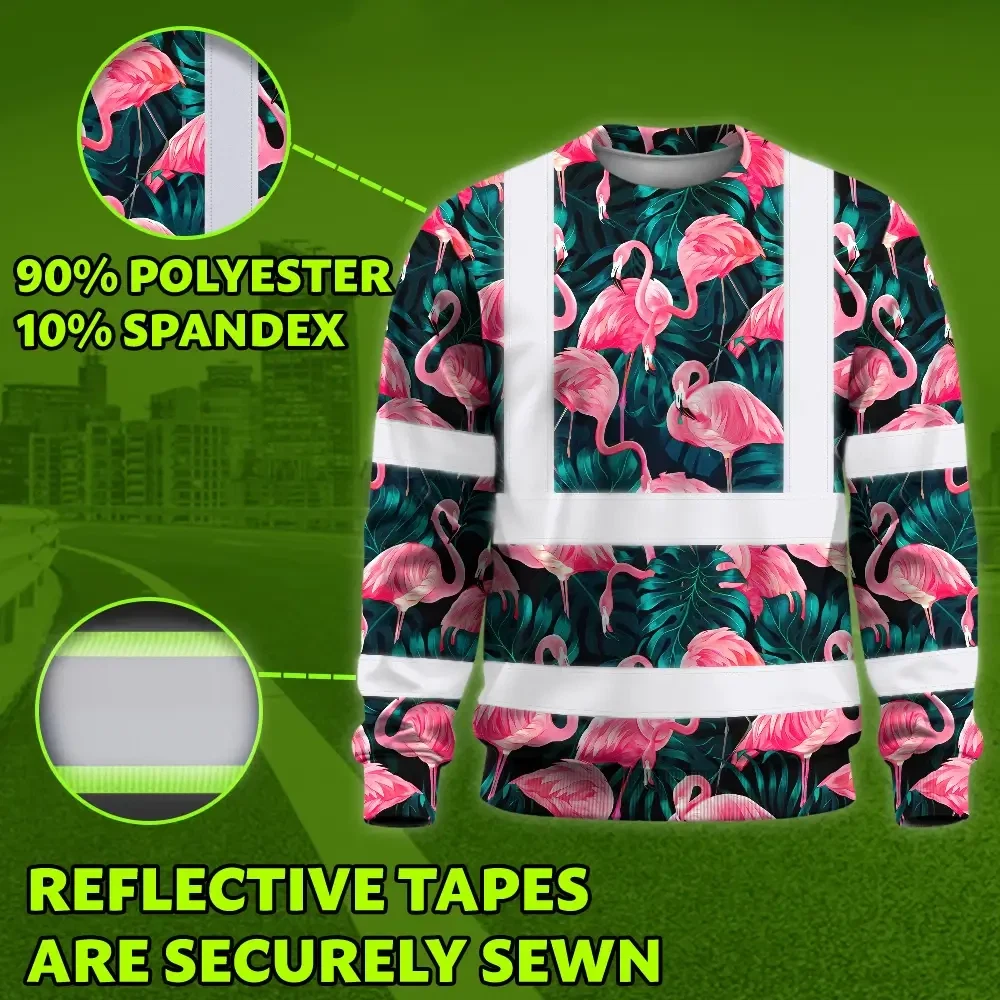 Hi Vis Long Sleeve Shirt Reflective Tapes Hawaii Flamingo Custom Name Safety Workwear For Workers, Truckers, Operators