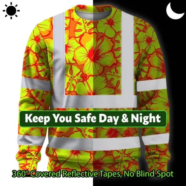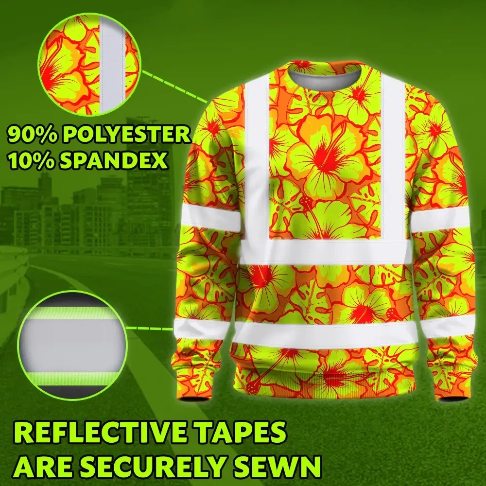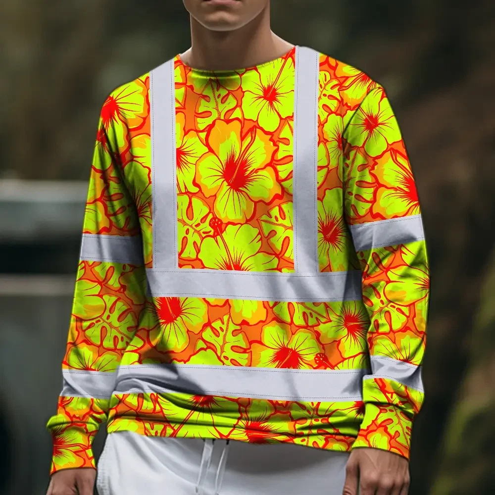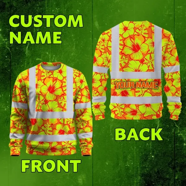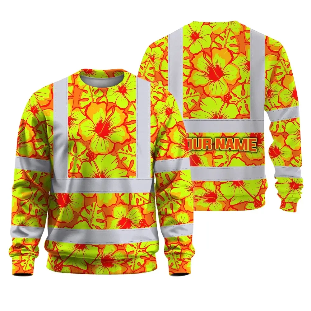 Hi Vis Long Sleeve Shirt Reflective Tapes Orange Neon And Yellow Flowers Custom Name Safety Workwear For Workers, Truckers, Operators
