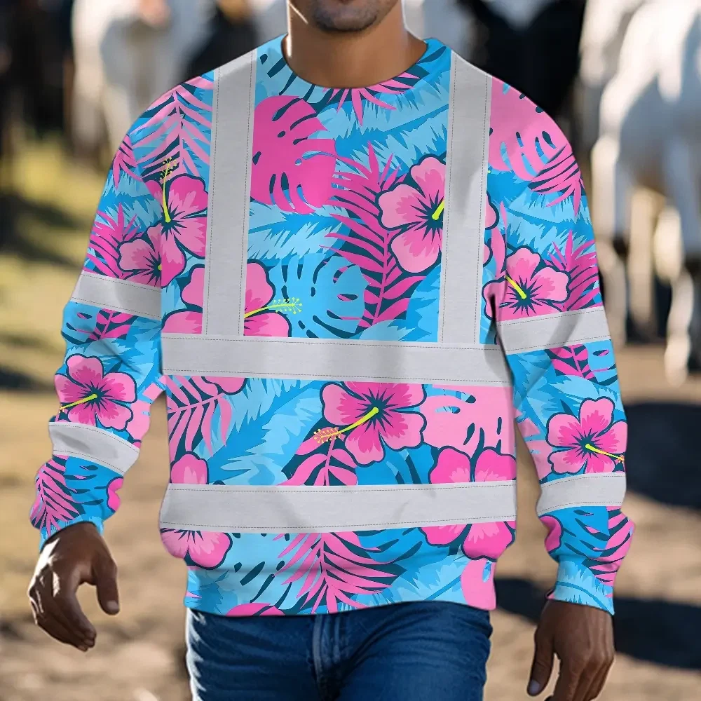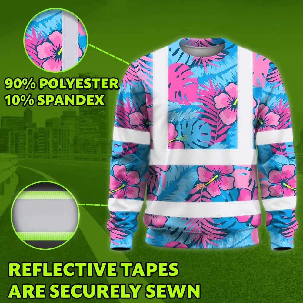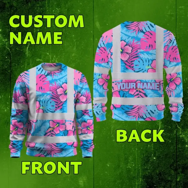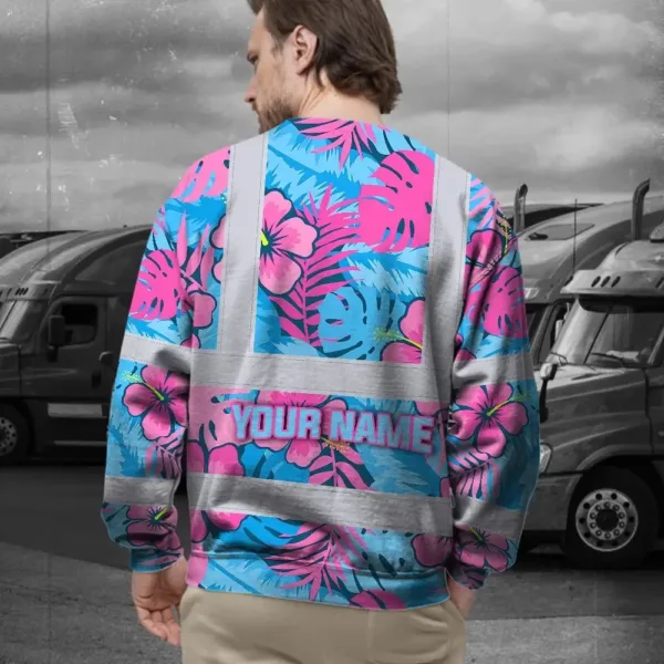 Hi Vis Long Sleeve Shirt Reflective Tapes Pink Neon And Blue Flowers Custom Name Safety Workwear For Workers, Truckers, Operators