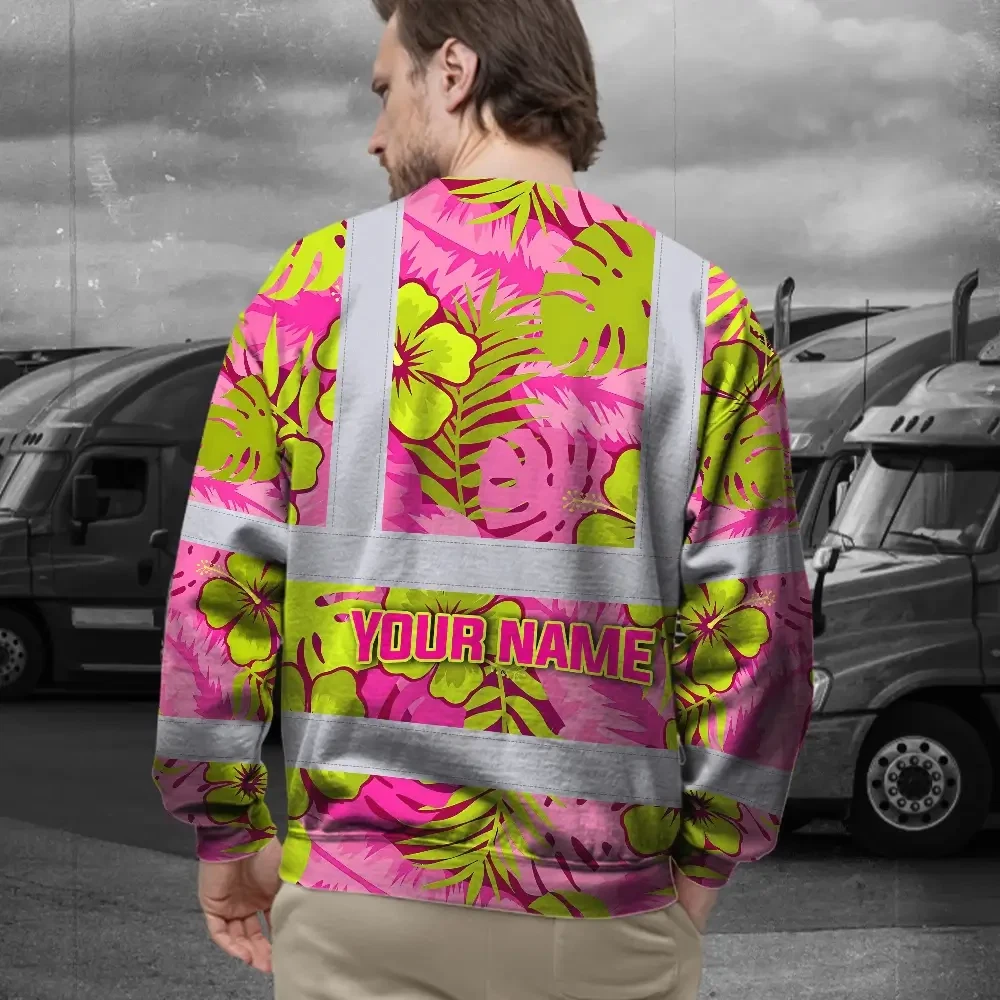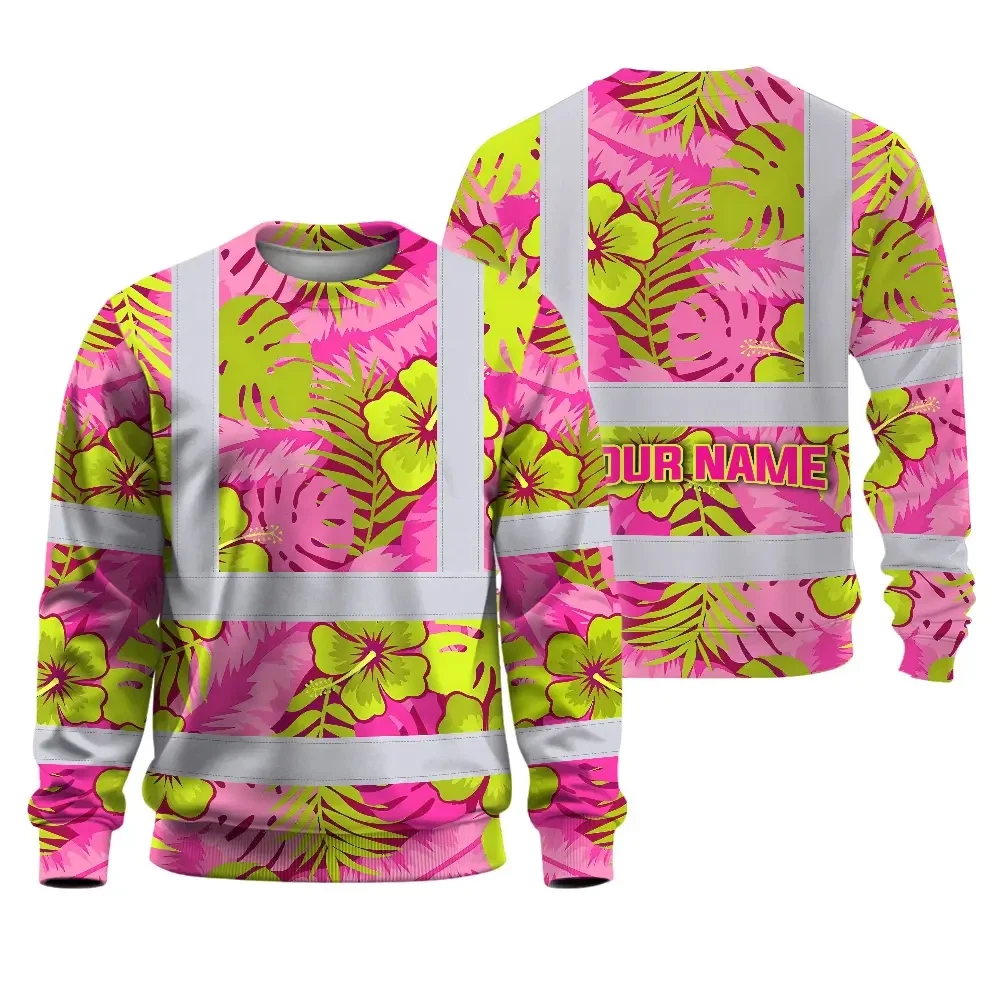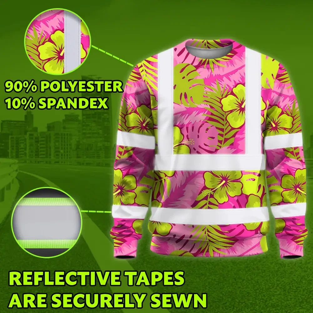 Hi Vis Long Sleeve Shirt Reflective Tapes Pink Neon And Lime Flowers Custom Name Safety Workwear For Workers, Truckers, Operators