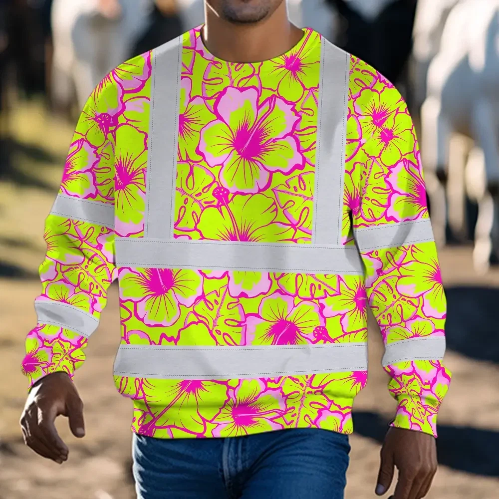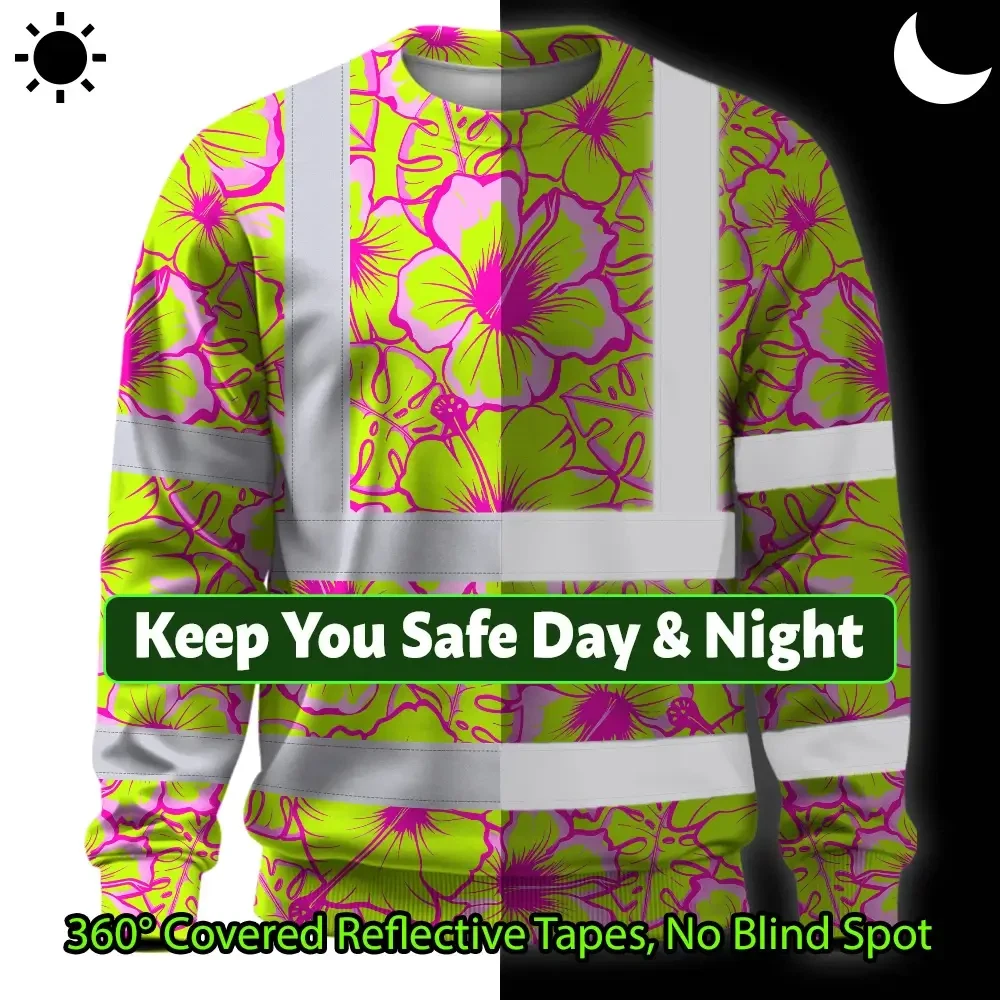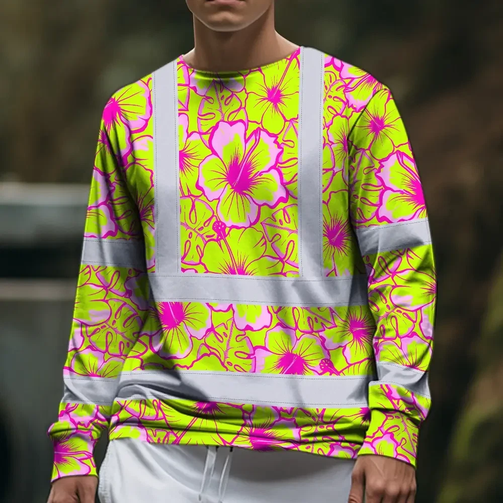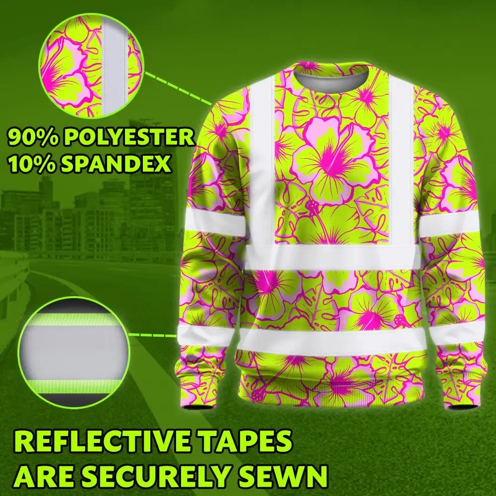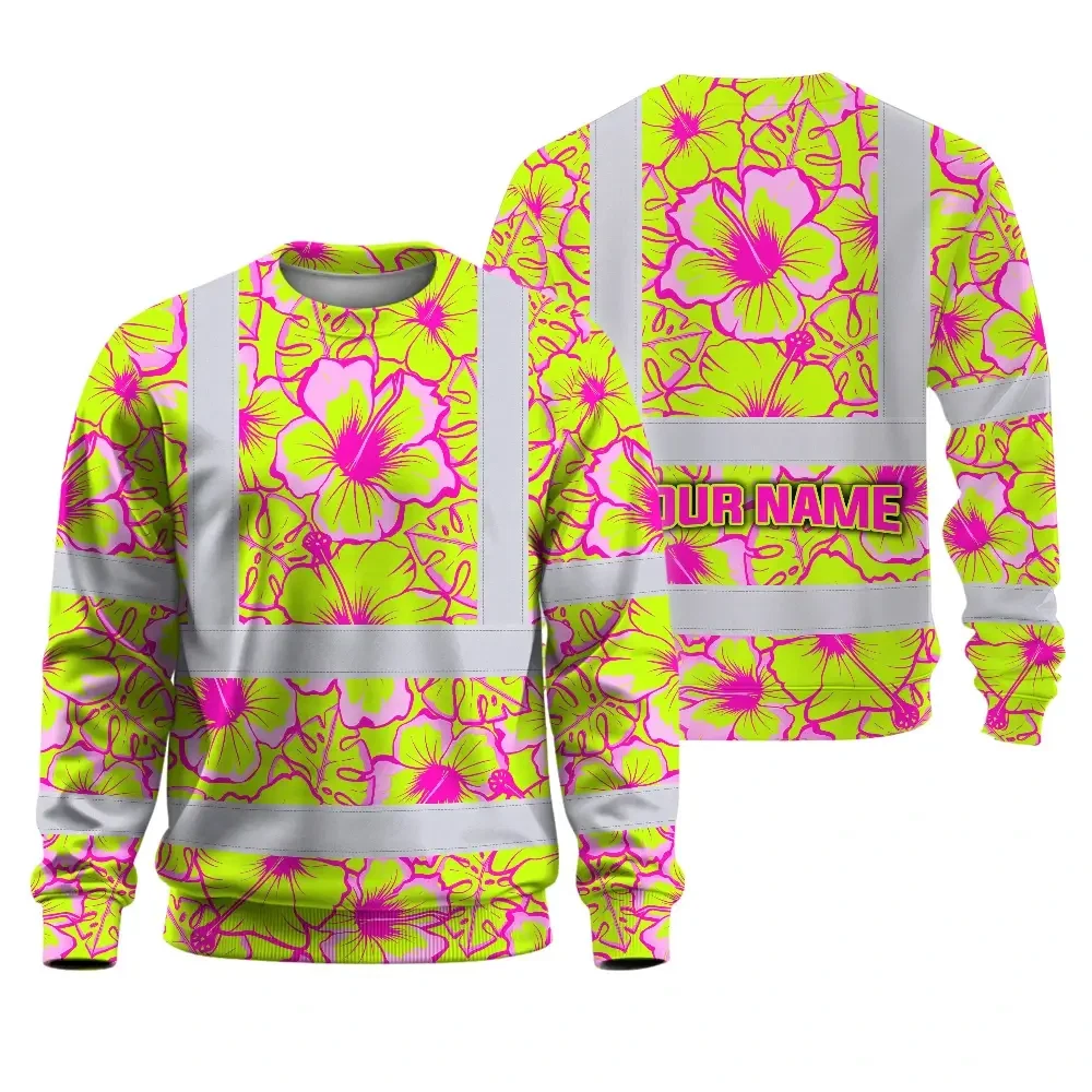 Hi Vis Long Sleeve Shirt Reflective Tapes Pink Neon And Lime Flowers Custom Name Safety Workwear For Workers, Truckers, Operators