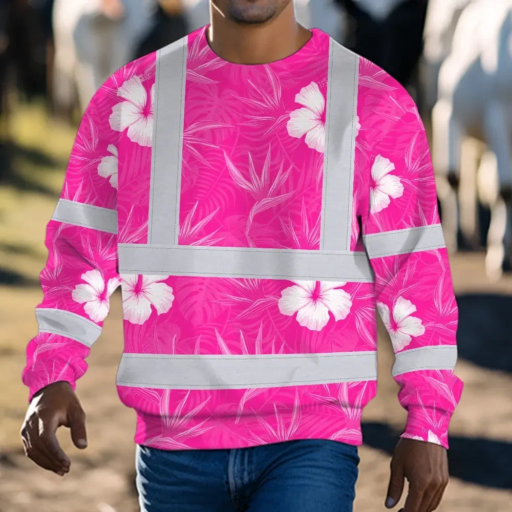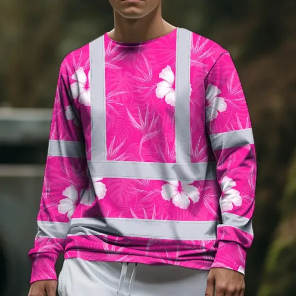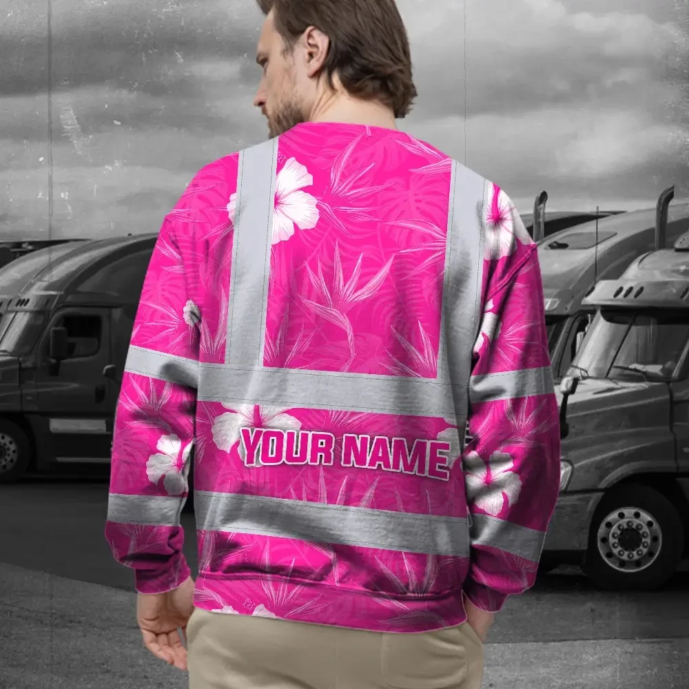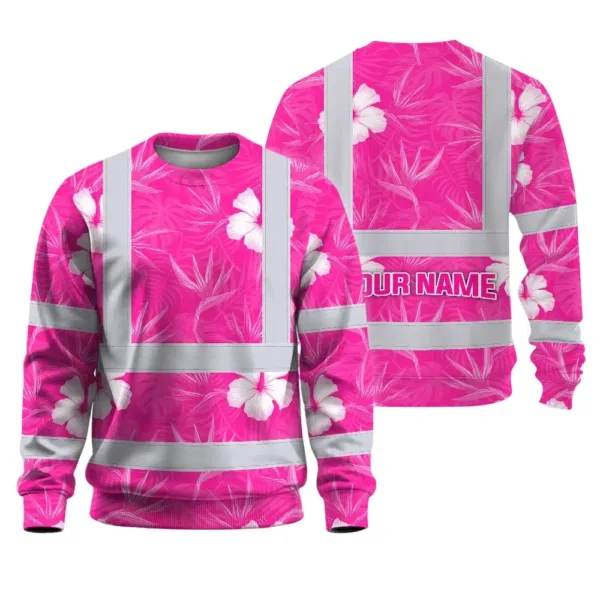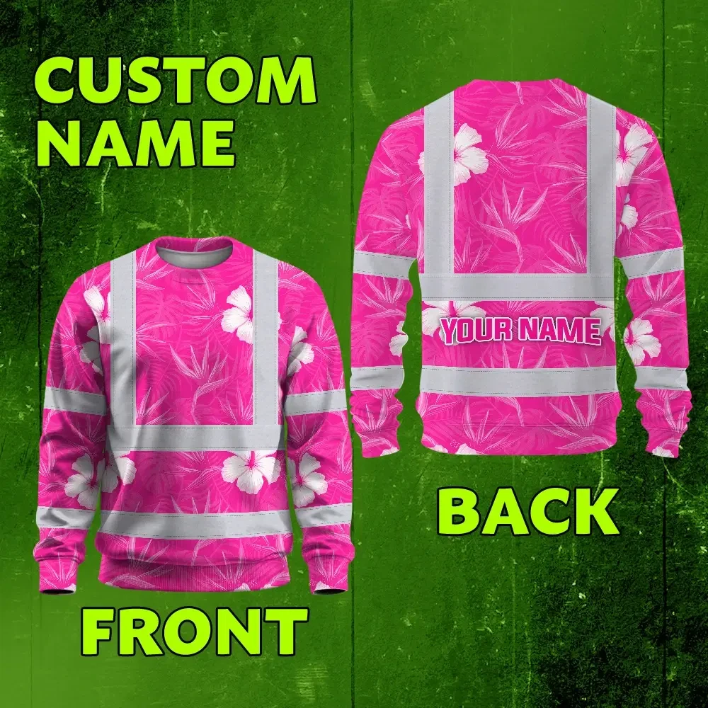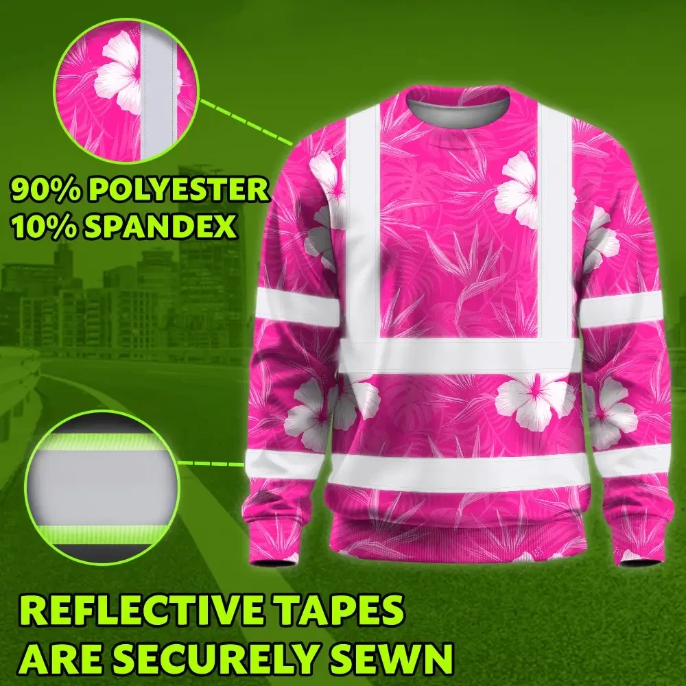 Hi Vis Long Sleeve Shirt Reflective Tapes Pink Neon Flowers Custom Name Safety Workwear For Workers, Truckers, Operators