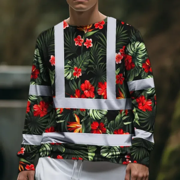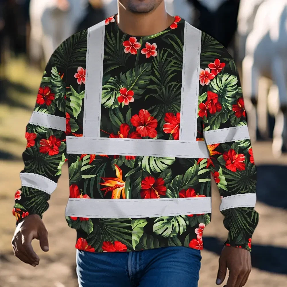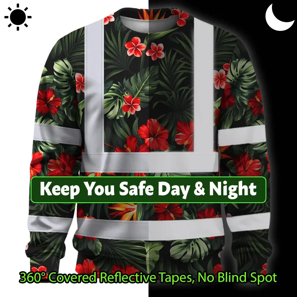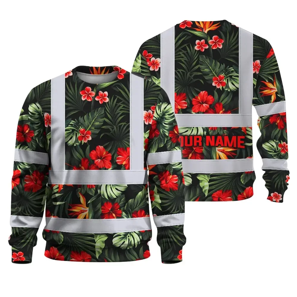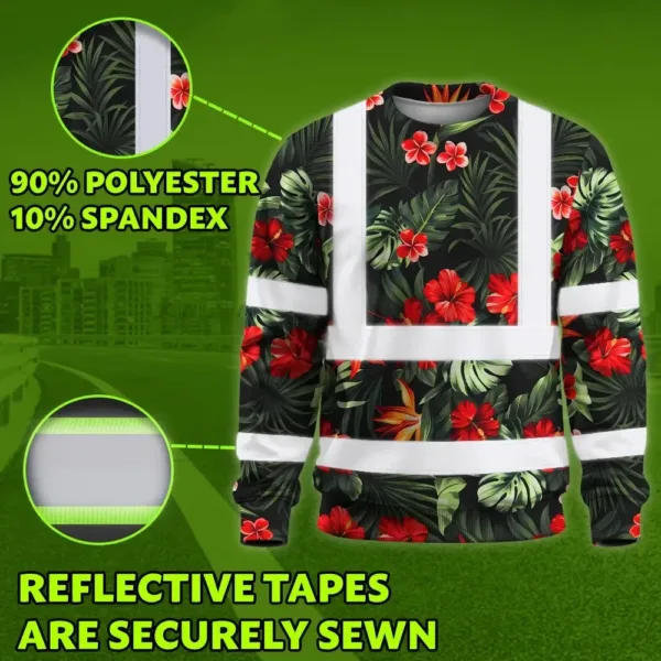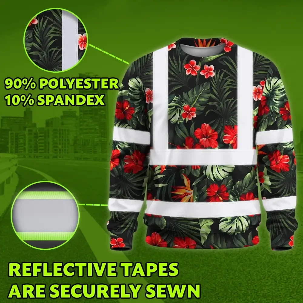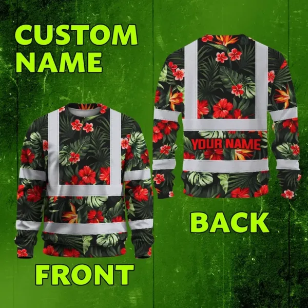 Hi Vis Long Sleeve Shirt Reflective Tapes Red Neon Flowers Custom Name Safety Workwear For Workers, Truckers, Operators
