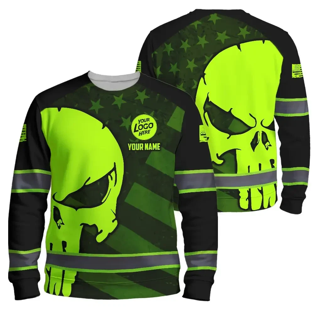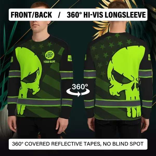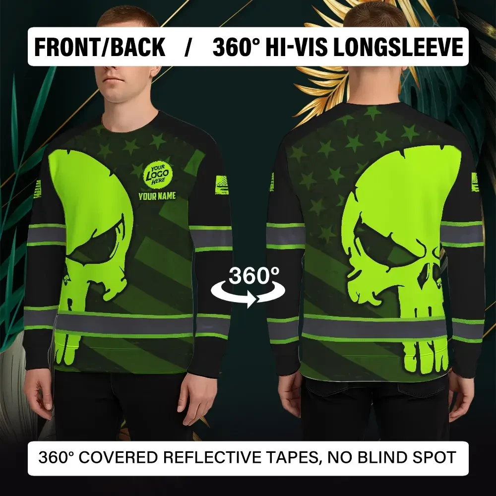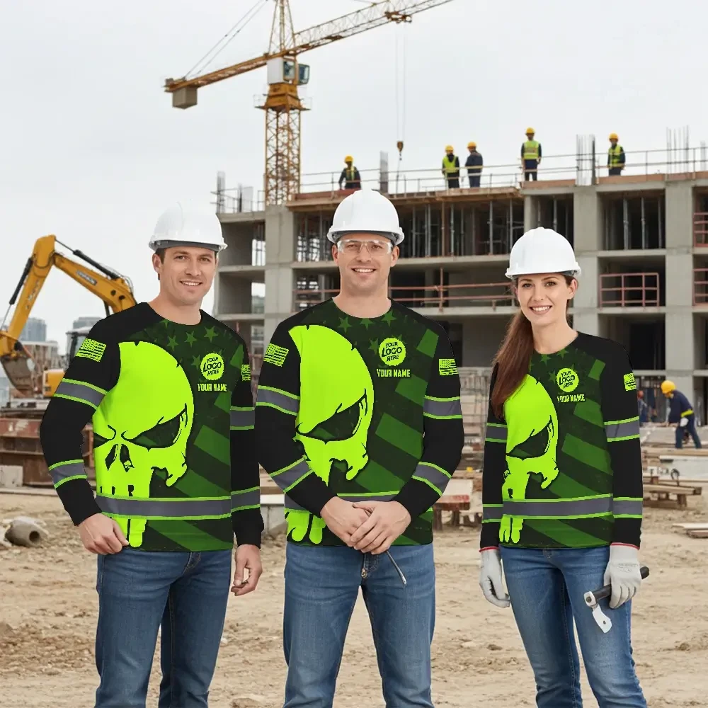 Hi Vis Long Sleeve Shirt Skull USA Flag Custom Name Safety Workwear American Flag Neon Purple