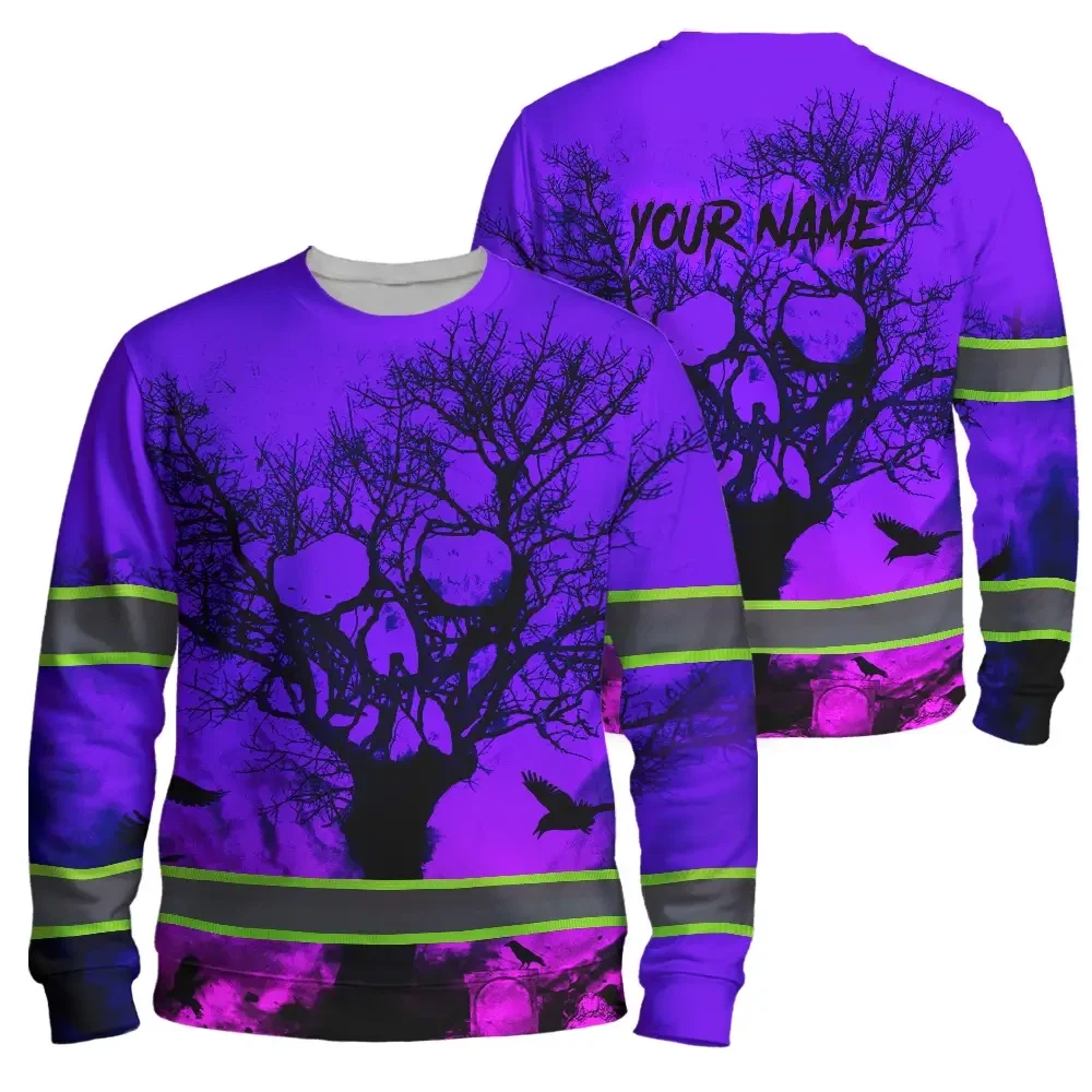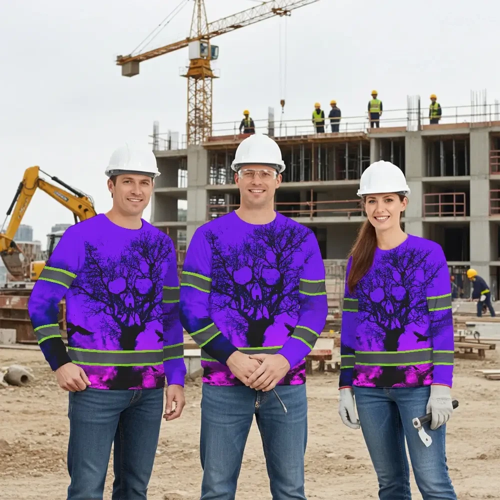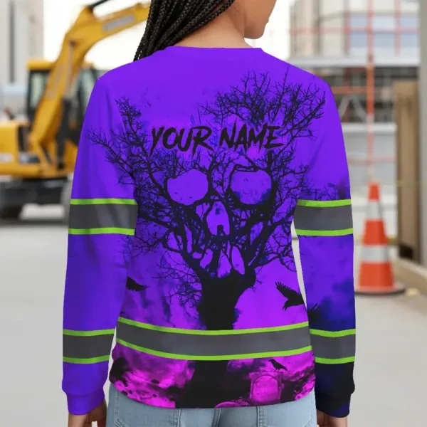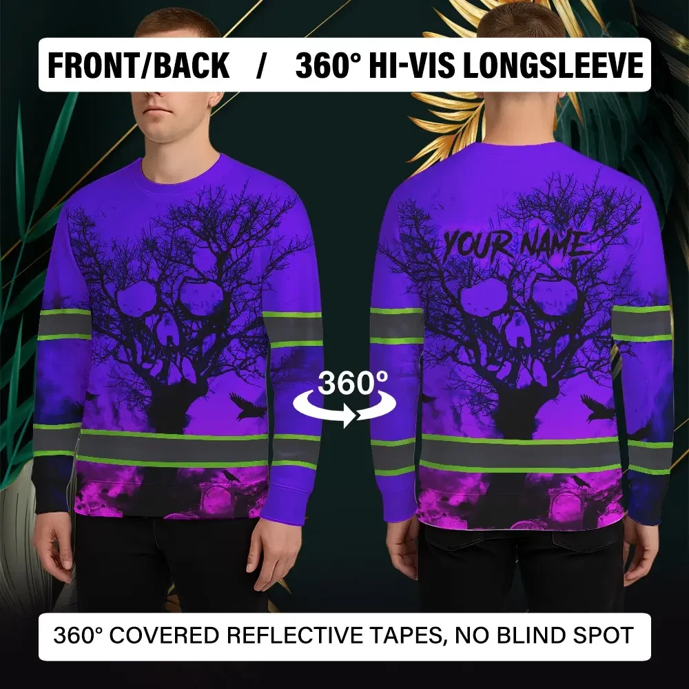 Hi Vis Long Sleeve Shirt With Violet Neon Forest Skull And Custom Name For Safety Workwear