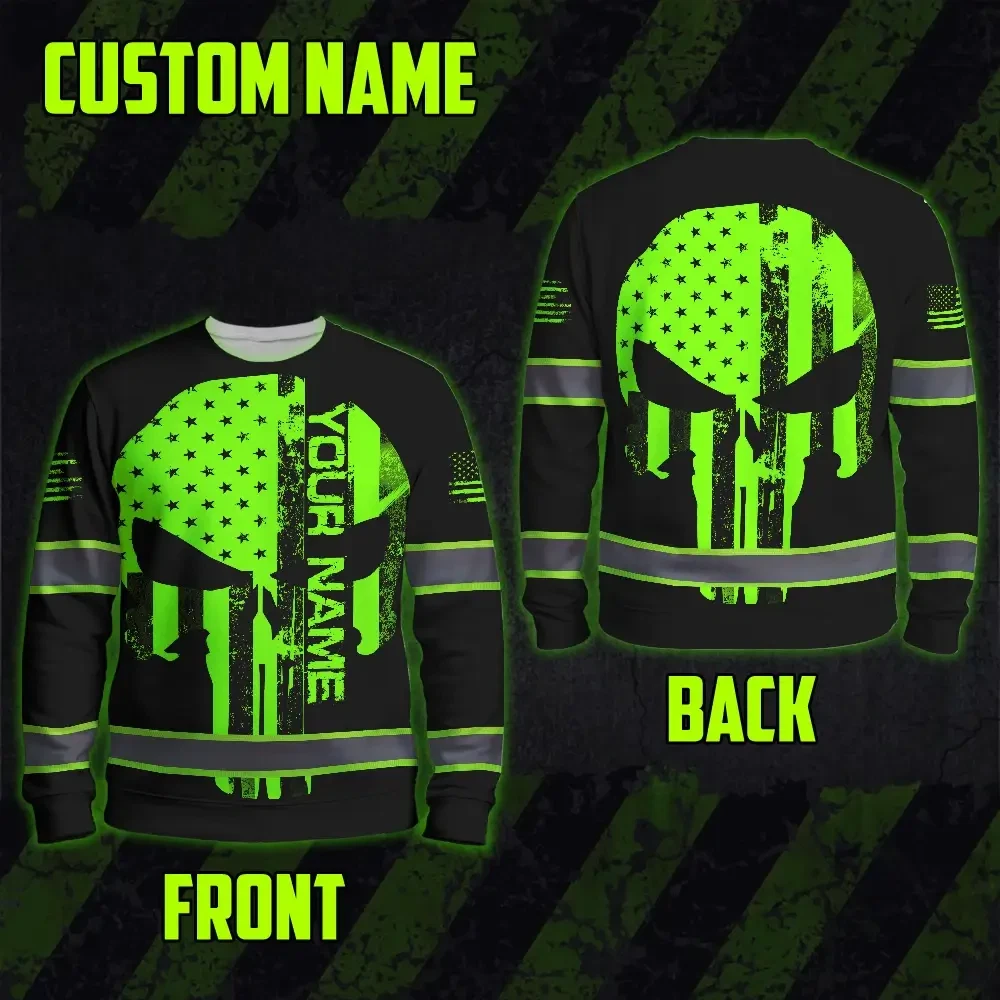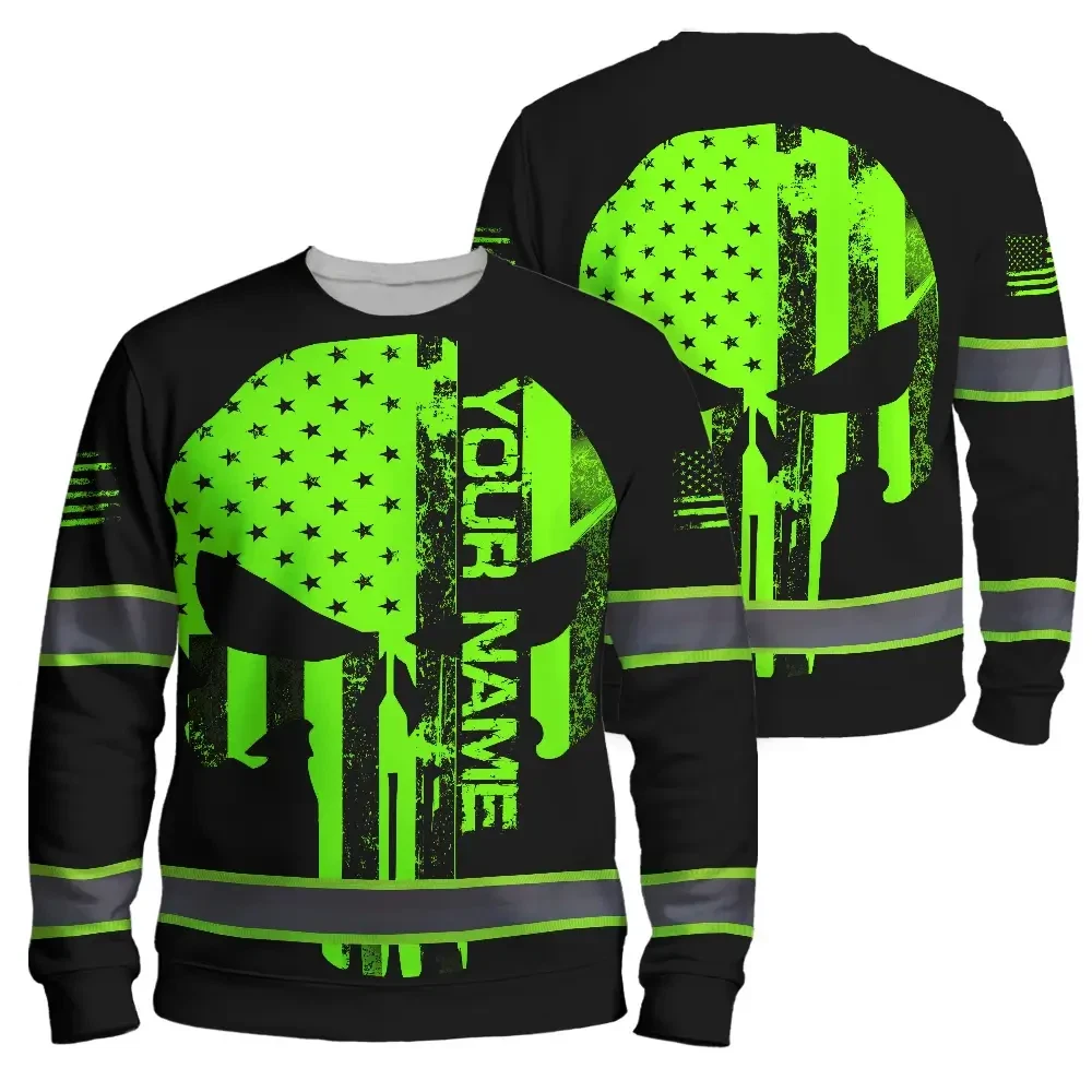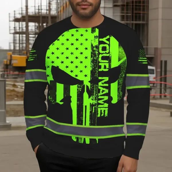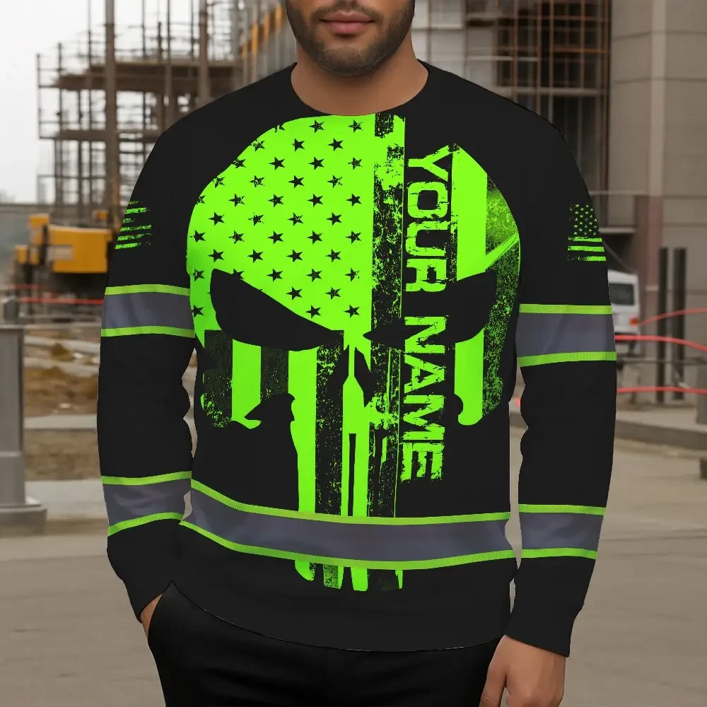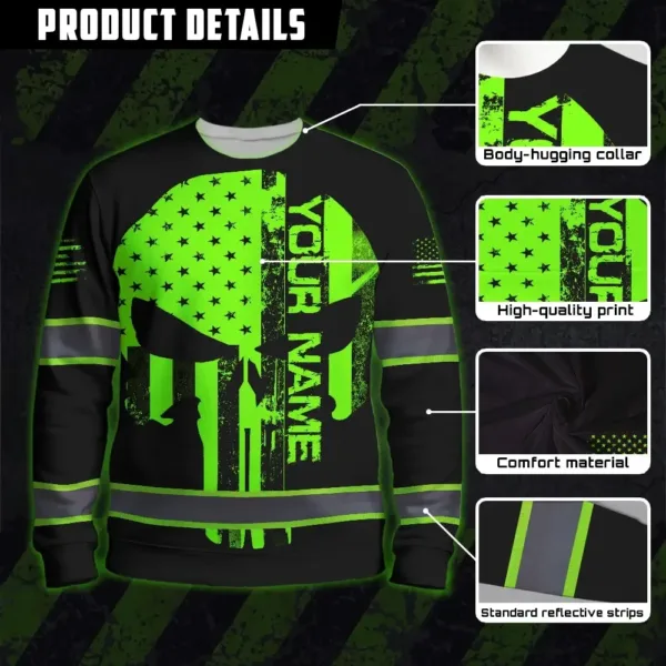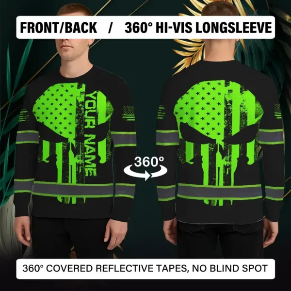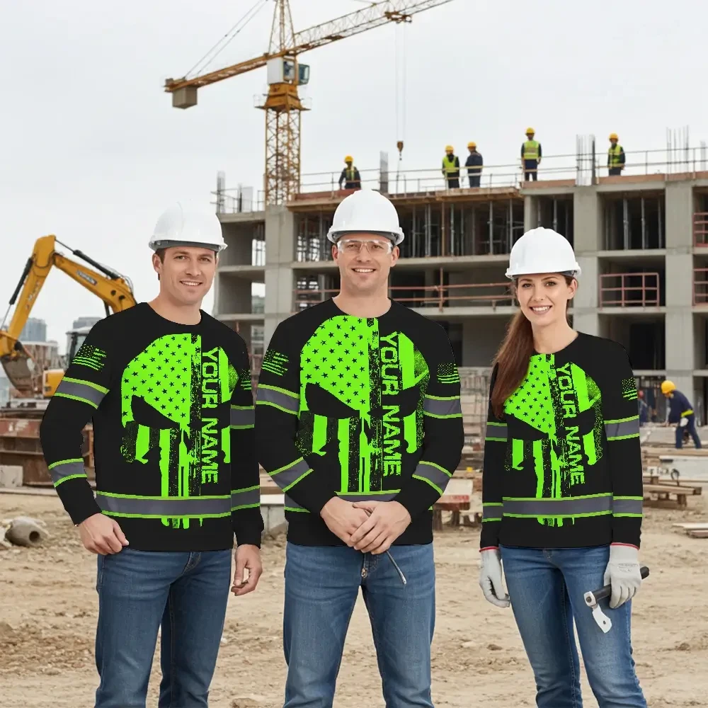 Hi Vis Long Sleeve Skull US Flag Neon Purple Reflective Custom Name Safety Workwear For Workers, Skull Lovers