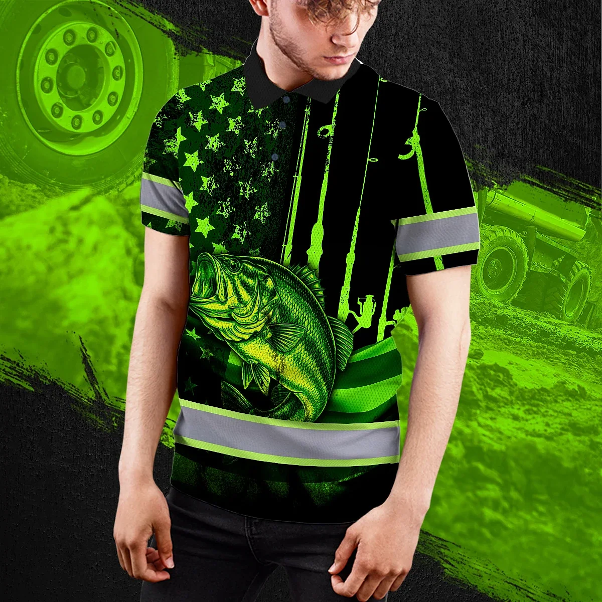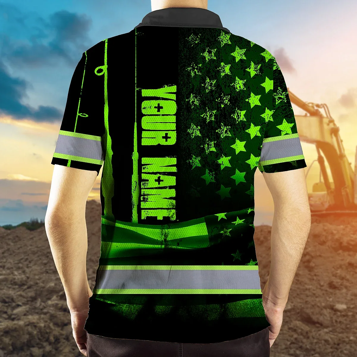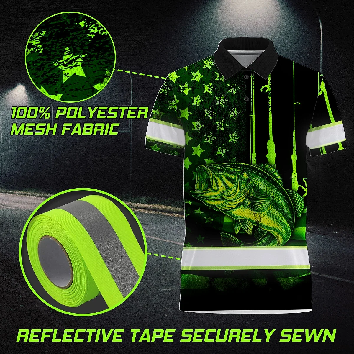 Hi Vis Polo Shirt Reflective Fishing US Flag Custom Name Safety Workwear For Fishing Lovers Workers, Runners, Cyclists, Trucker, Operator, Patriotic