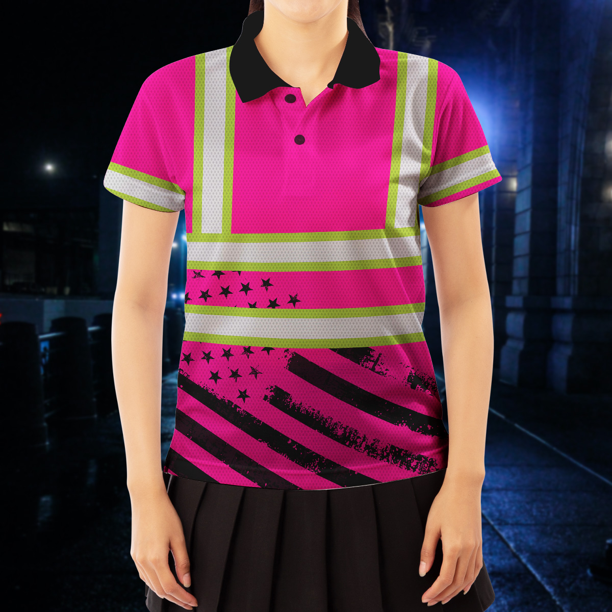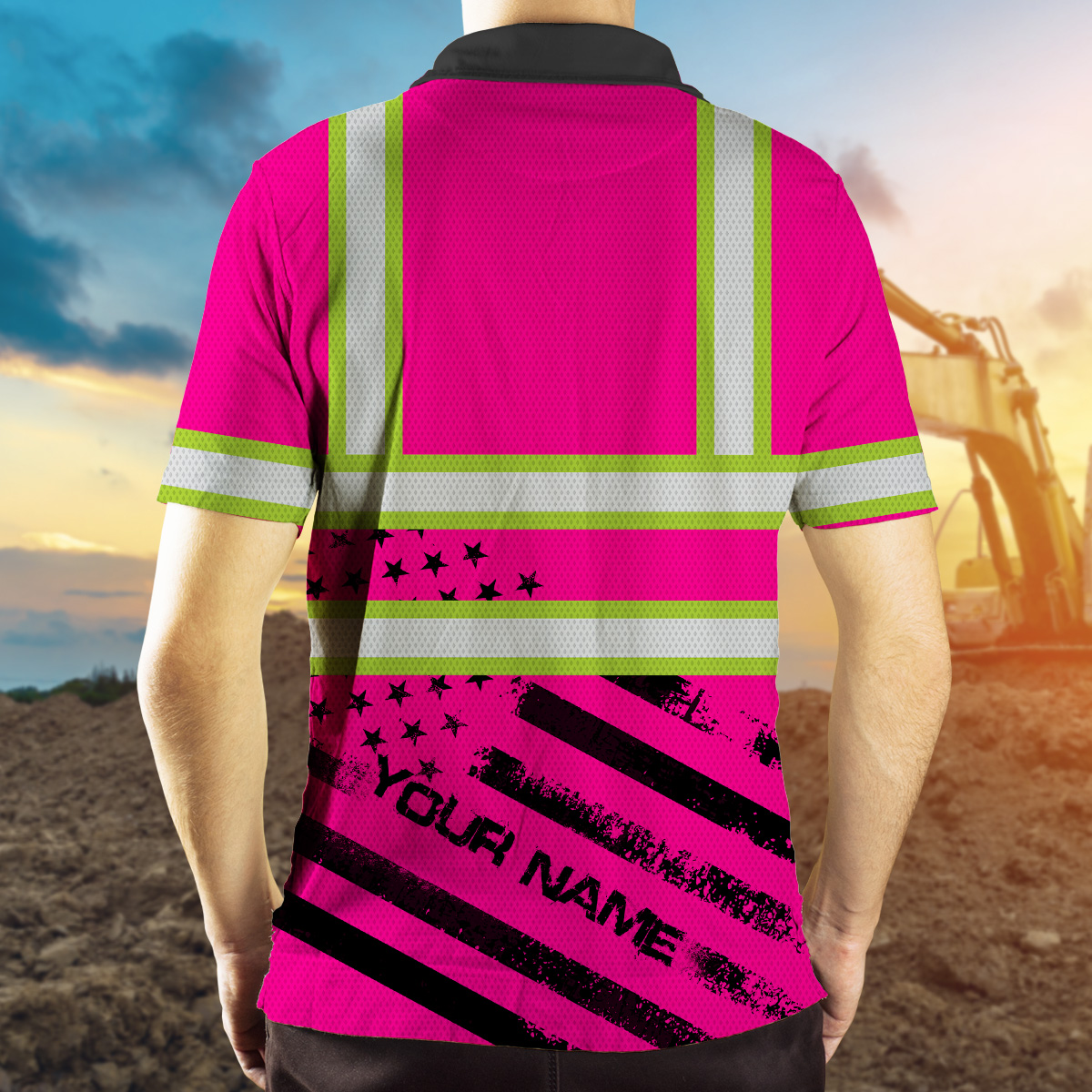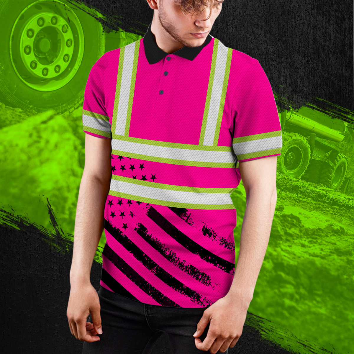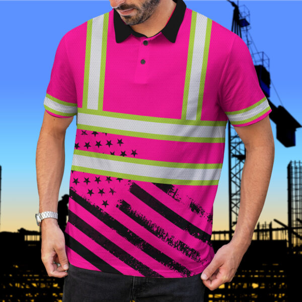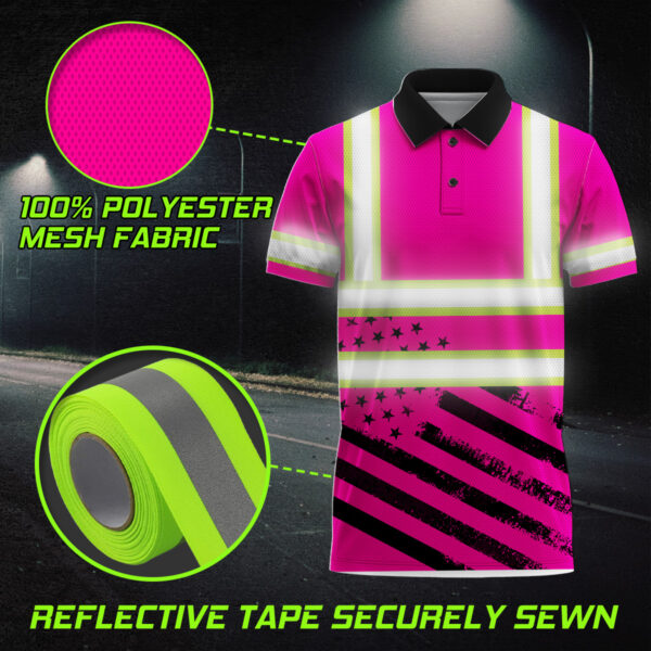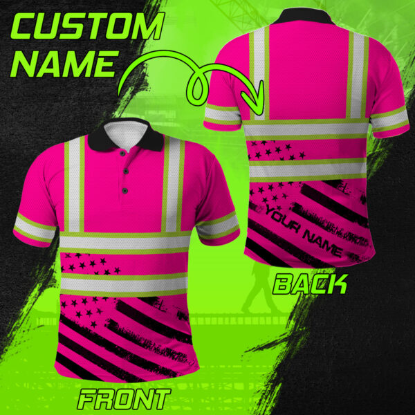 Hi Vis Polo Shirt Reflective Pink Neon US Flag Custom Name Safety Workwear For Patriotic