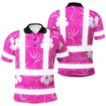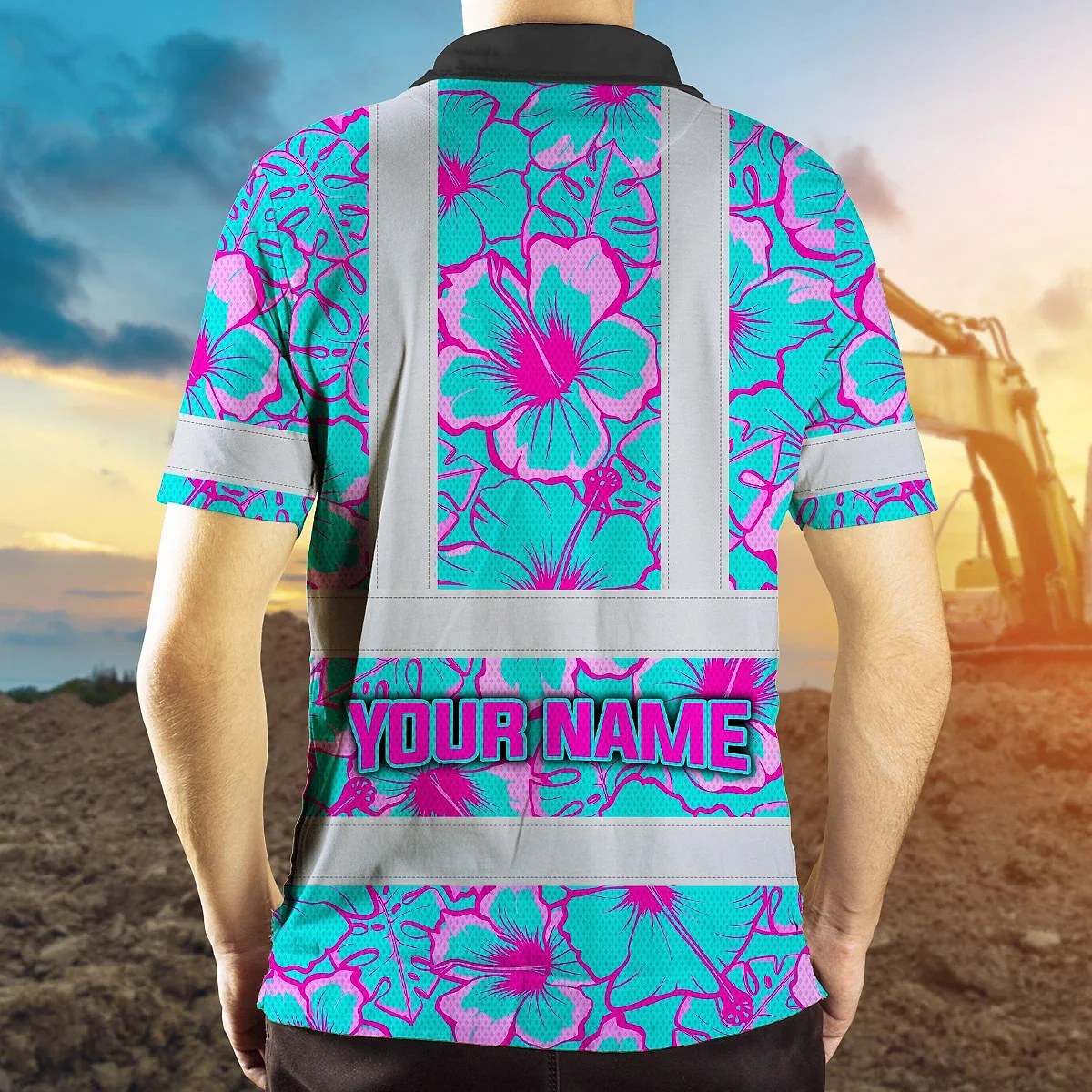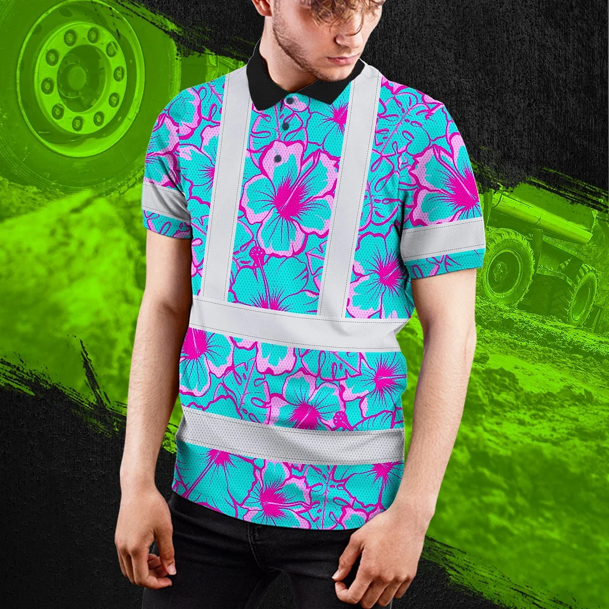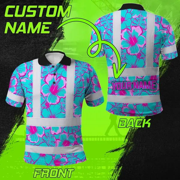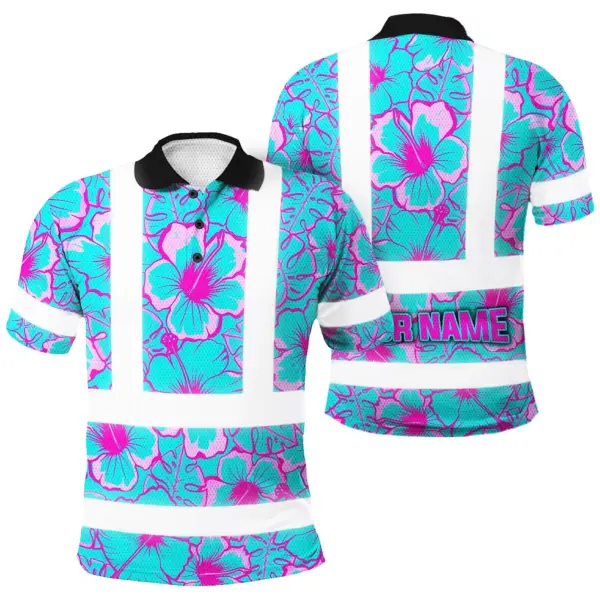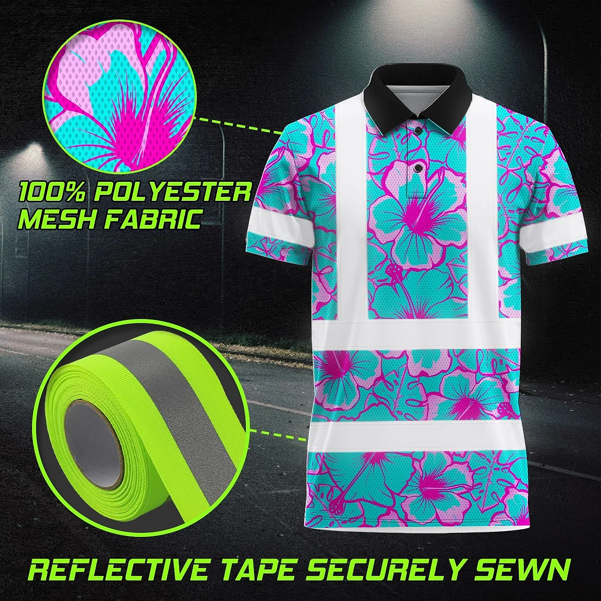 Hi Vis Polo Shirt Reflective Tapes Blue Neon And Pink Flowers Custom Name Safety Workwear For Workers, Truckers, Operators