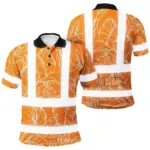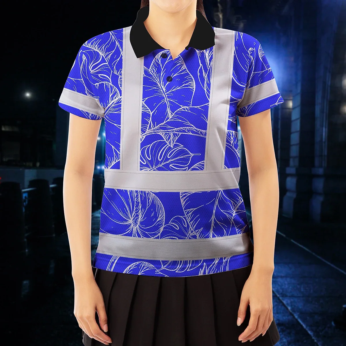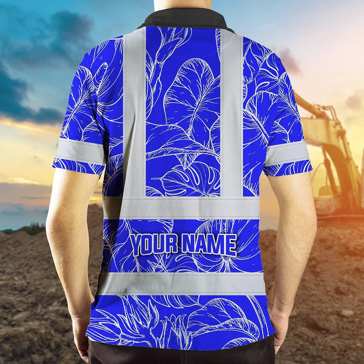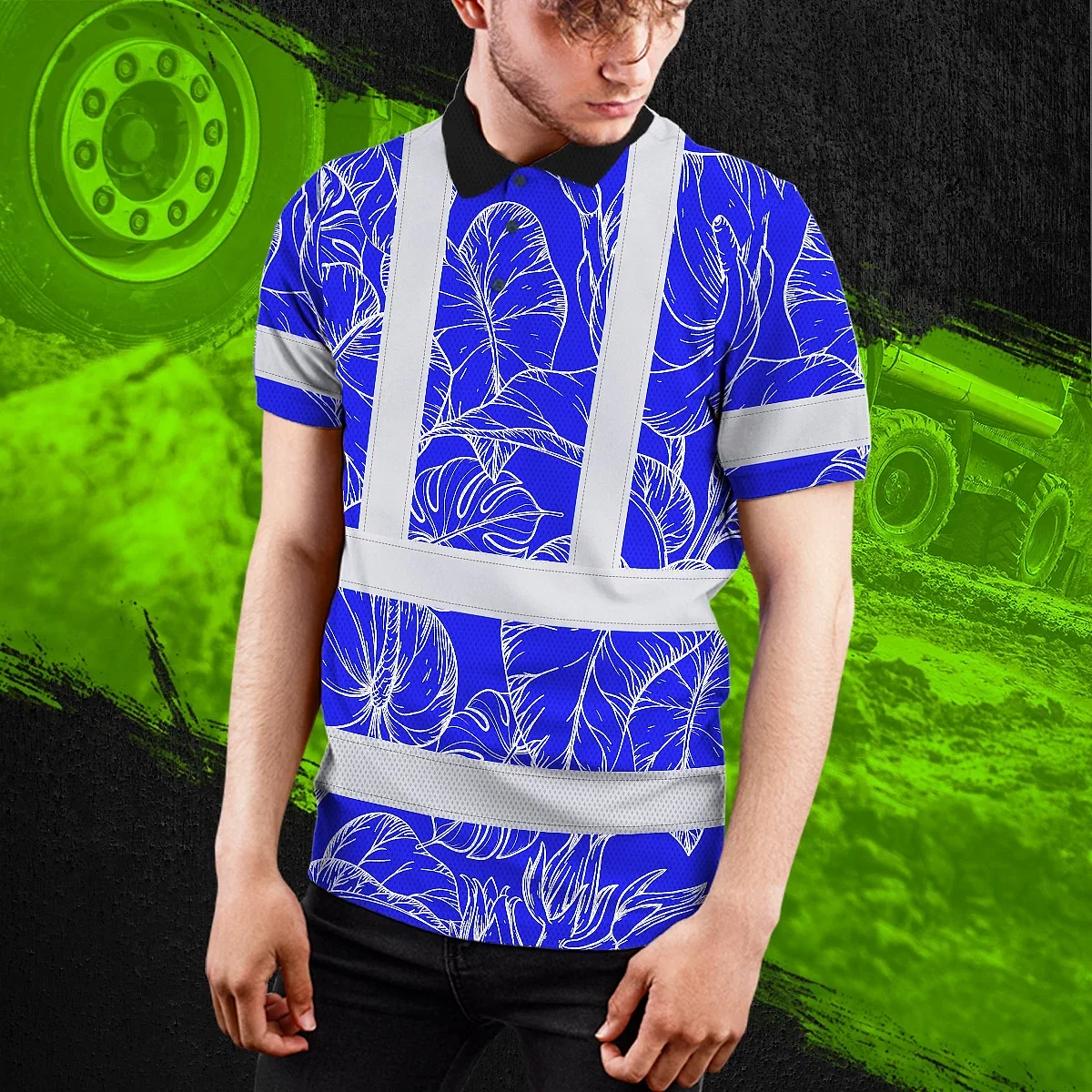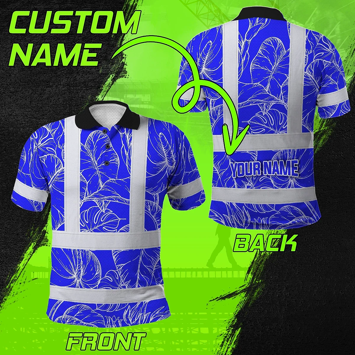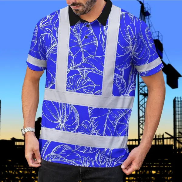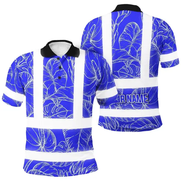 Hi Vis Polo Shirt Reflective Tapes Blue Neon Flowers Custom Name Safety Workwear For Workers, Truckers, Operators