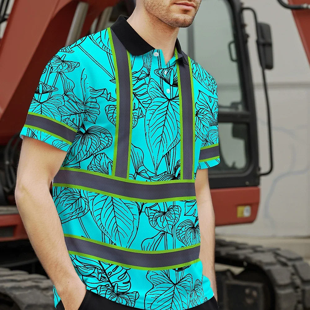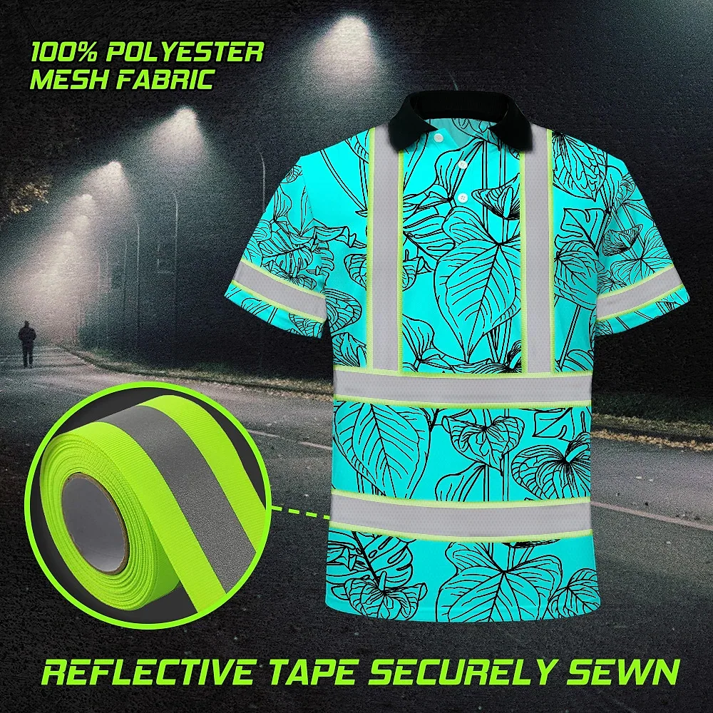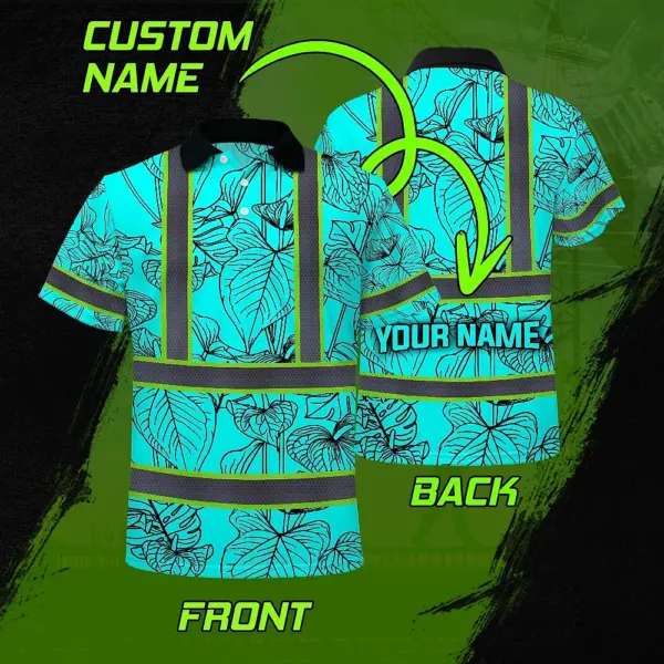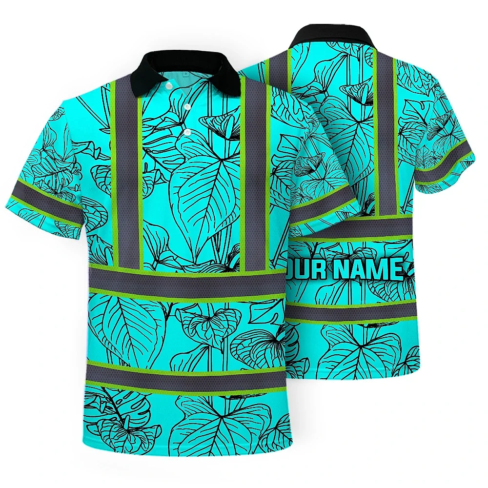 Hi Vis Polo Shirt Reflective Tapes Blue Neon Flowers Custom Name Safety Workwear For Workers, Truckers, Operators