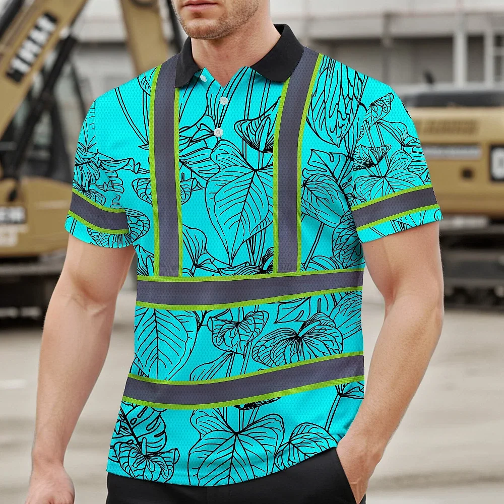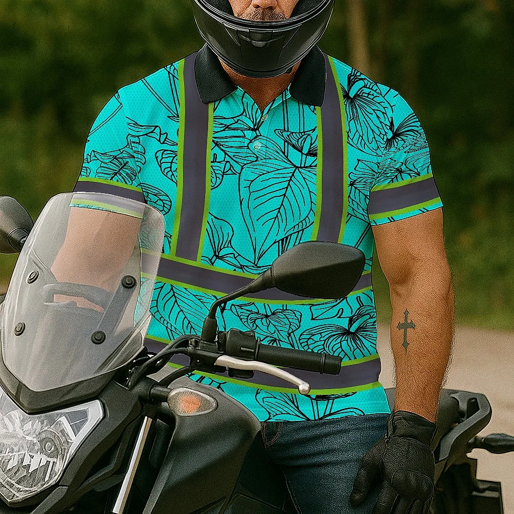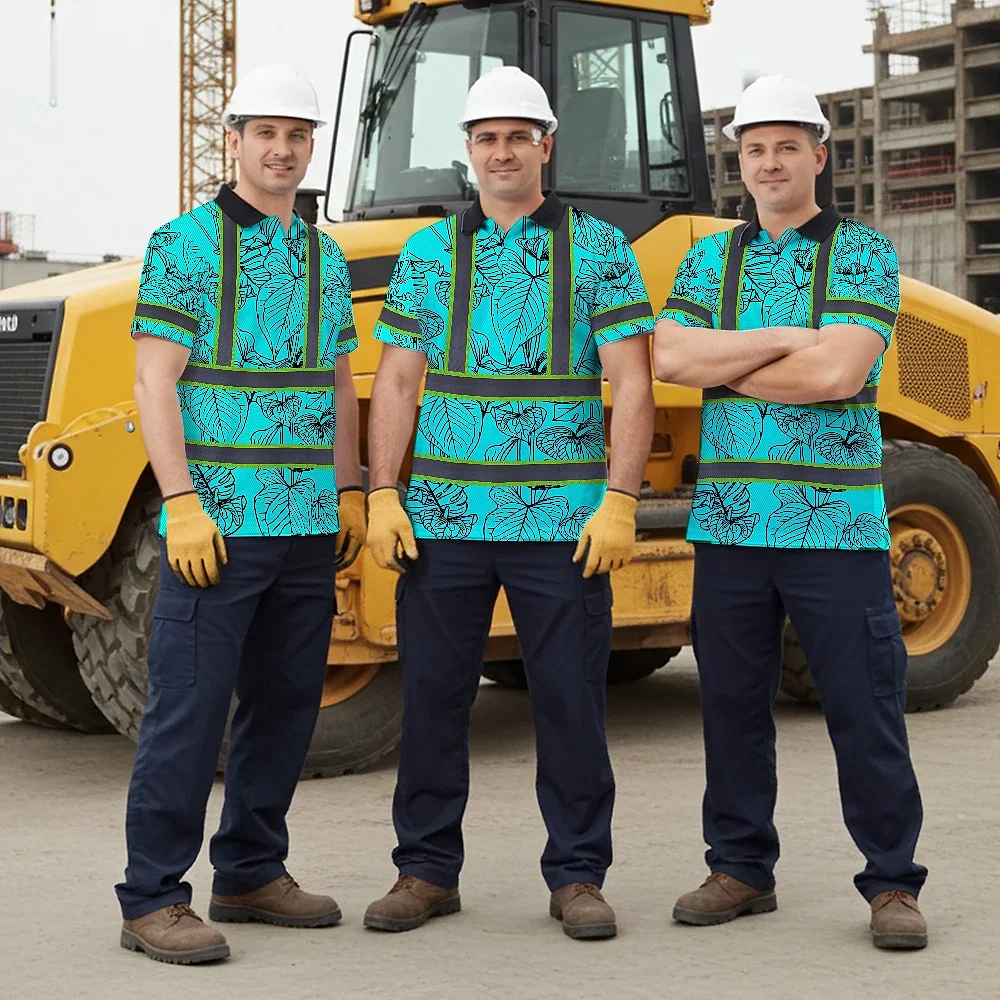 Hi Vis Polo Shirt Reflective Tapes Blue Neon Flowers Custom Name Safety Workwear For Workers, Truckers, Operators
