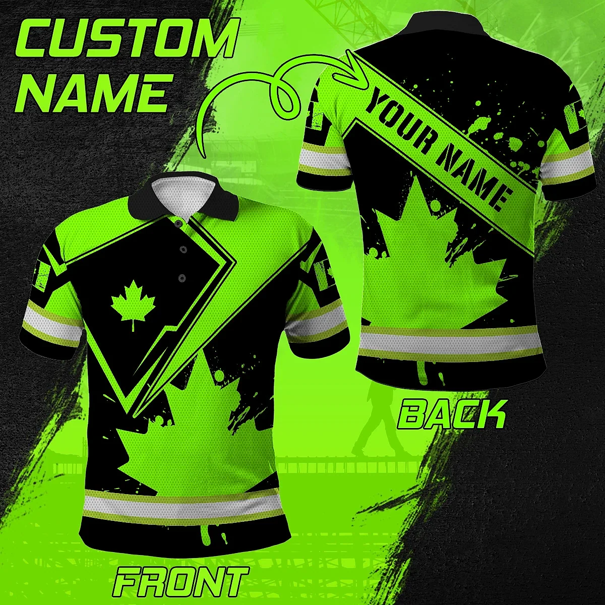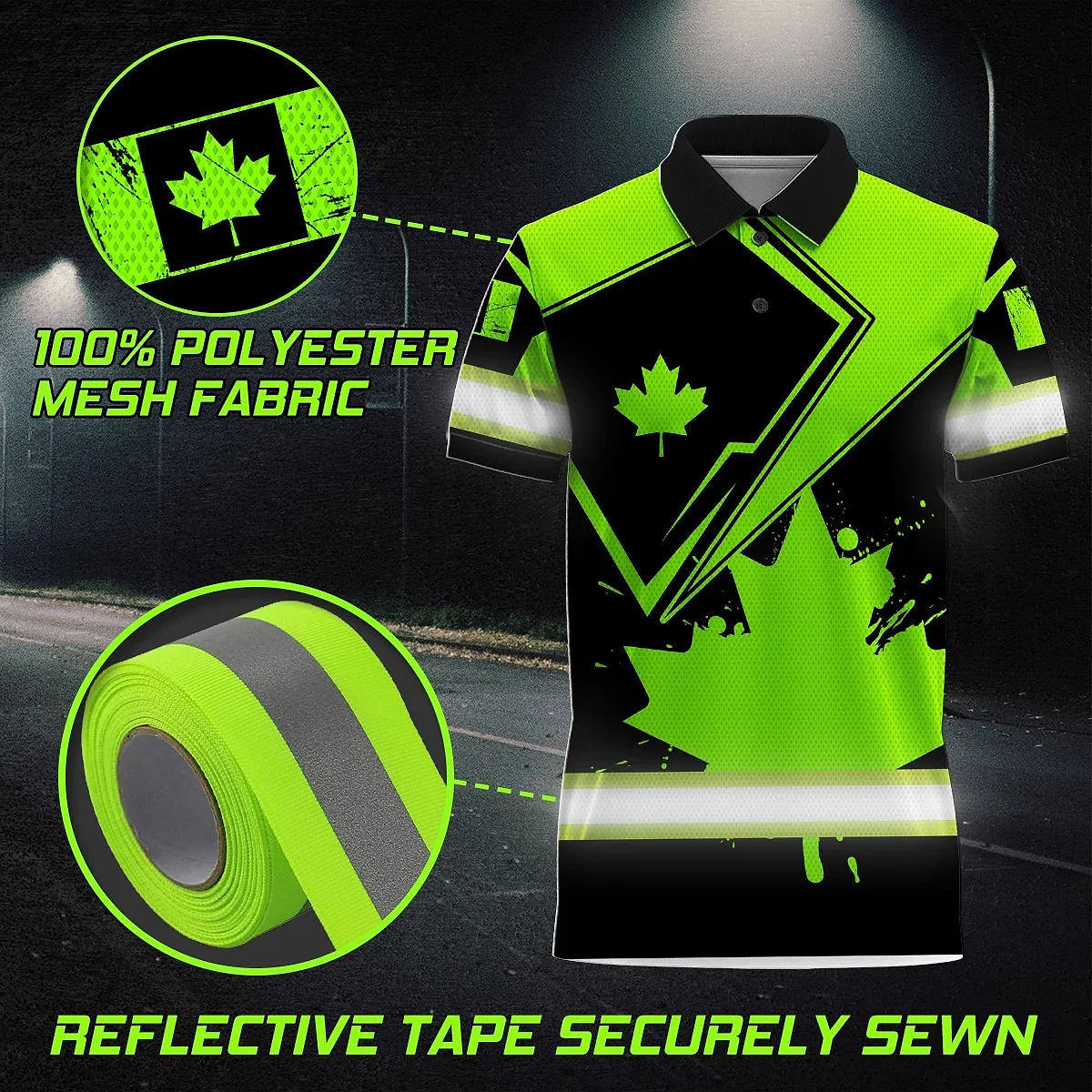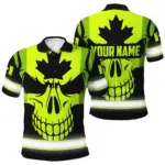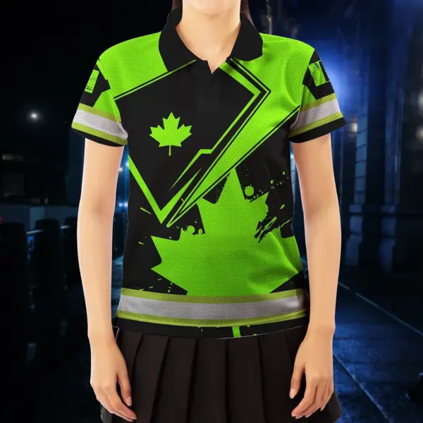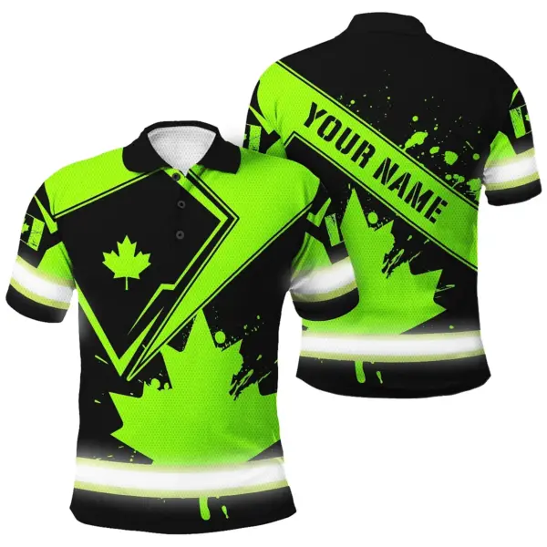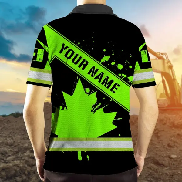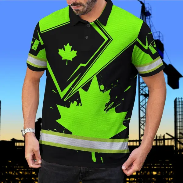 Hi Vis Polo Shirt Reflective Tapes Green And Black Paint Flakes Canada Flag Custom Name Safety Workwear For Worker, Operator, Patriotic