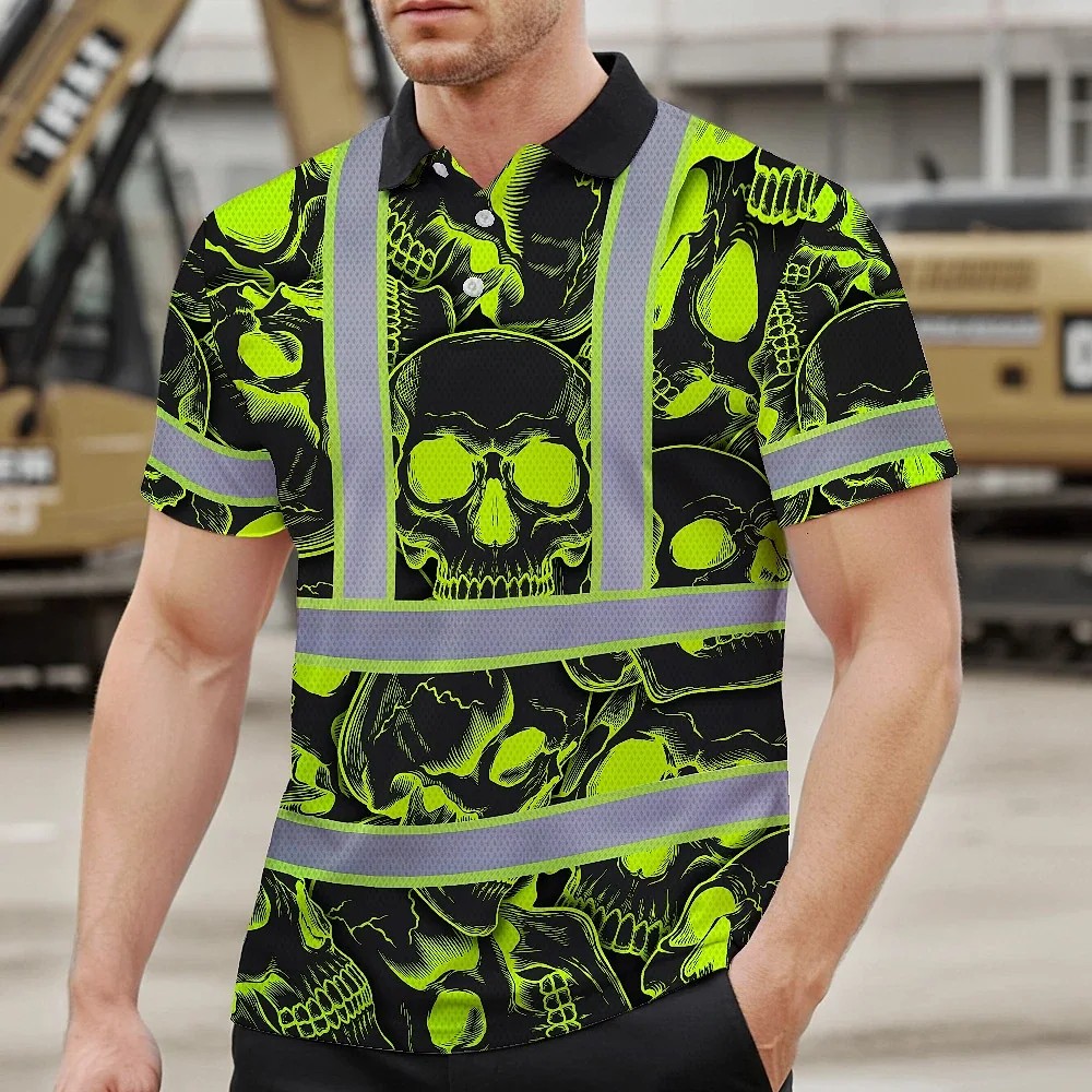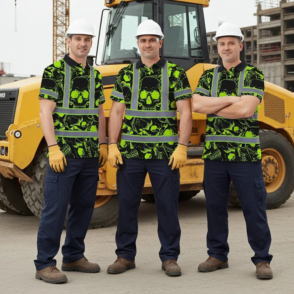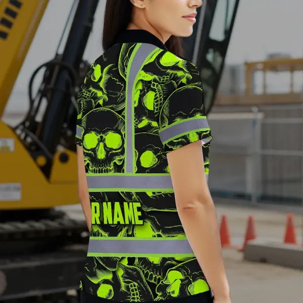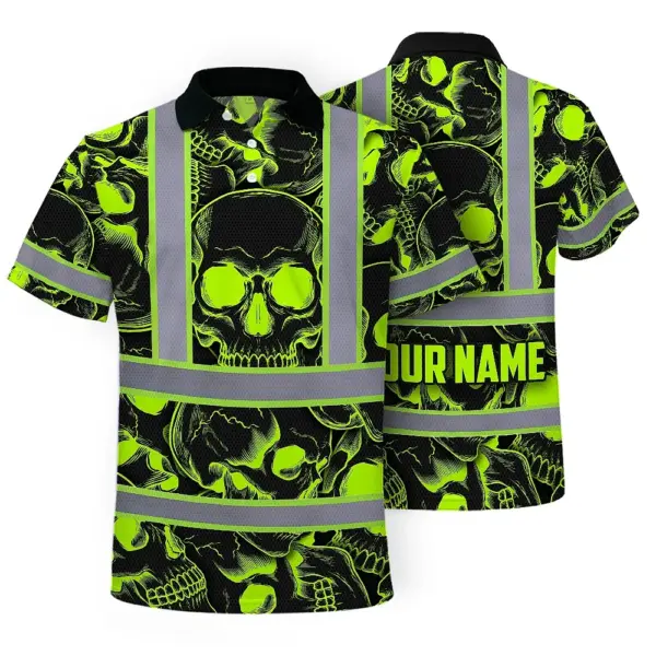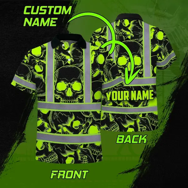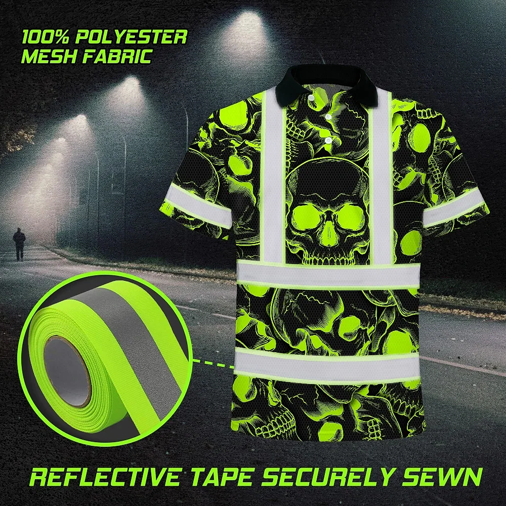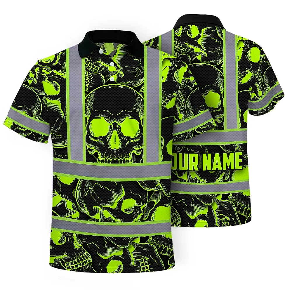 Hi Vis Polo Shirt Reflective Tapes Green Neon Black Skull Custom Name Safety Workwear For Workers, Truckers, Operators