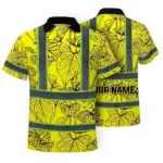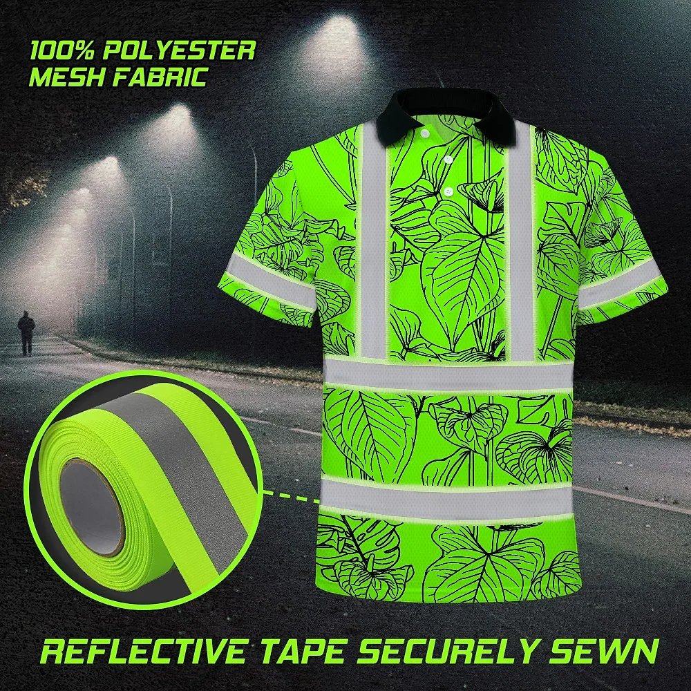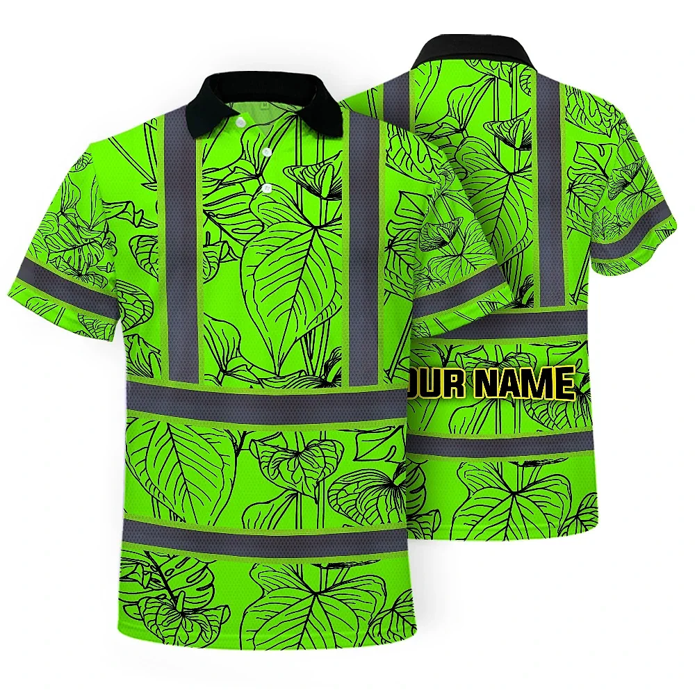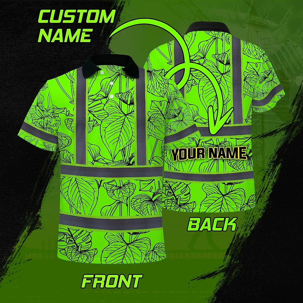 Hi Vis Polo Shirt Reflective Tapes Green Neon Flowers Custom Name Safety Workwear For Workers, Truckers, Operators