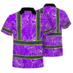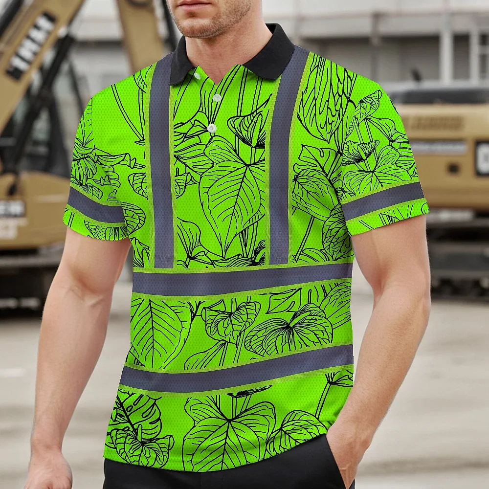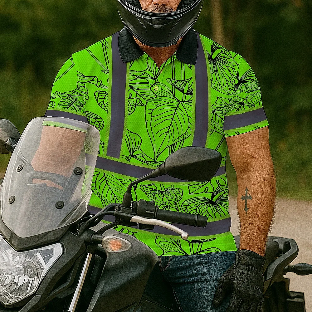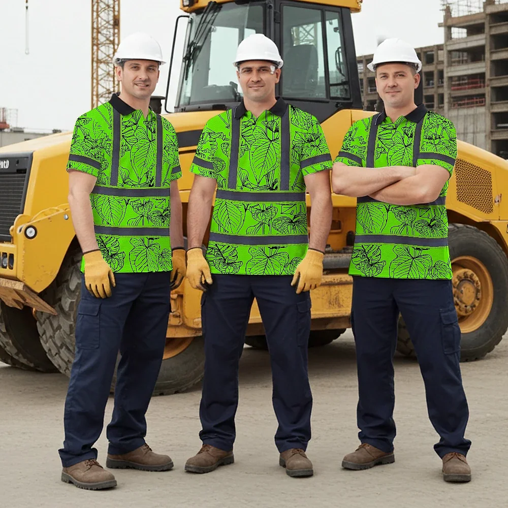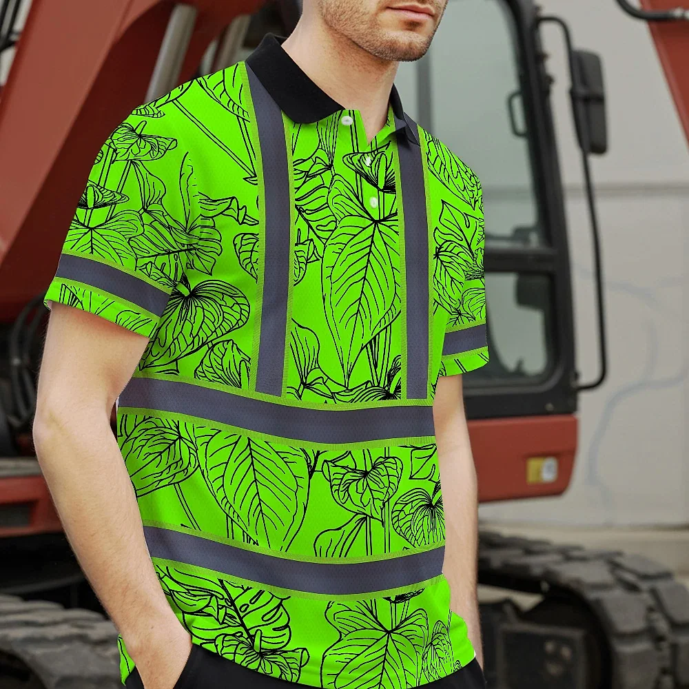 Hi Vis Polo Shirt Reflective Tapes Green Neon Flowers Custom Name Safety Workwear For Workers, Truckers, Operators