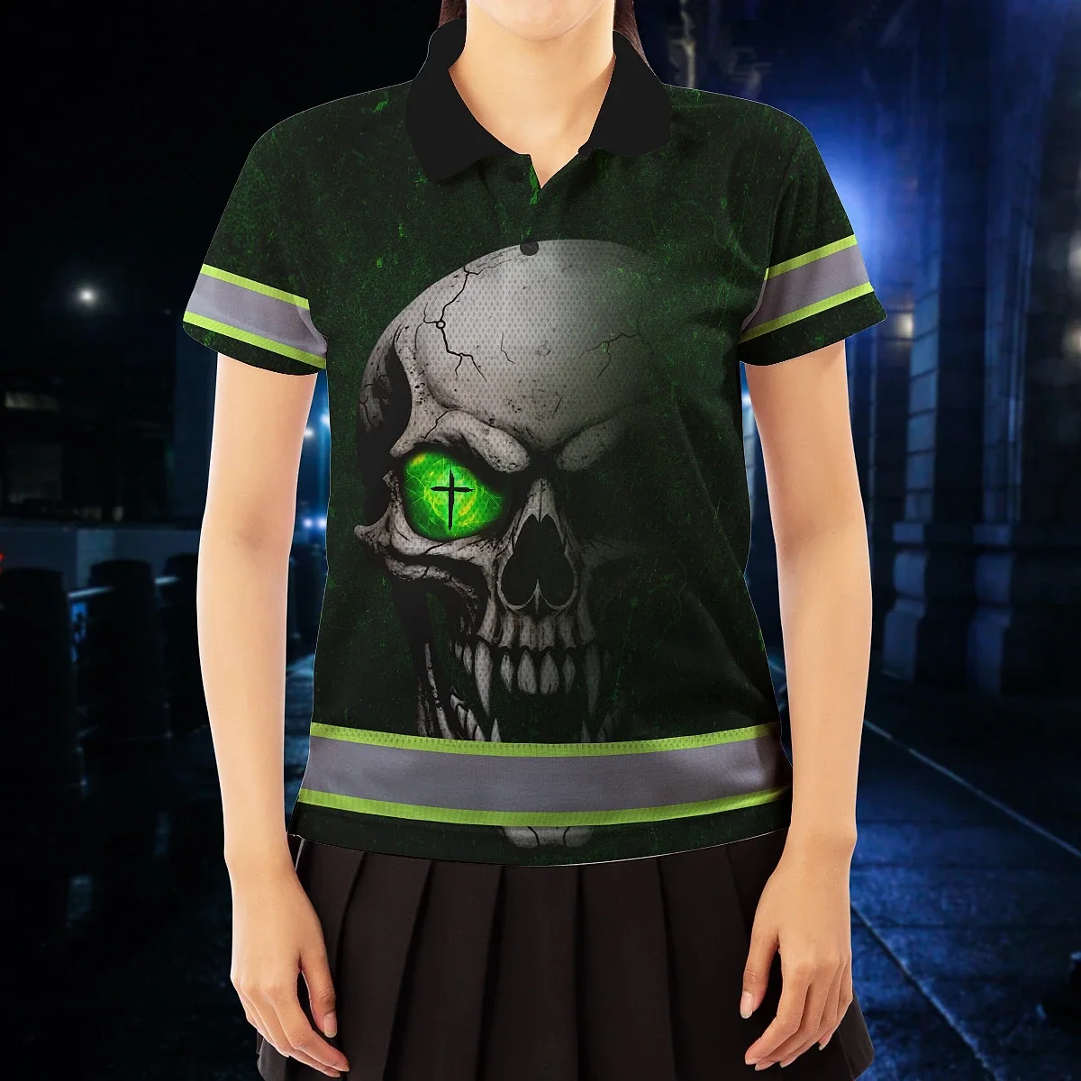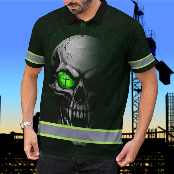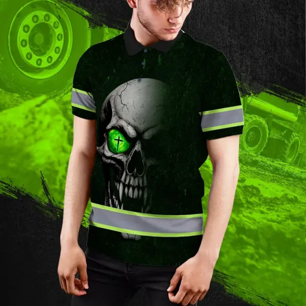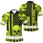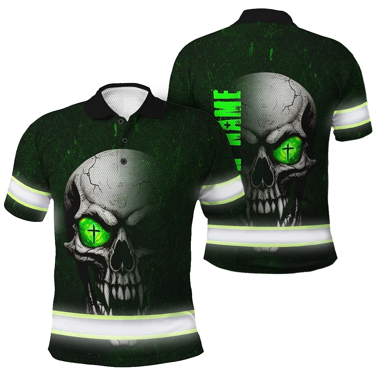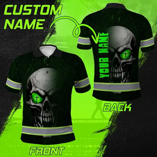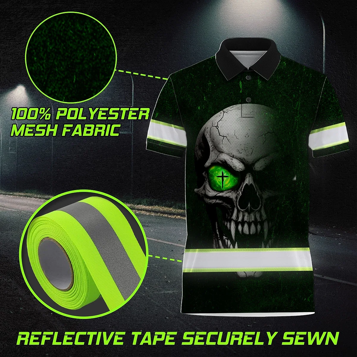 Hi Vis Polo Shirt Reflective Tapes Green Neon Light Skull Custom Name Safety Workwear For Workers, Truckers, Operators