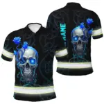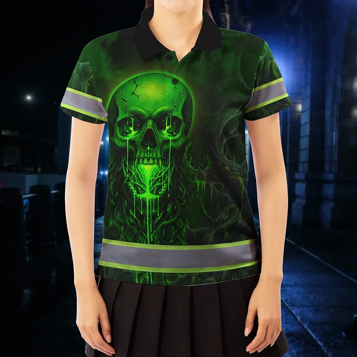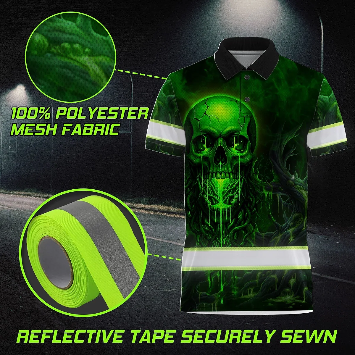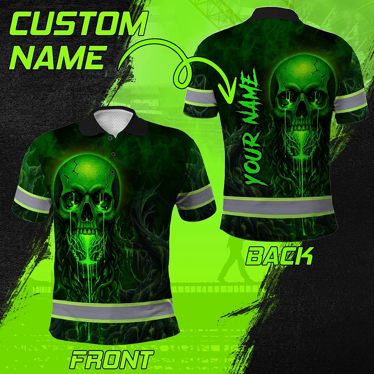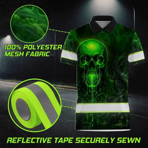 Hi Vis Polo Shirt Reflective Tapes Green Neon Skull 3 Custom Name Safety Workwear For Workers, Truckers, Operators