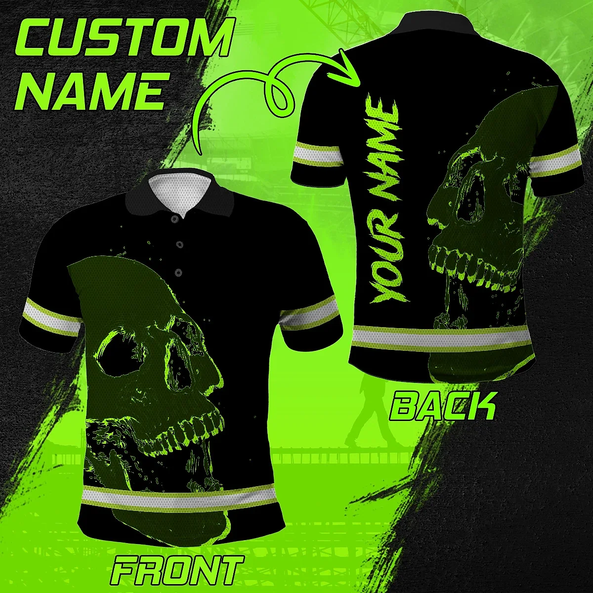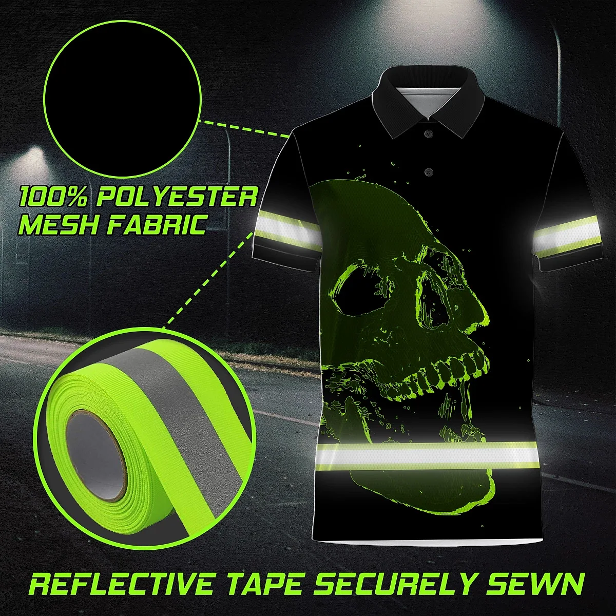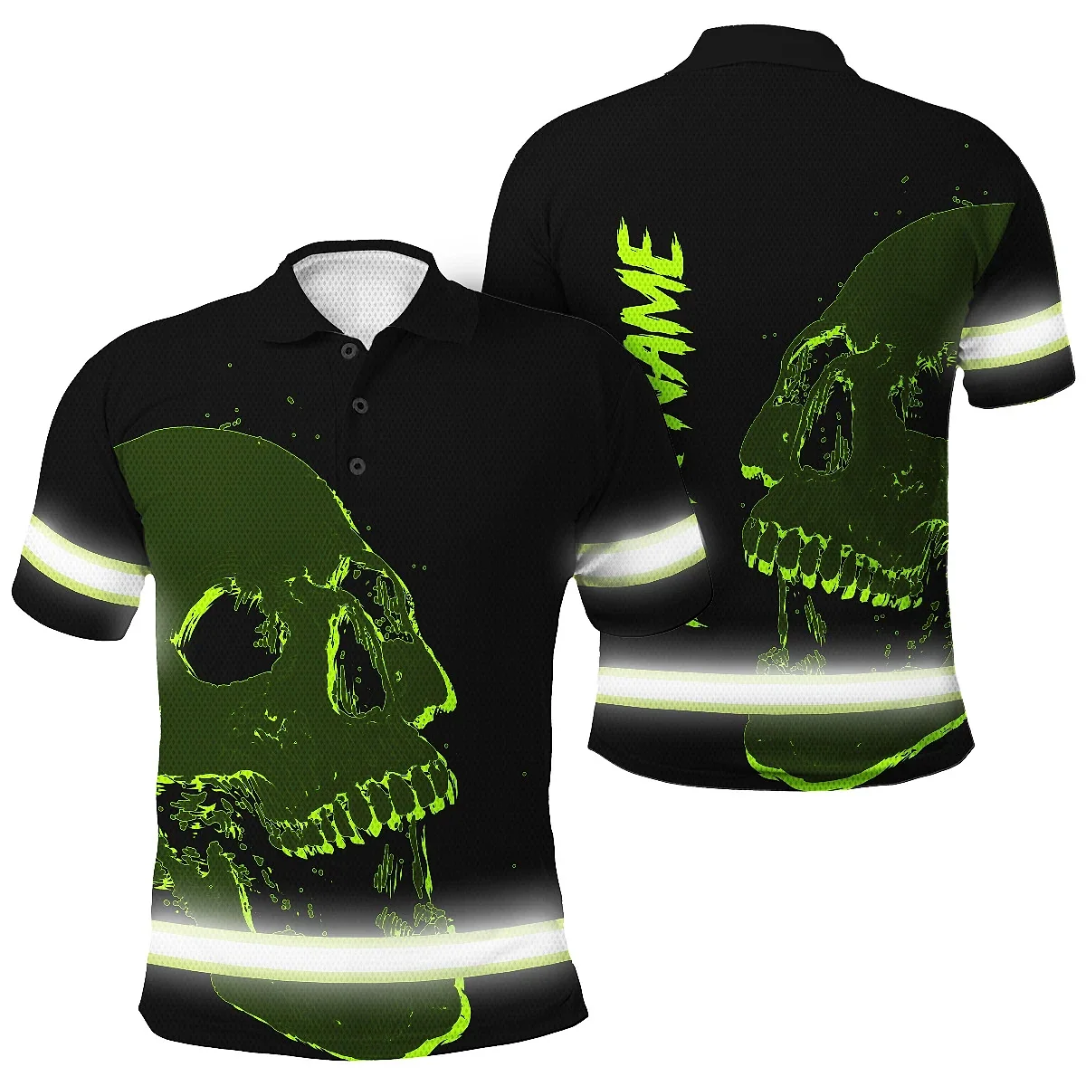 Hi Vis Polo Shirt Reflective Tapes Green Neon Skull Custom Name Safety Workwear For Workers, Runners, Skull Lover